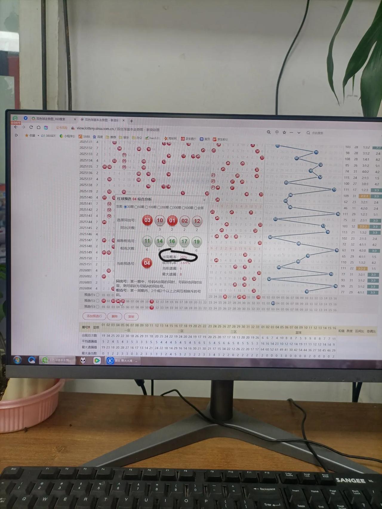 双色球别乱买了,只要懂门道,中大奖机率将会大幅提升。今天我去中国体育彩票门店里转了一圈,看到挨墙边的地方摆放着一台电脑,我上去前看,电脑上显示着双色球走势图,在下方的预选栏中,随意选一个红球,立马弹出红球预选对话框,框内有显示该红球的出现概率,我不禁想只要选出出现概率前六高的红球作为一注,那不是离中大奖就不远了吗?