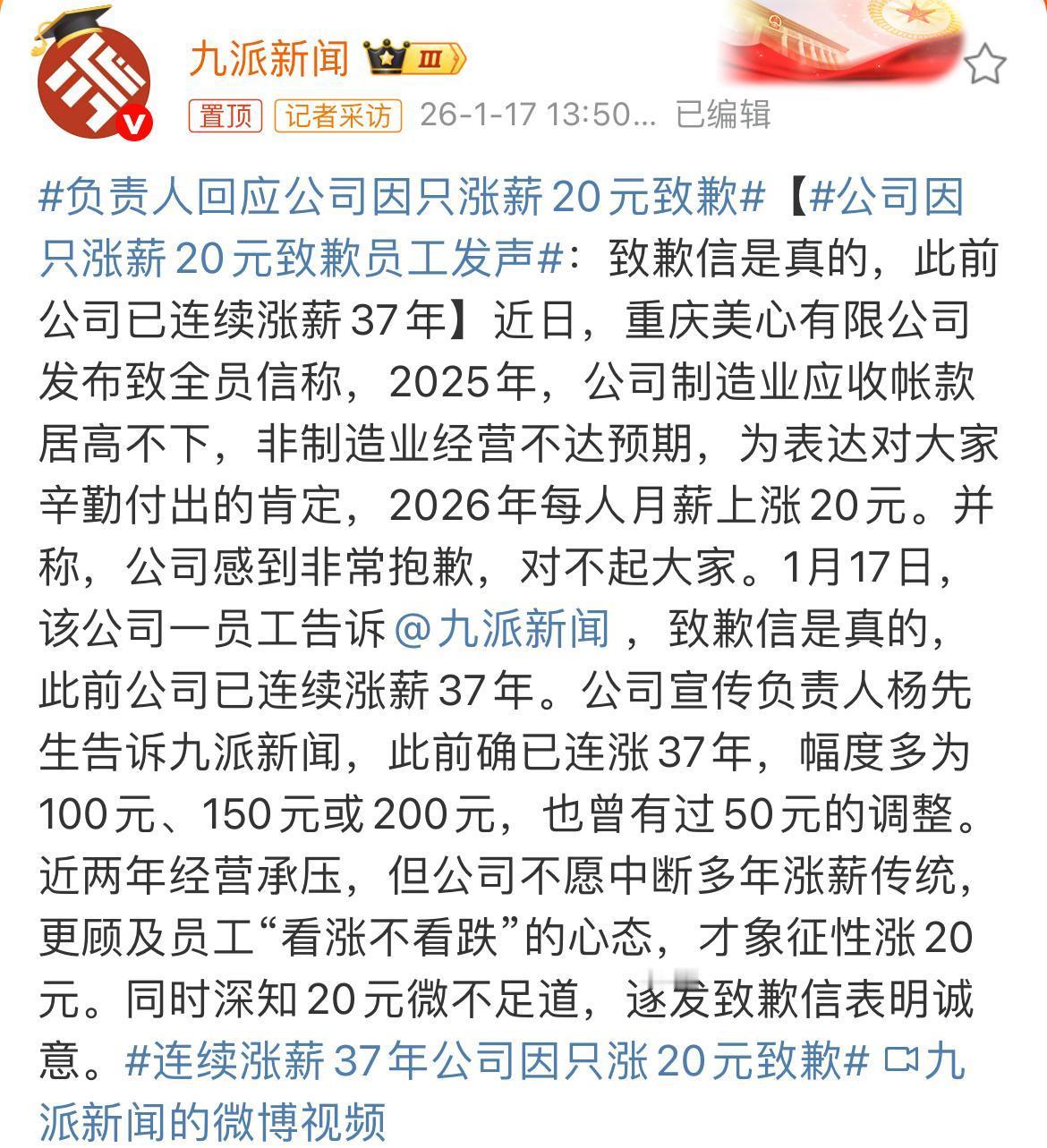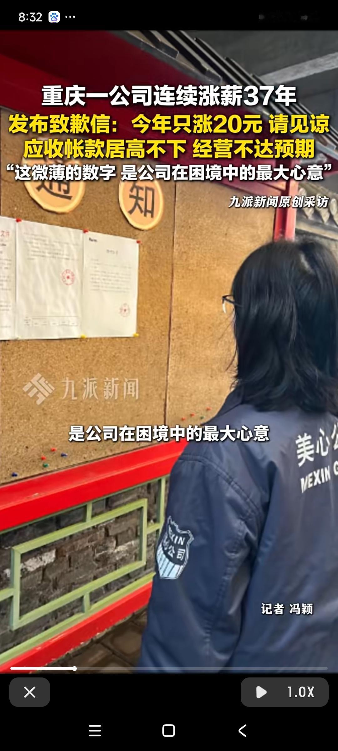 刷到重庆那家公司 工资涨20块还发道歉信的新闻, 我直接哭出了眼泪。 人家公司说“20块微不足道,对不起大家”,再看看自己工资五年涨5块,突然觉得自己活得还不如这20块![泣不成声] 老板总说“今年行情不好,没降薪就不错了”,我也只能点头附和!可看看人家,哪怕再难,也硬撑着37年不间断涨薪,哪怕只涨20元,也要给员工一个交代。 我算了算,按他们每年涨100块的话,37年就是3700块,以我这5年涨5块的速度,得干到猴年马月才能追上? 公司员工工资 涨工资
