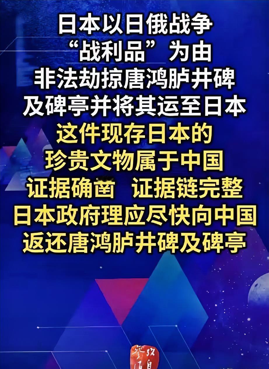 我们对日本正在进入了下一个阶段! 据参考消息的报道,唐鸿胪井碑被日本当作日俄战争的“战利品”抢走一百多年,如今终于被摆上台面:证据确凿,必须归还。 我们对日本的态度,正从过去的“隐忍”转向“主动”。以前,我们忙着发展,谈着合作,很多事都按下不表;现在,我们开始理直气壮地索要文物、讨回公道 这可不是一句简单的“讨公道”,背后藏着的是铁打的事实和民族的尊严。可能有人还不清楚这唐鸿胪井碑到底是什么宝贝,说出来你可能会震惊,这碑可是唐朝开元二年留下的国之重器,距今已经一千三百多年了。当年唐朝官员崔忻出使辽东,册封渤海郡王,完成了疆域统一的大事,特意凿井刻石纪念,那29个字的碑文,可是实打实的历史见证,连《旧唐书》《新唐书》都有明确记载。 更让人愤慨的是日本掠夺的过程。1905年日俄战争后,日军占领旅顺,早就盯上这块碑的日本海军,派汉学家秘密考察后,直接把重达9.5吨的碑和保护它的石亭当作“战利品”运到了东京。他们自己的档案里明明白白写着“唐碑亭送至宫中”,还画了详细的碑石图纸,这种把侵略掠夺当“功绩”记录的行为,简直是对历史的公然亵渎。一百多年来,这块碑被藏在日本宫城,我们的文物,却成了别人炫耀侵略的“展品”。 过去我们之所以没强硬索要,不是忘了这笔账。那时候国家正处在发展的关键期,集中精力搞建设、促经济,想着以和为贵,希望通过合作化解历史恩怨。可这种“隐忍”换来了什么?是日本对历史罪行的模糊淡化,是对掠夺文物的拒不归还,甚至有部分势力还在美化侵略历史。就像唐鸿胪井碑,明明证据链完整到无可辩驳,日本却始终装聋作哑,既不承认掠夺事实,也不愿启动返还程序。 现在我们主动出击,根本原因是国家强大了,有底气维护自己的合法权益。这些年,中国在文物追索领域已经积累了太多成功经验,从英国追索68件流失文物花了25年,到从美国、意大利追回上千件文物,每一次成功都证明,只要证据确凿、态度坚决,历史遗留问题总能得到解决。更重要的是,国际社会已经形成共识,掠夺来的文物必须归还原属国,法国向非洲归还文物、德国返还殖民时期掠夺的珍宝,这些都说明正义可能会迟到,但绝不会缺席。 日本有些势力一直抱着侥幸心理,觉得时间久了就能把掠夺来的文物“合法化”。可他们忘了,文物承载的是一个国家的历史记忆,唐鸿胪井碑上的每一个字,都记录着中国古代的疆域版图和民族融合,这不是日本一句“战利品”就能抹去的。更讽刺的是,日本国内不少有识之士都站出来呼吁归还,他们直言不归还文物就是没有真正反省战争罪行,是历史“负资产”。连日本民众都明白的道理,日本政府却揣着明白装糊涂,这种自欺欺人的做法,只会让自己在国际社会越来越被动。 其实我们索要的从来不止是一块碑,而是历史的真相和应有的尊重。一个不敢正视历史、不愿承担责任的国家,永远得不到真正的信任。中国现在的“主动”,不是要故意为难日本,而是要推动国际社会树立正确的历史观,让掠夺文物的行为再也没有生存的土壤。如果连明确记载的掠夺文物都能被默许占有,那历史的正义何在?那些被侵略国家的尊严何在? 随着中国综合国力的不断提升,我们会越来越多地拿起法律和历史的武器,追回所有被掠夺的文物。这不是挑衅,而是对历史负责、对民族负责。唐鸿胪井碑的追索,只是一个开始,未来还会有更多流失海外的珍宝,在国家的努力下回到故土。 各位读者你们怎么看?欢迎在评论区讨论。日本外交之耻 日本历史欠账 日本归还中国 日本遗失物品 日本唐朝