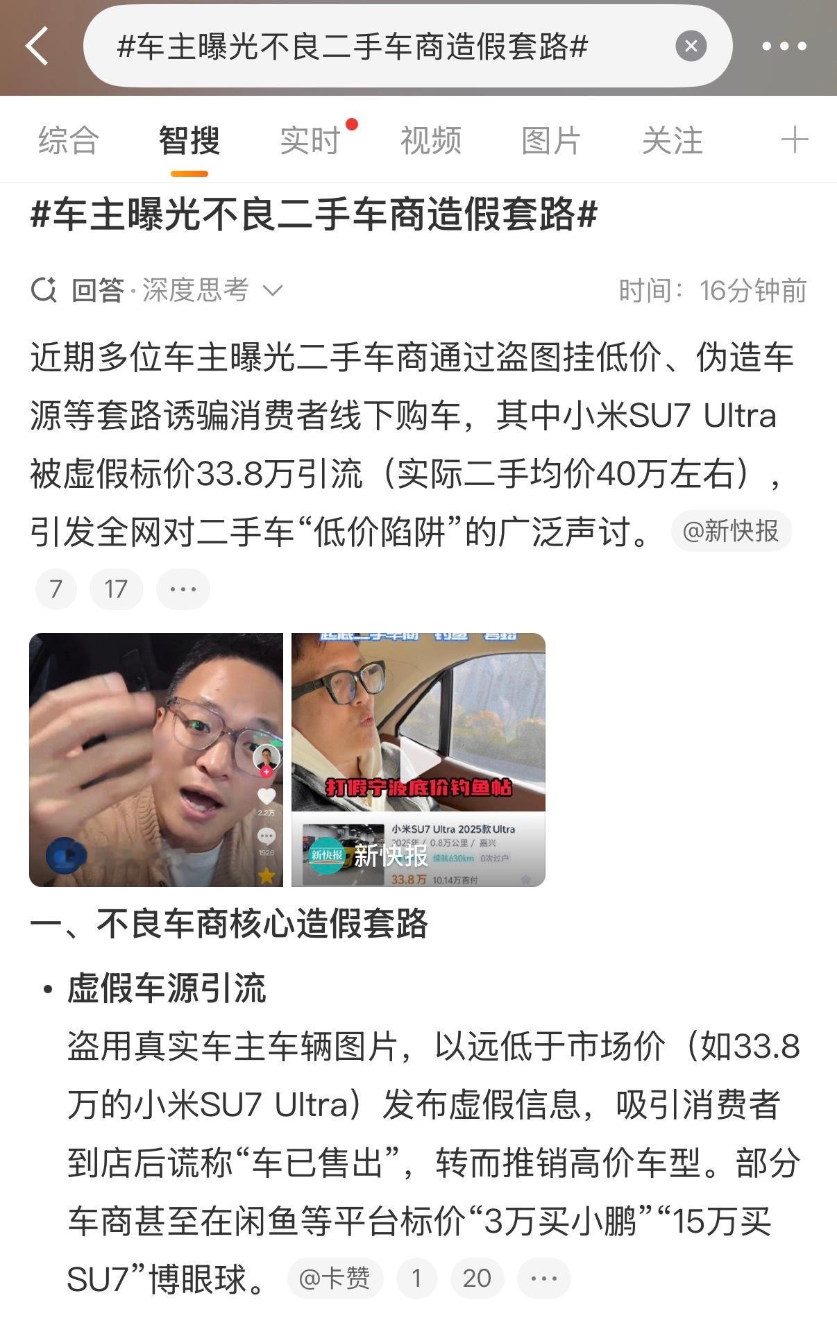 车主曝光不良二手车商造假套路 小米SU7 Ultra二手车钓鱼报价这个我也刷到了,就很离谱,车主一脸懵逼看自己车被二手车商低价挂到网上售卖……这就是典型的低价引流套路。最近网上传小米汽车二手价格崩盘,没人要之类,大概率就是这套路,不少二手车商挂了钓鱼订单,欺骗消费者到线下,制造出二手小米汽车价格低的假象。小米汽车现在量起来了,SU7改款也已经官宣,二手车价格没有之前坚挺是肯定的,但综合来看保值率并不低。新能源车保值率本身就比较一般,再加上二手车价格受车况影响比较大,还是不能以偏概全。我大概筛选看了一下,Ultra的正常市场价40万左右,保值率能到75%,这对50多万售价的新能源车而言已经很不错了。而且也有专业数据支撑,流通协会的数据,小米SU7连续8个月排第一,12月80.1%的保值率大幅领先别的品牌。黑小米用二手车保值率真不是啥明智的选择,反而越描越黑,大家还是理性看待,多关注一些真实车主的出售价格,别被黑心车商的假数据带偏。