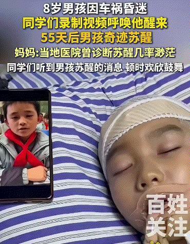 看哭了,湖南长沙,一男孩去年十一月,因车祸昏迷不醒,被送到当地医院救治时,医生也无奈表示,男孩的伤势太重,苏醒几率渺茫。这种情况,可能不少人都会对孩子失去信心,但这个消息并没有让孩子的妈妈打退堂鼓,而是将其转到更好湘雅医院接受治疗。期间,男孩的老师同学也没有闲着,而是全班录制视频鼓励和祝福男孩,妈妈则每天给男孩播放大家的祝福和广播体操乐视频。最终,通过大家的坚持,55天后男孩奇迹苏醒了! 视频显示,孩子住院昏迷期间,妈妈则每天反复在男孩面前,播放同学们发给他的视频音乐等。 起初男孩也是毫无反应,但直到跨年夜听到好朋友分享给他的歌曲时,他居然短暂睁开了眼。之后,再听视频中同学们说的话时,又短暂的做出了回应。 功夫不负有心人,在大家55天的坚持下,男孩苏醒了,且一天比一天的情况好。全班同学得知这个消息时,也是在教室欢呼了起来。 妈妈激动的表示,孩子很坚强,真的挺了过来,终于见到乌云覆的太阳了!非常感谢医护人员和老师同学的帮助! 不得不说,男孩听到同学声音时,嘴角上扬那一下,看哭了!男孩苏醒离不开妈妈的坚持,也小朋友离不开同学们的不断呼唤。而这份同学友谊和师生感情,此时无价了!为大家坚持造就的奇迹点赞! 加油,坚强的小朋友!风雨过后见彩虹,希望你早点好起来,为你送上最真诚的祝福!