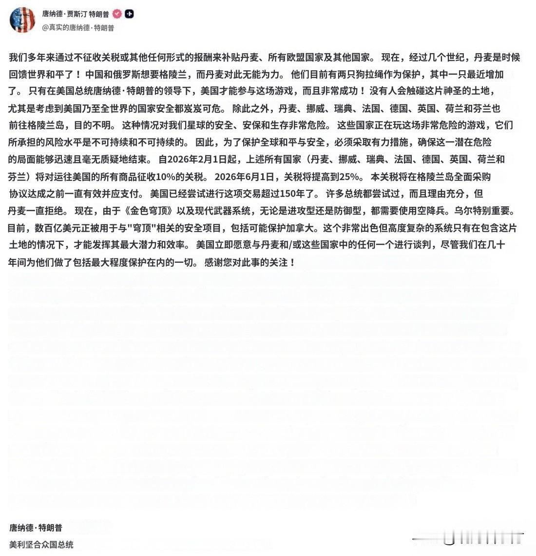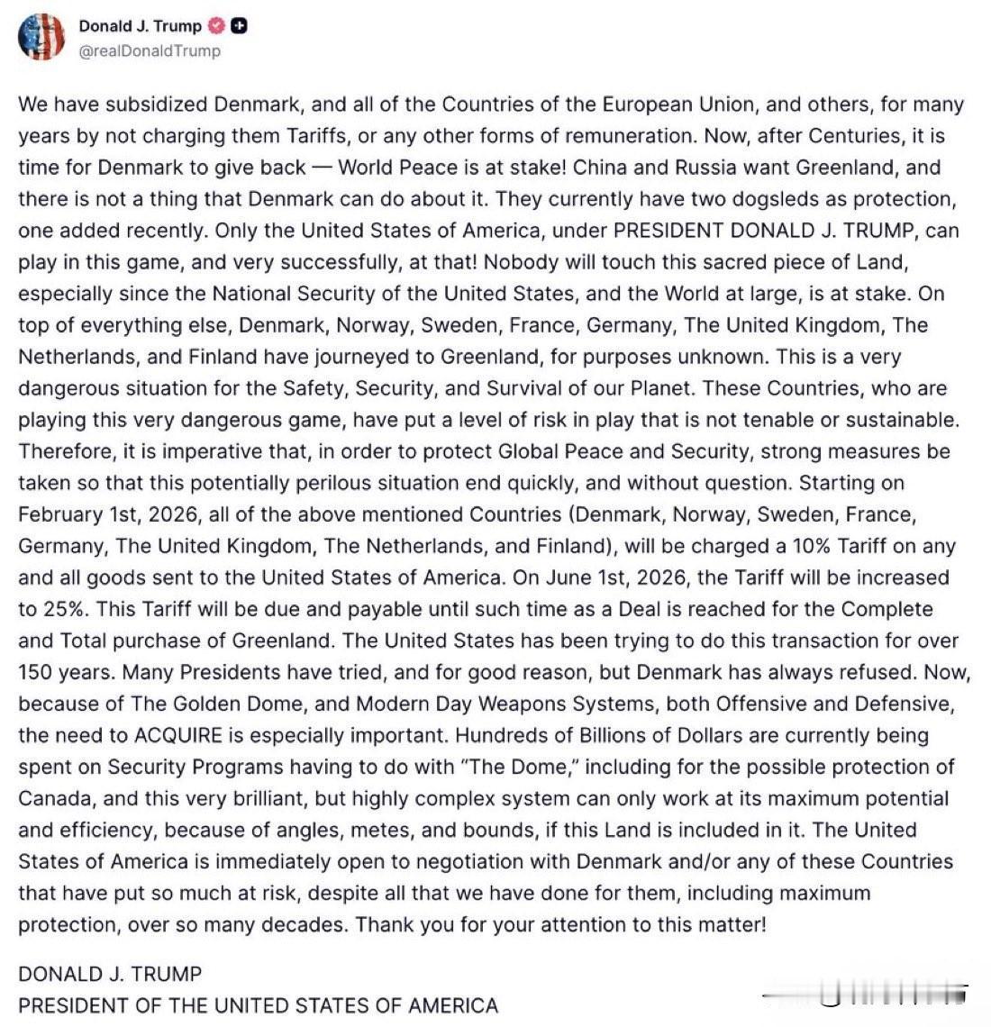 快讯:美国总统特朗普宣布——自2026年2月1日起, 将对 丹麦、 挪威、 瑞典、 法国、 德国、 英国、 荷兰和芬兰运往美国的所有商品征收10%的关税。 2026年6月1日, 关税将提高到25%。 本关税将在格陵兰岛全面购买协议达成之前一直有效并应支付。这些国家派遣军事人员登上了格陵兰岛参加由丹麦组织的军事演习。