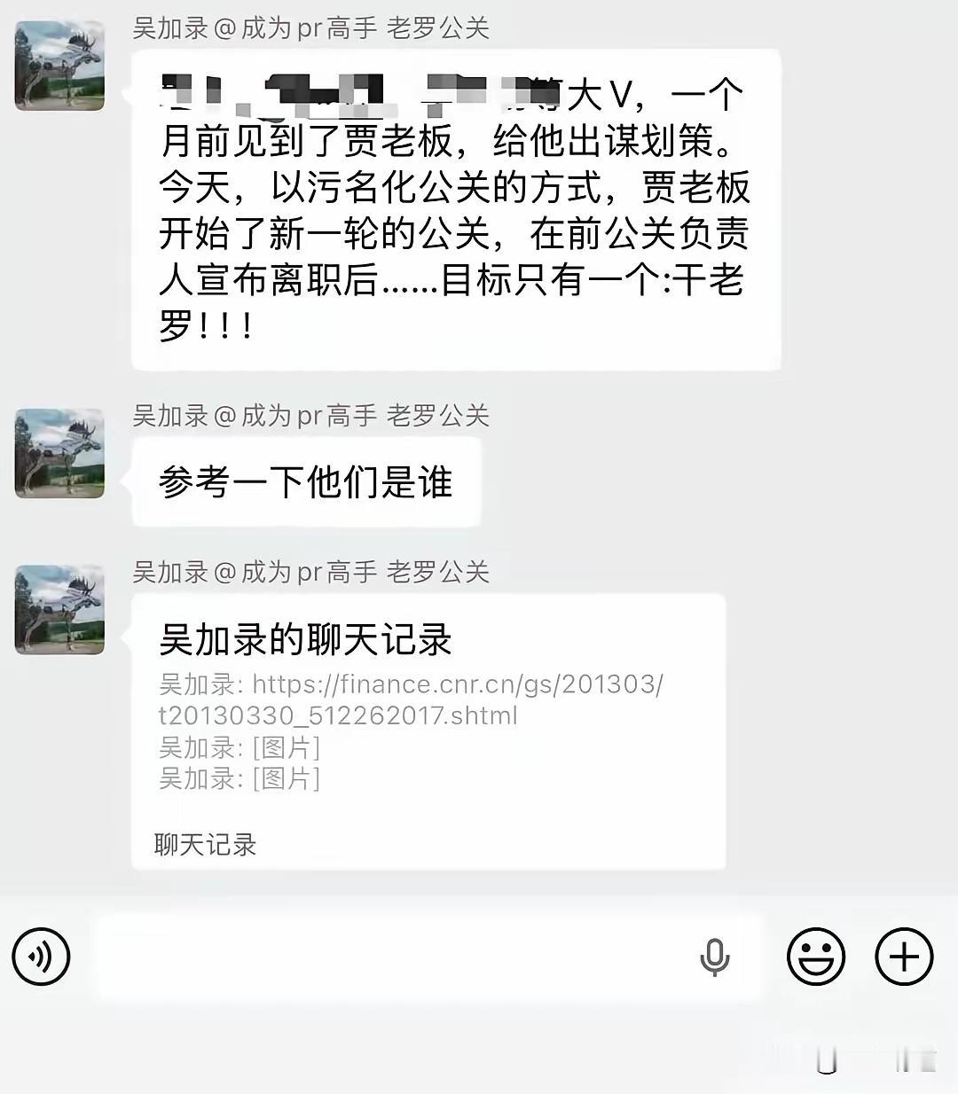 总觉得老贾背后有人,果不其然。目前这位背后的人还没有浮出水面,所以是不是高人不得而知。但是从贾总的公关总监已经辞职来看,这位应该是“高人”。 如果传言是真的(图片),目标是“干老罗!”,但,是不是值得把自己豁出去?看起来总觉得有点“鱼死网破”“共同赴死”的感觉。 真的希望老家能保住剩下的2/3店面。内蒙人的心胸应该是博大宽广的,好好做自己的事情不好吗?