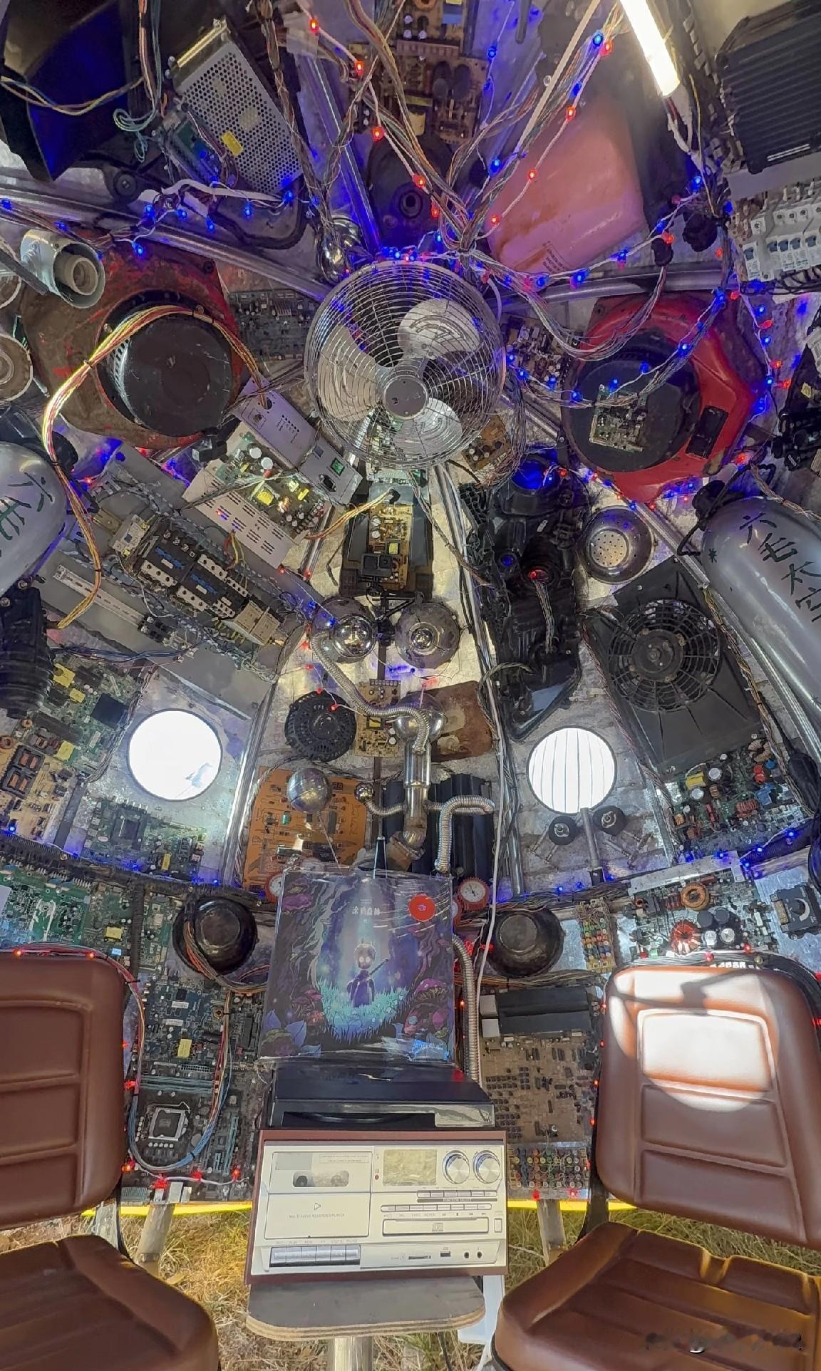 陈楚生, 拥有飞碟太空舱和机械六毛啦, 太空舱内部有生哥的《涂鸦森林》专辑, 各种电路板,彩灯,电闸,风扇等等, 我记得刀哥也会收一些旧东西, 用在各种装置里边,感觉这些就是, 生哥说六毛是有生命的, 六毛头上的毛是接收外星人信号的, 他也可以是来自外星的六毛, 有各种可能性, 和《趋光号》和他的音乐都有连接! 刀哥手速真快, 生哥的设想现在已经完成一大半了, 房顶还安装了旋转向日葵, 看来明年还会继续在这里录啊!