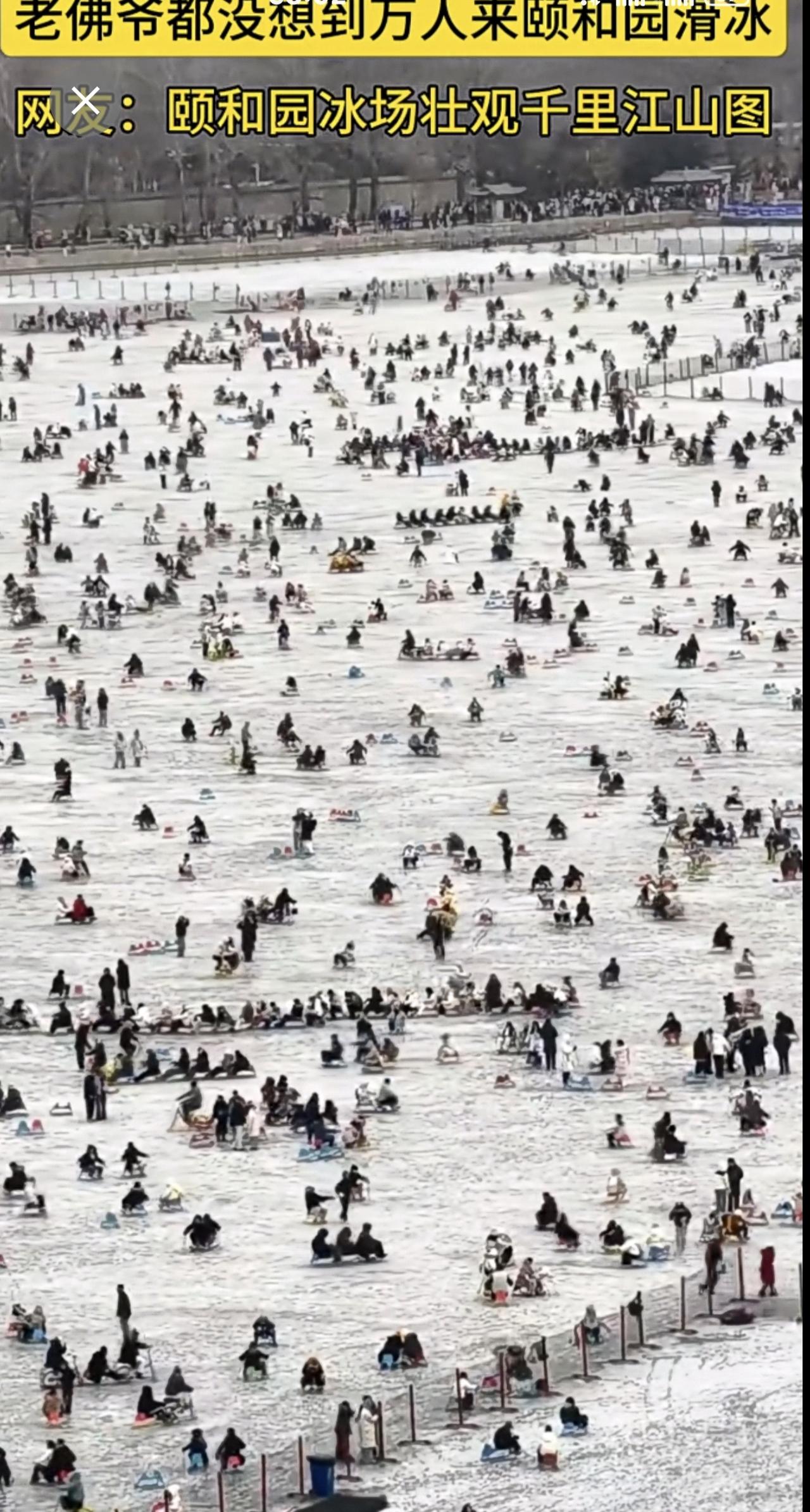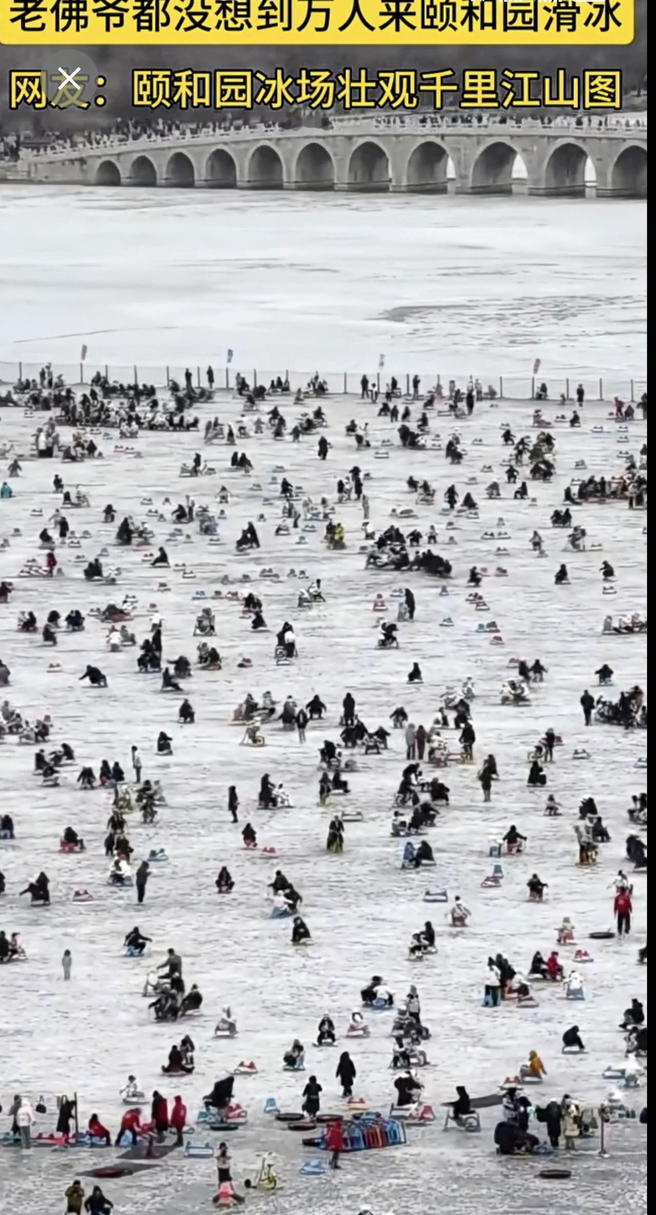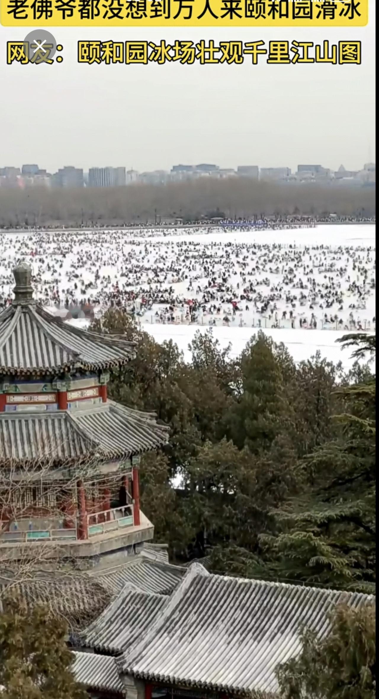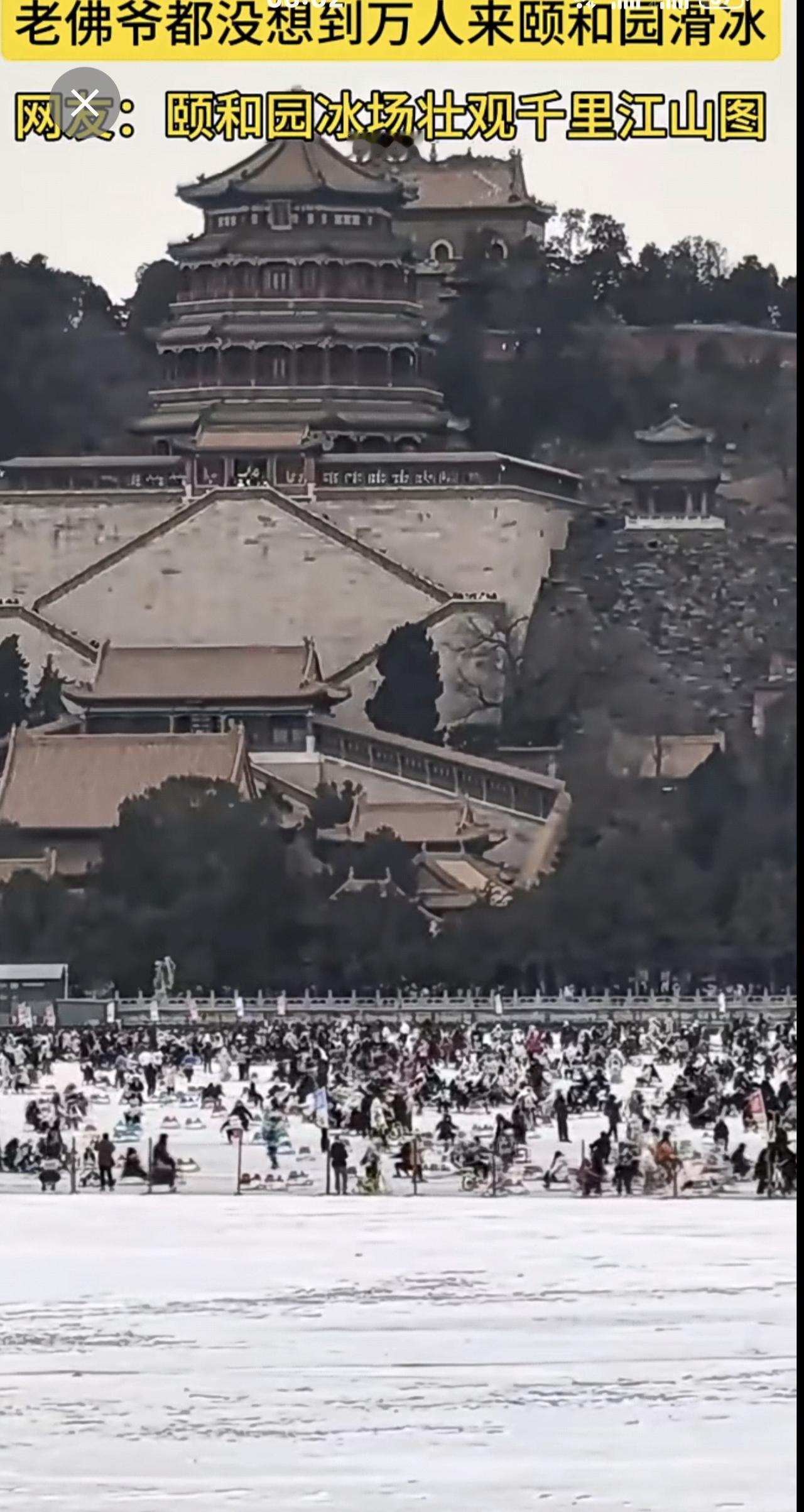 颐和园现万人冰场震撼场面,呈现一幅颐和园冰场壮观的千里江山图