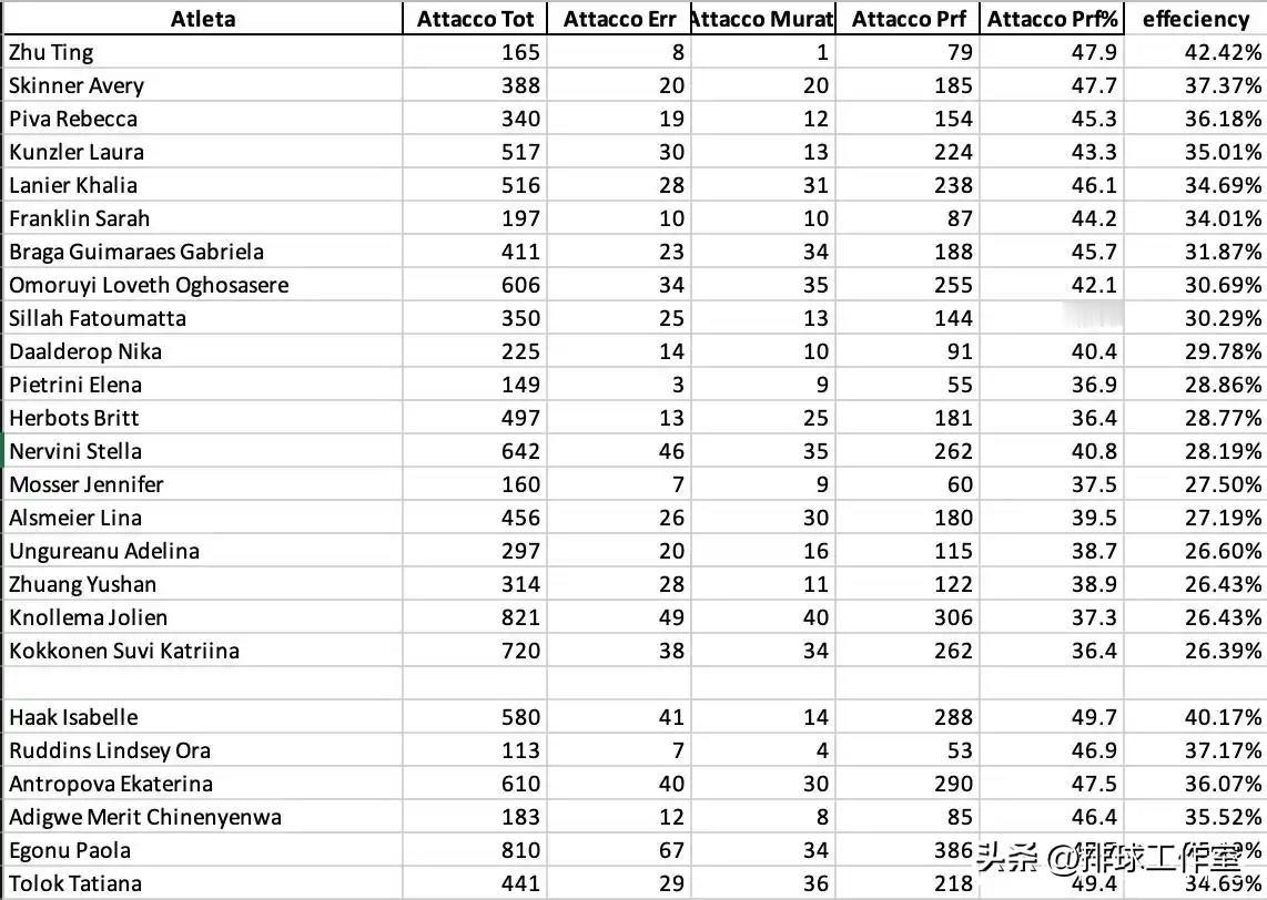 恭喜朱婷!截至意甲第七轮,她在进攻双率数据上高居所有边攻手首位,且优势明显,呈现“断层式领先”。除排名第二的哈克(因得益于同队朱婷的牵制,效率也超过40%)外,其余边攻手无人超过37.5%。 值得一提的是,朱婷在比赛中还承担了大量来自二传的失误球与困难球,这在一定程度上影响了她的进攻成功率,否则她的表现将更为出色。 (数据来源:意甲官网)