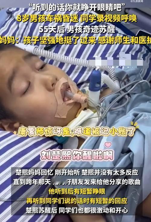 8岁半的楚熙,生活本该满是课本、玩具与同窗的欢声笑语。 (文章内容仅供参考,无任何不良引导) 一场意外车祸,打破了所有平静,他被紧急送医后陷入深度昏迷,重症监护室的门关上的那一刻,全家的世界轰然崩塌。医生曾坦言,如此年幼的孩子持续昏迷,苏醒的概率随着时间推移不断降低,每一分每一秒都在与死神赛跑。父母守在病床前,握着孩子冰凉的小手,一遍遍呼唤他的名字,沙哑的嗓音里满是绝望与不甘,泪水浸湿了无数个不眠之夜。 消息传到楚熙所在的学校,同学们的反应让老师动容。没有任何人组织,孩子们自发拿出手机,录制了一段段呼唤视频。镜头里,有的孩子红着眼眶,一字一句喊着“楚熙,快醒醒,我们还等着和你一起跳绳”;有的孩子举着自己画的画,哽咽着说“这是给你的礼物,你一定要回来收”;还有的孩子对着镜头深深鞠躬,恳求“楚熙,别睡了,我们想你了”。这些没有任何修饰的话语,带着孩童最纯粹的牵挂,被一遍遍播放给昏迷中的楚熙听。医护人员更是不敢有丝毫懈怠,55个日夜,他们精准监测各项生命体征,调整治疗方案,细致到每一次翻身、每一次喂食,用专业的医术和耐心的照料,为楚熙筑起一道坚不可摧的生命防线。 谁能想到,这份跨越校园与医院的爱,真的创造了奇迹。在昏迷第55天,当楚熙的手指微微动弹,缓缓睁开眼睛的那一刻,守在床边的父母瞬间崩溃大哭,医护人员也露出了久违的笑容。妈妈抱着孩子,声音颤抖却充满力量:“孩子坚强挺了过来”。据医护人员回忆,楚熙苏醒时,嘴里模糊地念叨着同学们的名字,那些日夜陪伴的呼唤,早已化作他潜意识里的力量源泉。这场生命奇迹,不是偶然降临。同窗的呼唤是唤醒生命的“特效药”,让楚熙在黑暗中感受到温暖;医护的坚守是支撑生命的“顶梁柱”,用专业为希望保驾护航;父母的爱意是滋养生命的“甘露”,用陪伴抵御所有绝望。正如网友所言,这是一场“爱与生命的双向奔赴”,每一个参与其中的人,都在书写着人间大爱。