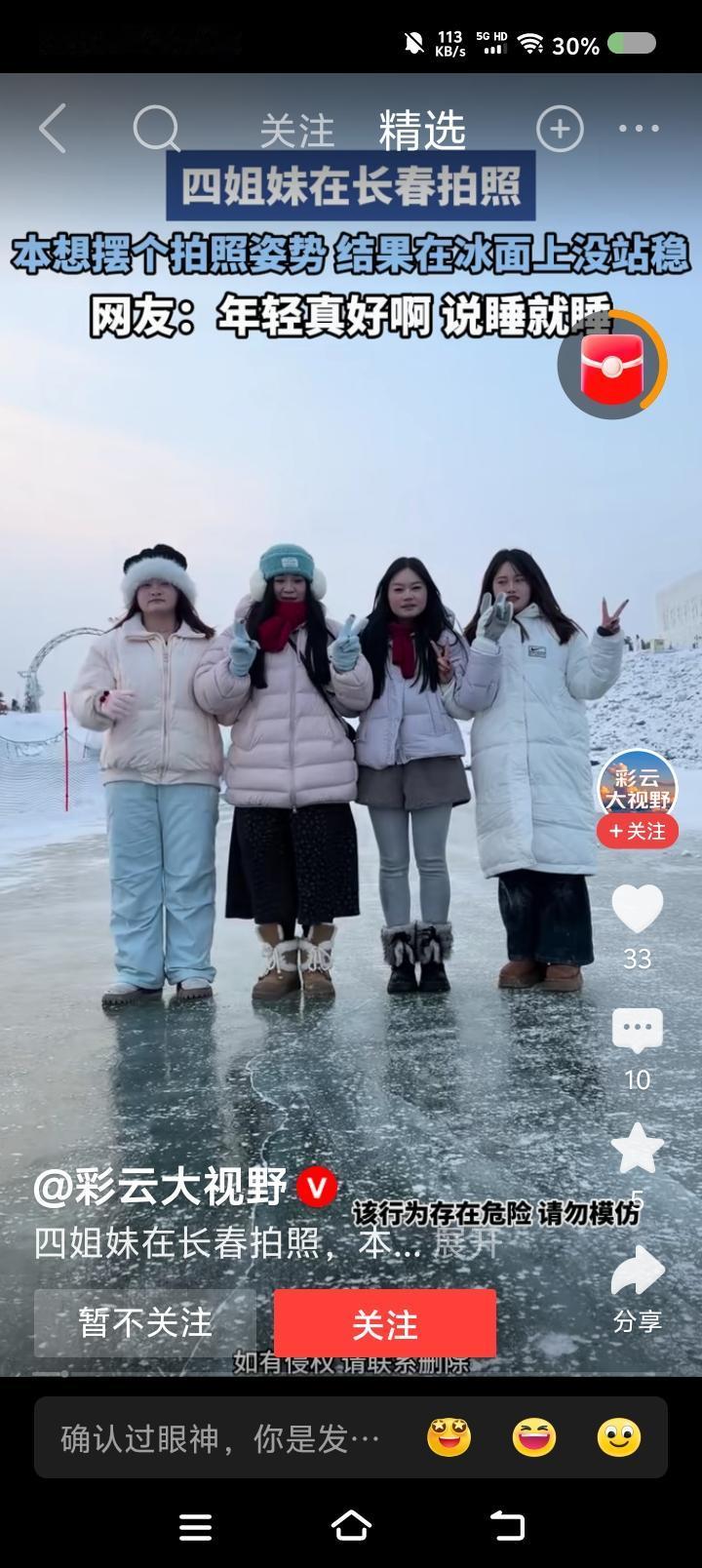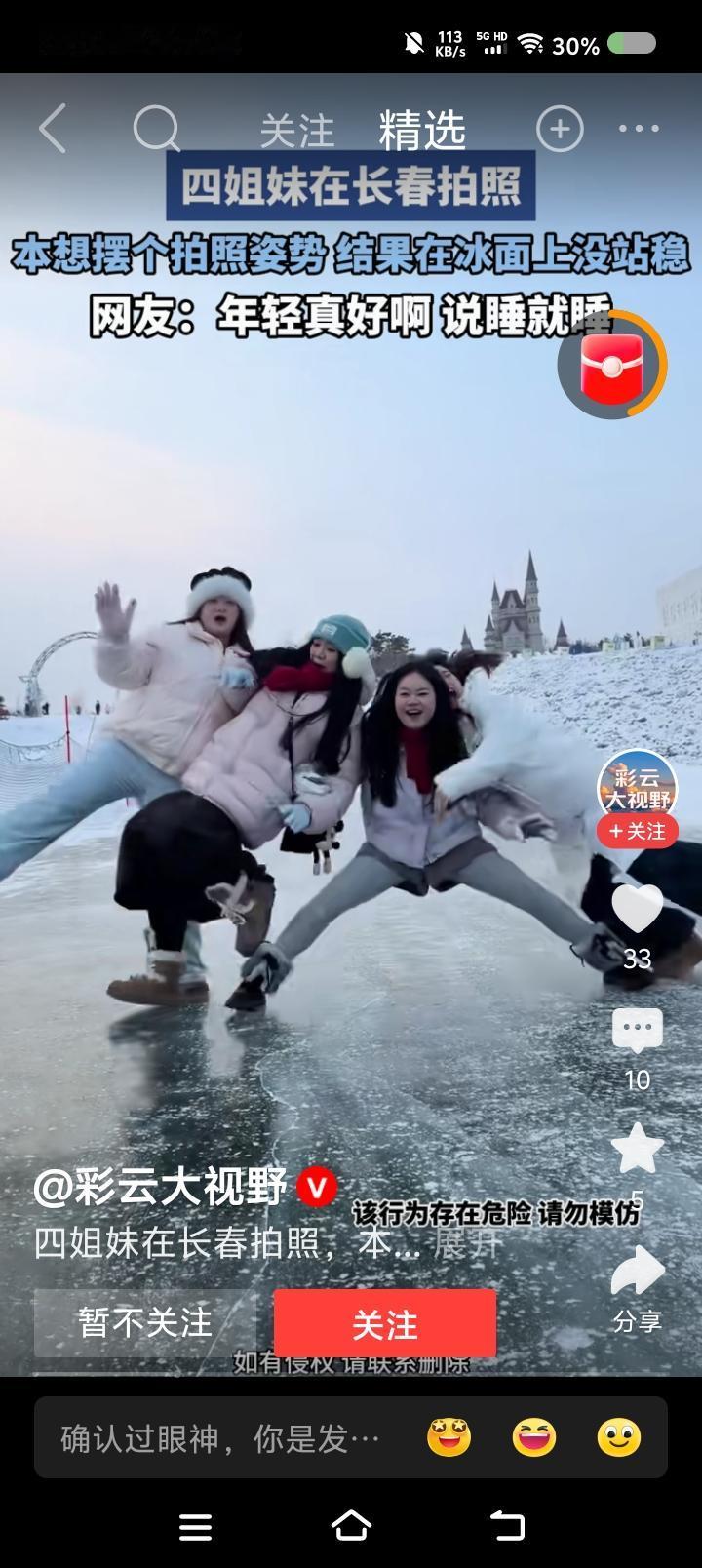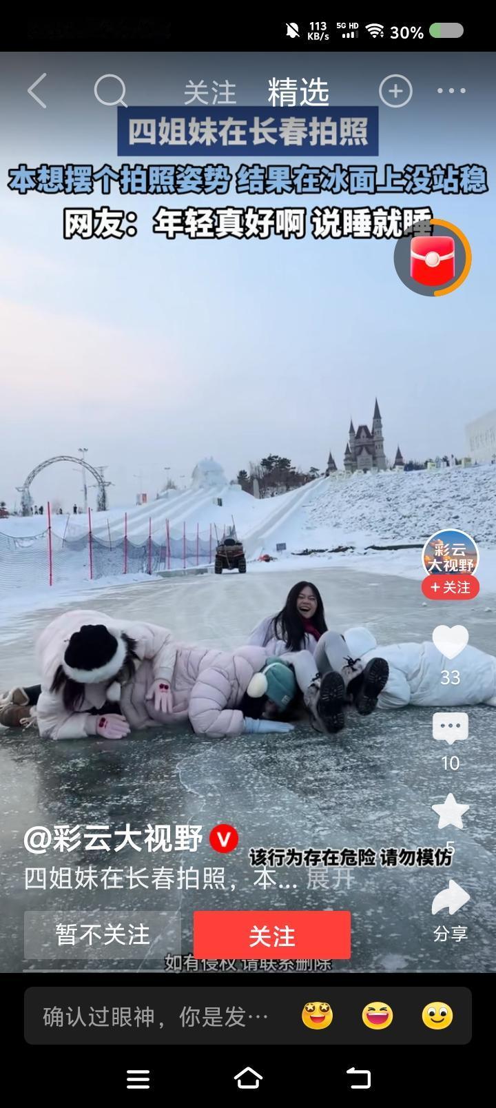 四姐妹溜冰记—— 据报道,四姐妹冰上拍照,一人想摆姿势,一出腿,四人全撂倒了。 点评: 此绝技浑然天成。再来一遍,未必成功。 非常生动。不知道摄影师抓住机会了没有。