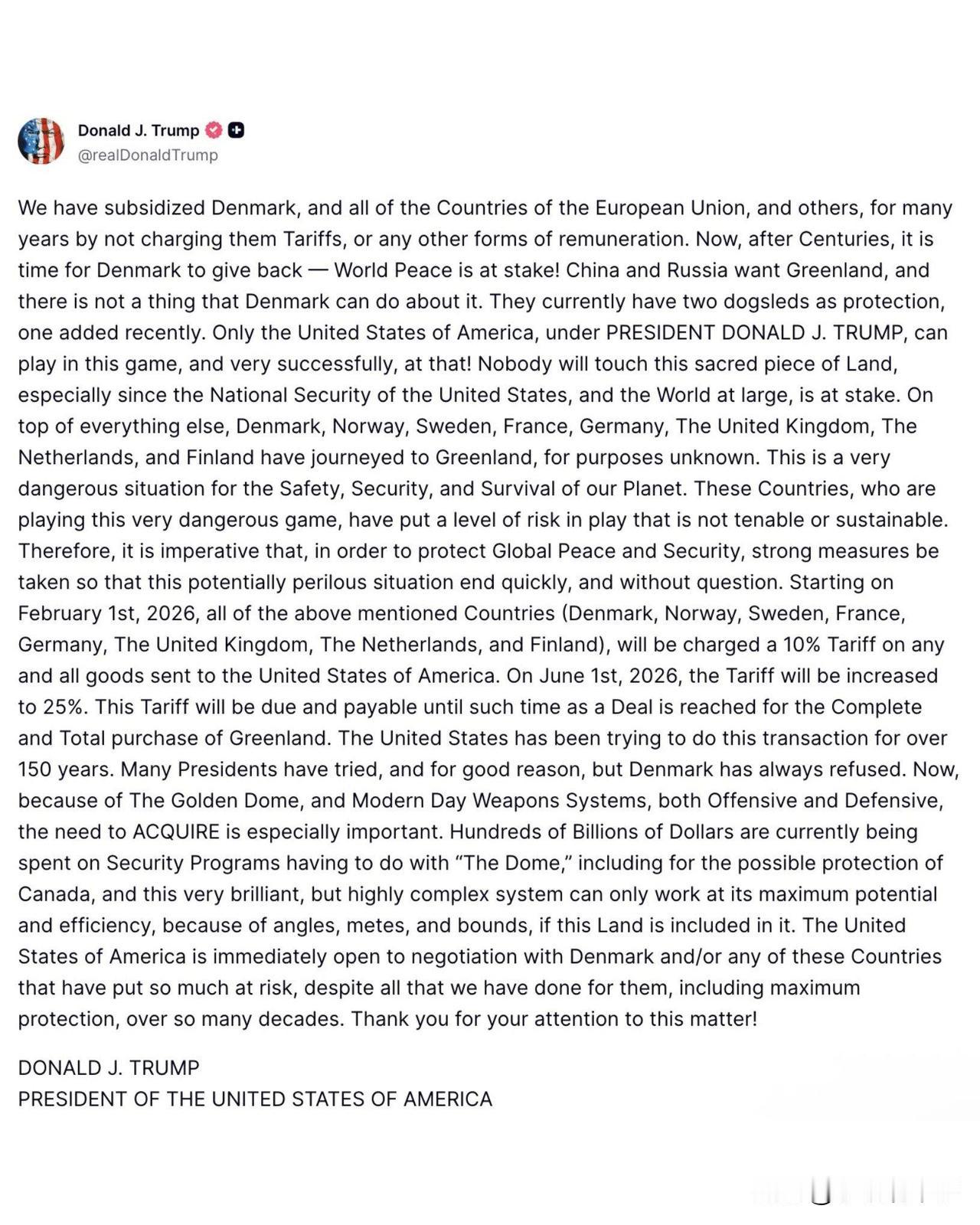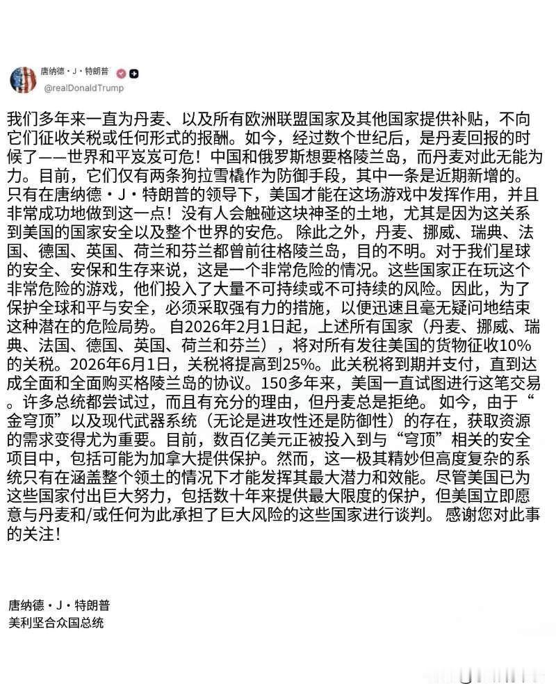 美国总统特朗普宣布,自2026年2月1日起,美国将对丹麦、挪威、瑞典、法国、德国、英国、荷兰、芬兰等国出口至美国的所有商品征收10%的关税。到2026年6月1日,税率将提升至25%。此关税将持续征收,直到就全面彻底购买格陵兰岛达成协议为止。
