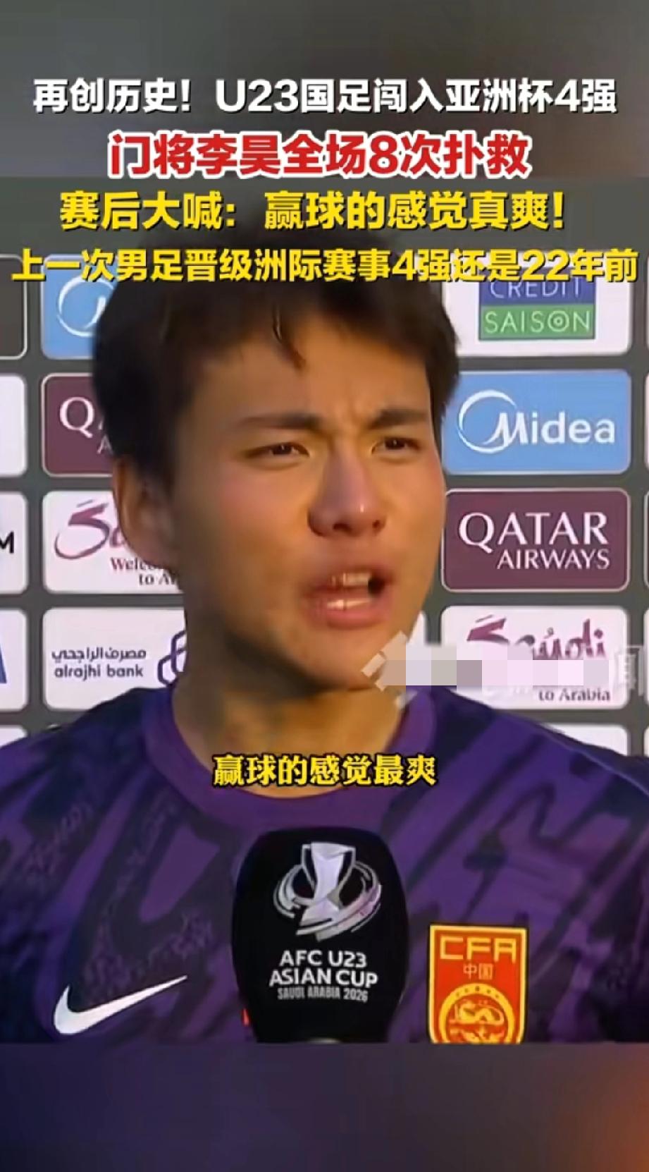 当老大哥们还在输球道歉时, U23的小伙子们已经杀进了亚洲杯四强! 李昊那场8次扑救,赛后喊出“赢球的感觉真爽”,听着就解气。 22年了,我们等的不是一场胜利,就是这种“老子拼了”的劲儿。 虽然涟漪不大,但至少证明水还没有彻底臭,还有年轻人愿意往里扎,为U23小伙子们点赞![赞] u23队 李昊 帅哥