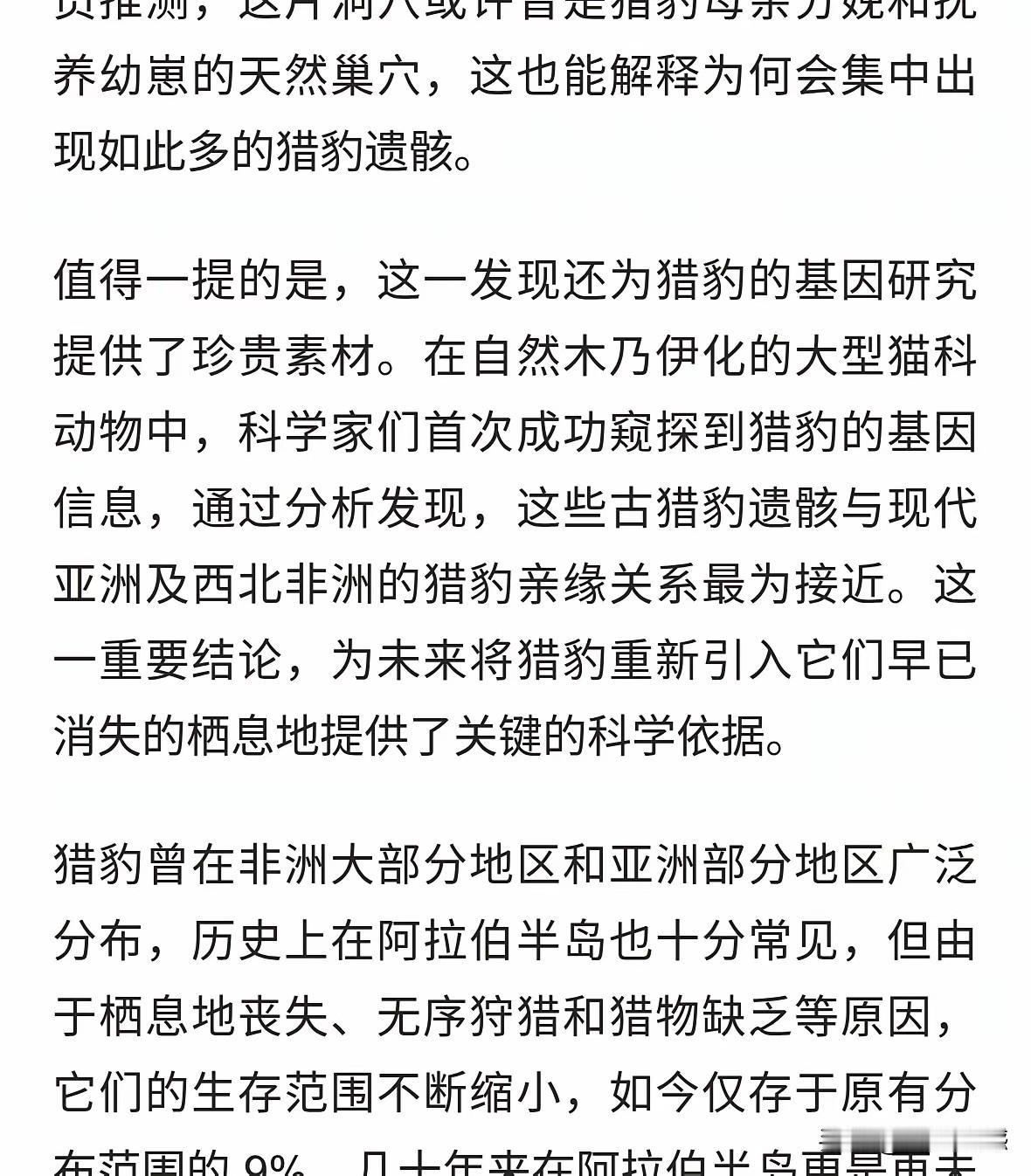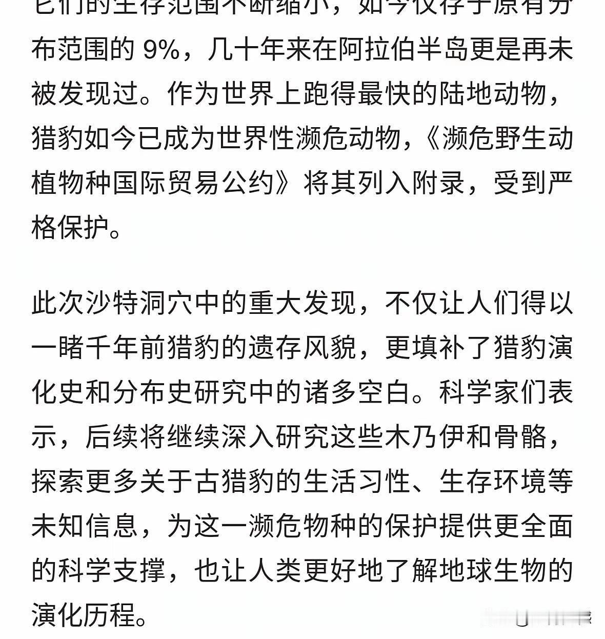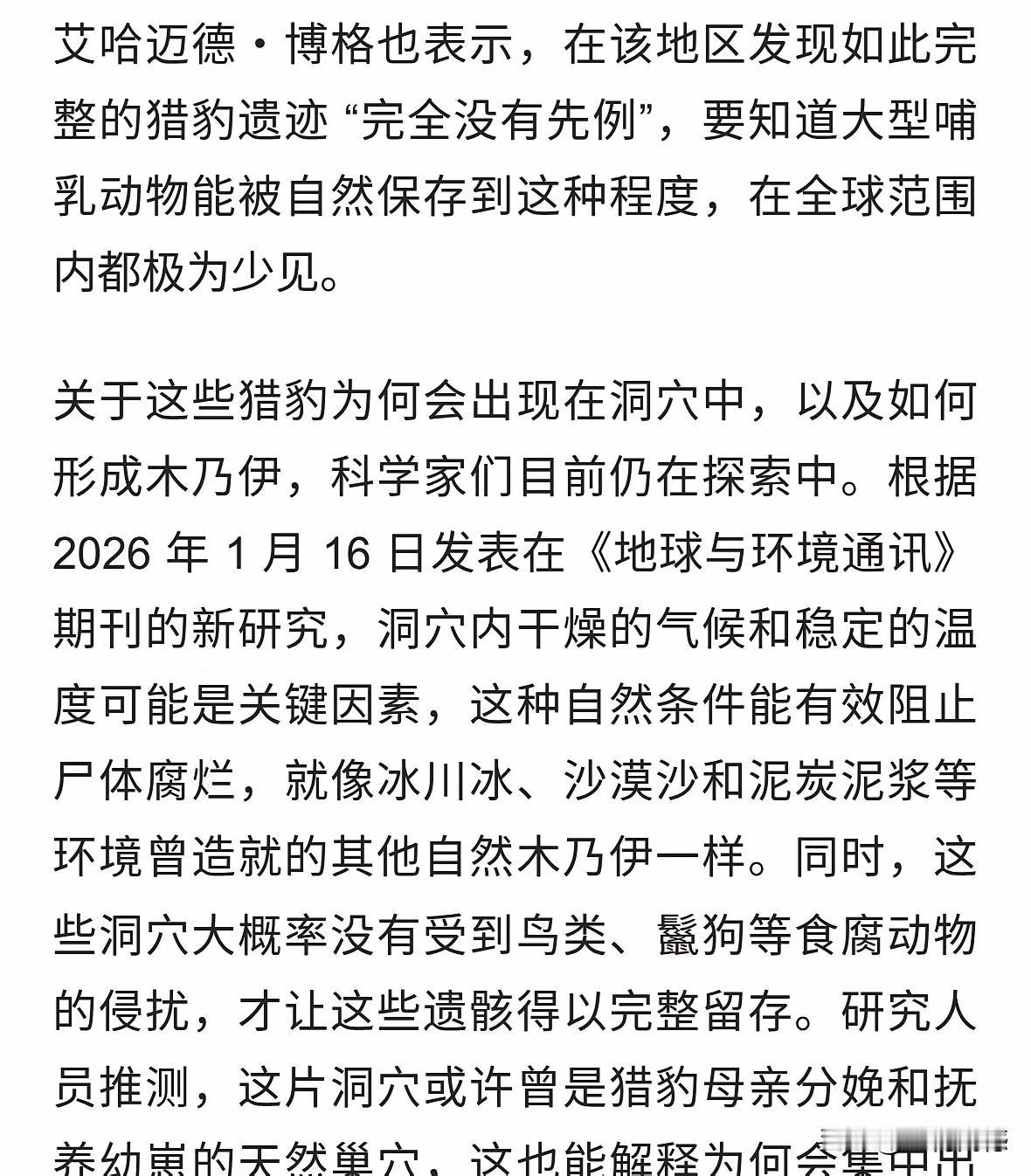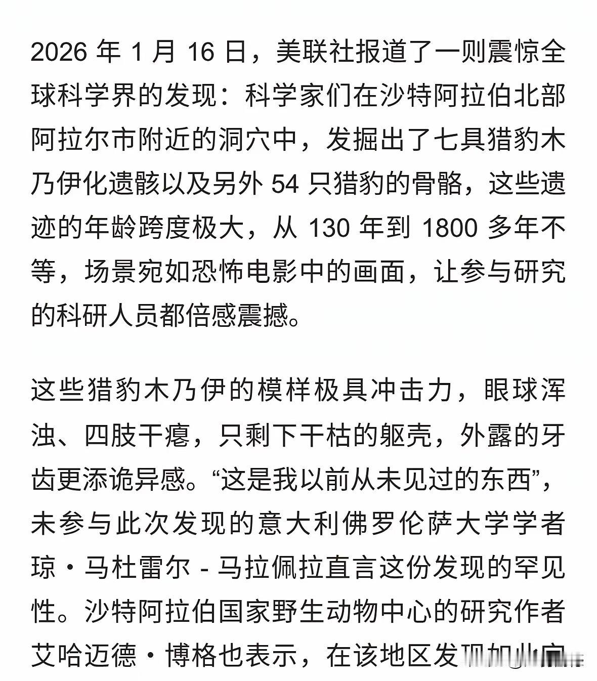猎豹木乃伊,惊现沙特一洞穴中,在这个洞穴中,一共挖掘出七具猎豹木乃伊,另外还有54只猎豹的骨骼,在一个洞穴中,发现这么多猎豹遗骸,而且又是在亚洲地区,的确是非常罕见的,专家推测,这些利豹的遗骸之所以能够保存下来,主要是当时的一些食腐动物没有发现这个洞穴,否则的话,早就被吃光了!