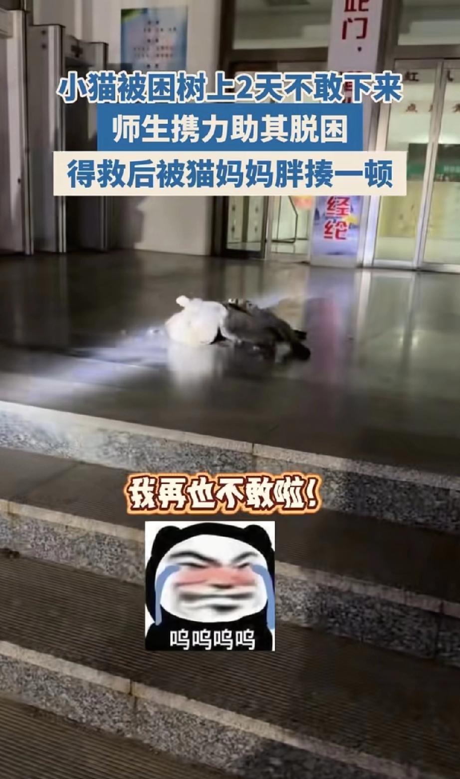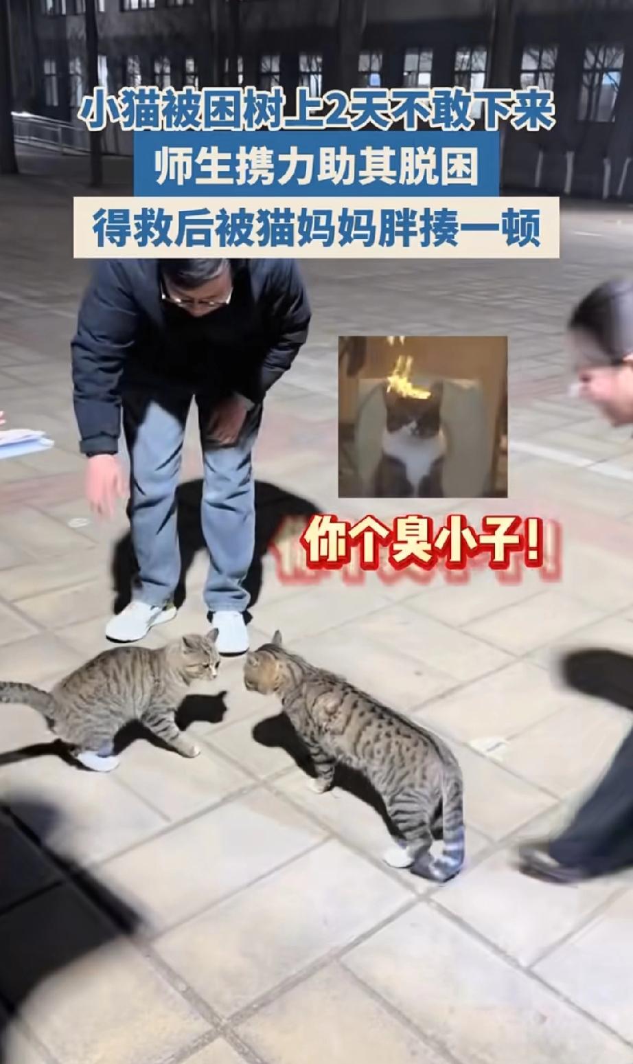 果然老师是最懂叫家长的! 学校里有只调皮的小猫,爬到树顶下不来,几个老师忙活半天,总算把它救下来。 本以为这事儿就完了,结果有个老师直接把猫妈妈叫来了。 大猫一到,根本没心疼孩子,上去就把小猫按在地上一顿狂揍! 围观的老师都笑疯了,救归救,该教育还是得教育,果然老师是最懂叫家长这一套!