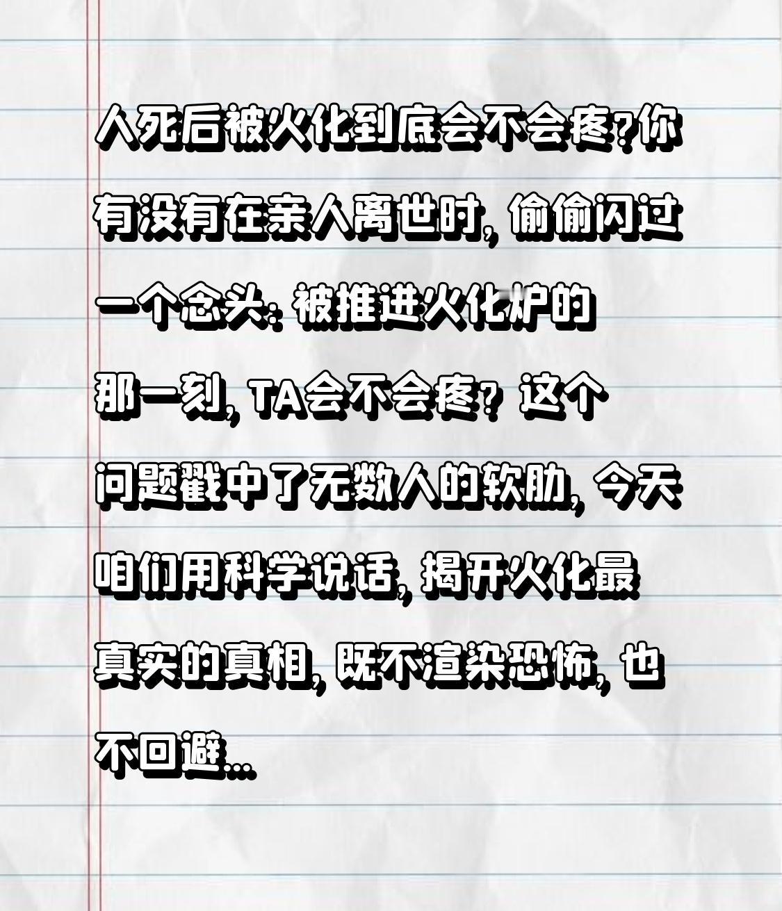 人死后被火化到底会不会疼? 你有没有在亲人离世时,偷偷闪过一个念头:被推进火化炉的那一刻,TA会不会疼?这个问题戳中了无数人的软肋,今天咱们用科学说话,揭开火化最真实的真相,既不渲染恐怖,也不回避细节,给活着的人一个安心的答案! 前几天后台收到一条私信,网友说爷爷去世后选择了火葬,可他一想到火化炉里的高温,就整夜睡不着:“听说火化时身体会动,是不是爷爷还疼得挣扎?” 相信很多人都有过类似的困惑,甚至有人因为害怕“让亲人遭罪”,宁愿花大价钱买墓地选择土葬。 今天咱们就把这个事说透,先给结论:人死后被火化,绝对不会感觉到疼! 可能有人会反驳:“我刷到过视频,火化时尸体突然坐起来,这不是疼得挣扎吗?” 这就是第一个要澄清的误区,也是最关键的转折点——尸体的“异动”和疼痛无关。 我专门咨询了殡仪馆的工作人员和医生,他们解释说:人死后,心脏停止跳动,大脑会在6分钟内完全死亡,神经系统也会随之失效,疼痛感根本无法传递。而火化时的“坐起”“抬手”,其实是肌肉遇热收缩的物理反应。就像咱们煮虾时,虾身会蜷缩起来,道理是一样的,完全是无意识的生理现象。 再说说火化的真实过程,可能比你想象中更温柔。遗体进入火化炉前,工作人员会移除金属物品,穿上专用的阻燃衣物,然后放入耐火的骨灰盒。火化炉的温度会从200℃慢慢升高到800-1000℃,这个过程是循序渐进的,先燃烧衣物和软组织,再到骨骼。 整个过程中,因为高温环境,体内的水分会快速蒸发,气体膨胀可能会让遗体有轻微的肢体变动,但这和“疼痛”没有半毛钱关系。要知道,疼痛感的产生需要神经末梢接收信号,再传递到大脑,而逝者的大脑已经完全停止工作,就像一台断了电的电脑,再怎么操作都不会有反应。 还有人担心:“会不会火化不彻底?或者过程太残忍?” 其实现在的火化技术已经非常成熟,殡仪馆有严格的操作规范,不仅会保证火化完全,还会在结束后仔细清理骨灰,装盒前让家属确认。而且相比于土葬,火葬更环保,也能节省土地资源,这也是对逝者和社会的一种负责。 可能有人会说:“就算不疼,一想到亲人被火烧,心里还是难受。” 这种心情完全能理解,毕竟那是我们深爱的人。但换个角度想,死亡是生命的终点,而火化是让生命以另一种方式回归自然。相比于让遗体在地下慢慢腐烂,火化后的骨灰更干净,也更便于后人纪念。 我们之所以纠结“疼不疼”,本质上是对亲人的不舍,是想给他们最后的体面。但科学告诉我们,火化不仅不疼,还是一种更文明、更环保的殡葬方式。那些流传的“火化很痛苦”的说法,大多是谣言或者误解。 生老病死是自然规律,我们能做的,是在亲人活着的时候好好陪伴,在他们离世后选择合适的方式告别。与其纠结火化会不会疼,不如珍惜当下的时光,让爱不留遗憾。 看完这个视频,你是不是心里踏实多了?如果身边有人也有同样的困惑,不妨转发给TA,让更多人了解真相。你对火化还有什么疑问?欢迎在评论区留言,咱们一起聊聊~