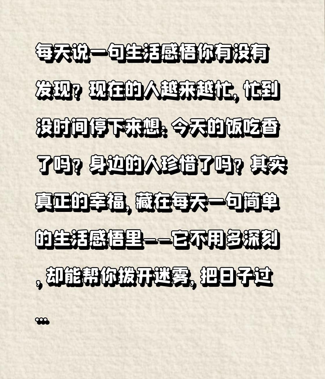 每天说一句生活感悟 你有没有发现?现在的人越来越忙,忙到没时间停下来想:今天的饭吃香了吗?身边的人珍惜了吗?其实真正的幸福,藏在每天一句简单的生活感悟里——它不用多深刻,却能帮你拨开迷雾,把日子过明白! 前几天同学聚会,当年那个爱抱怨、总emo的闺蜜,现在居然成了全场最通透的人。她说:“改变我的不是暴富,而是坚持了3年的习惯——每天说一句生活感悟。” 这话听着玄乎,可细聊之后才发现,原来把日子过顺的秘诀,竟这么简单! 我以前也是个“焦虑体质”:工作不顺心就整夜失眠,夫妻拌个嘴就觉得日子过不下去,看到别人过得好就忍不住内耗。直到去年夏天,被医生警告“再焦虑就会垮掉”,我才跟着闺蜜学,每天睡前花5分钟,说一句当天的生活感悟,没想到短短一年,整个人都不一样了。 刚开始特别敷衍,比如“今天加班好累,赚钱真难”“外卖不好吃,下次换一家”。可坚持一个月后,我发现自己开始主动观察生活了。早上买早餐时,老板多给了我一个茶叶蛋,我会感慨“原来善意藏在细节里”;下班路上看到夕阳染红天空,我会默念“忙碌的一天,也有温柔收尾”。 这里要跟大家说个转折点——以前我总觉得“感悟”得是大道理,直到有一次,我因为忘了带钥匙被锁在门外,等老公来接时,看着楼下跳广场舞的阿姨们,突然想通:“生活里的小意外,其实是让你慢下来的信号。” 从那以后,我不再纠结于负面情绪,而是学会从琐事里找答案。 有次跟同事闹矛盾,我差点当场翻脸,可脑子里突然冒出当天的感悟:“赢了争吵,输了关系,得不偿失。” 冷静下来沟通后,不仅化解了误会,还成了更好的合作伙伴。还有一次,儿子考试考砸了,我本来想批评他,却想起前一天的感悟:“成长比成绩重要,陪伴比指责管用。” 耐心开导后,儿子反而主动制定了学习计划。 现在的我,不再被焦虑裹挟,也不再盲目攀比。每天一句感悟,就像给心灵做按摩,让我看清自己真正想要什么。它不用长篇大论,也不用追求深刻,可能是“今天的粥熬得刚刚好,生活也一样,慢一点更甜”,也可能是“帮陌生人指了个路,原来付出比索取更快乐”。 其实生活从来都不复杂,复杂的是我们浮躁的心态。每天花5分钟,跟自己的内心对话,把当天的经历、情绪、思考浓缩成一句话,久而久之,你会发现:原来快乐藏在柴米油盐里,通透藏在点滴感悟中。 从今天起,不妨试着说一句生活感悟吧!不用求多,不用求深,只是单纯地记录、反思、沉淀。一年后你会感谢现在的自己,因为那些看似不起眼的小感悟,终将汇聚成改变人生的大力量。 你今天的生活感悟是什么?欢迎在评论区留言分享,咱们一起记录生活、治愈自己!