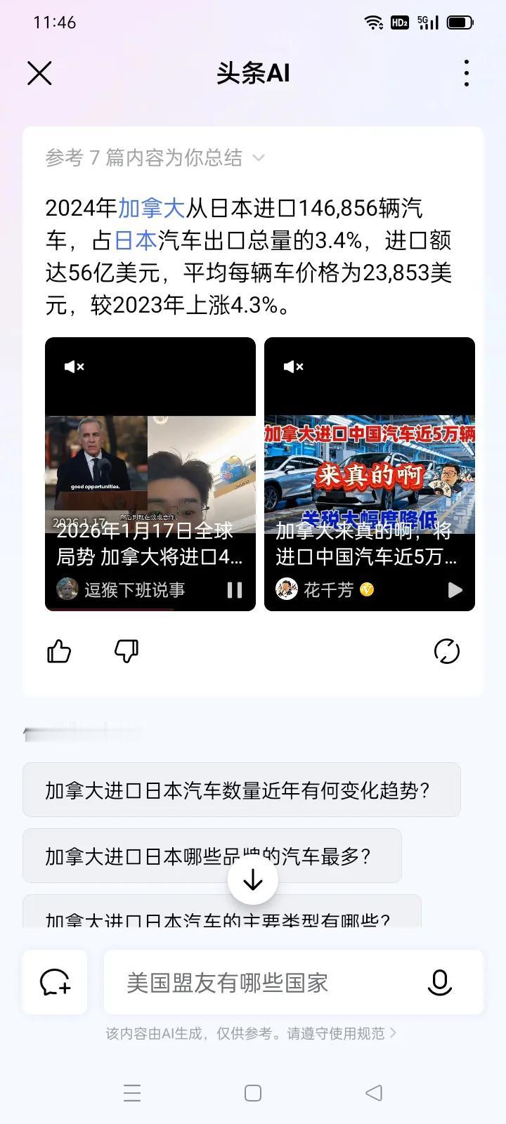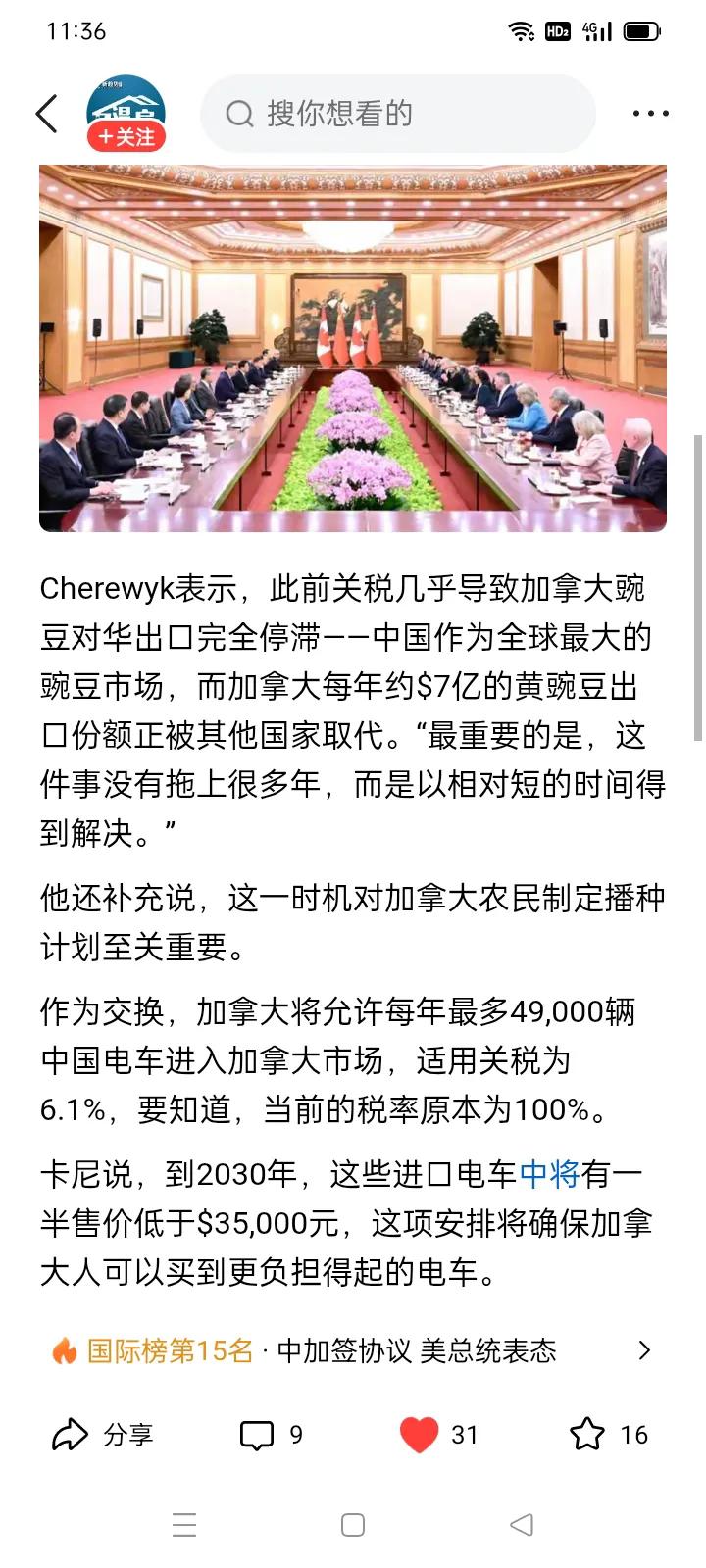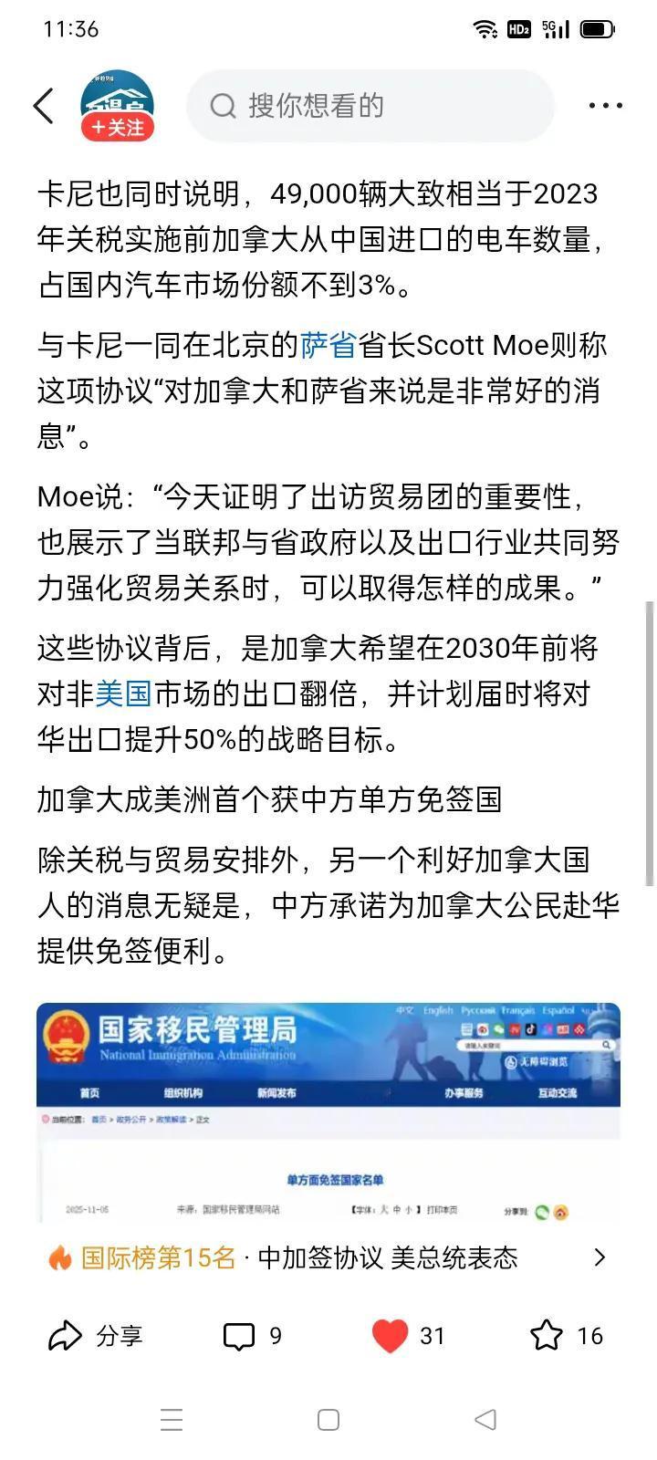 特朗普扬言‘不需要加拿大商品’ 加总理来华收获满满 *特朗普心心念念要把加拿大变成美国的第51个州,所以对加进行了贸易打压,他还说‘美国不需要加拿大商品’,并且打算在今年终止《美加墨贸易协定》。 *而中国却是加拿大商品的大金主,25年之前加拿大每年向中国出口7亿美元的豌豆,24年中国进口了668亿加元商品。 24年开始加拿大对中国的电动汽车、钢铝分别征收100%、25%关税并且加拿大军舰还穿越台湾海峡、挑衅中国! 25年8月中国从对加拿大油菜籽及其他农产品征收报复性关税。 *这次双方协议安排:1中国承诺向加拿大开放26亿美元的农产品市场! 2加拿大今年允许进口4.9万台中国的电动汽车,(不到其国内汽车市场份额的3%!)以后逐渐增加到7万台,关税6.1%。而且加拿大还要求到2030年一半的中国电动汽车销售价格低于3.5万美元! 其实24年加拿大从中国进口了3万台电动汽车(主要是特斯拉),当时加拿大的进口关税是100%!可见加拿大人需要电动汽车。 作为对比,24年加拿大进口日本汽车近14.7万台,总价56亿多美元。 由此可见,加拿大对中国商品还存在歧视性待遇! *加拿大的如意算盘打得很好,它打算到2030年之前对中国出口增加50%! *至关重要的是,加拿大仍然敌视中国,不允许华为和中兴通讯参与其国家的5G通信建设!
