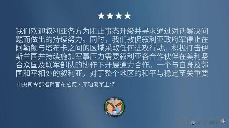 美国中央司令部呼吁叙利亚政府(过渡政府)停止在阿勒颇与塔布卡之间地区的所有进攻行动。