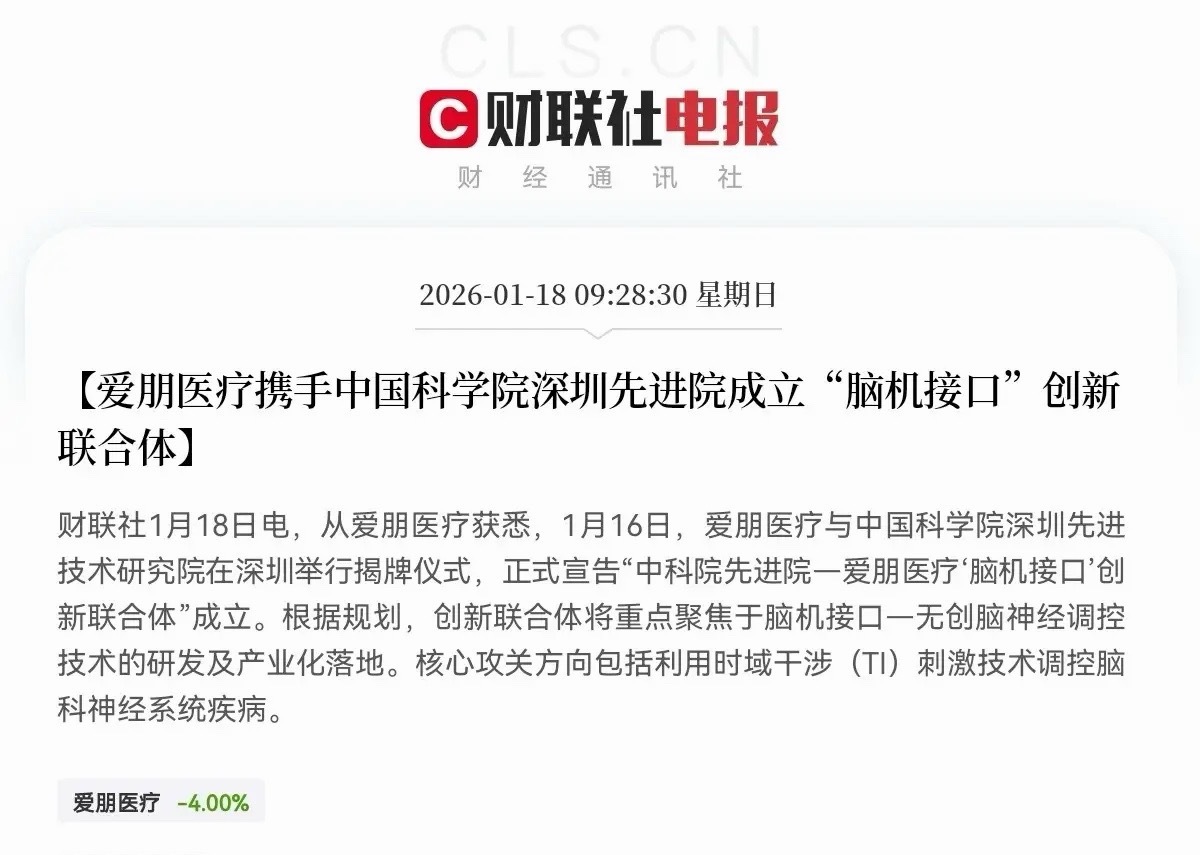 大利好!重大利好!脑机接口又迎来超级利好了,预计明日脑机接口概念要大爆发,满仓脑机接口的股民们有福了,要吃大肉了…下午1点45分,看到爱朋医疗发布重大消息,16日爱鹏医疗与中国科学院深圳先进技术研究院在深圳举行揭牌仪式,正式宣告“中科院先进院-爱鹏医疗脑机接口创新联合体”成立,此消息一出,股民们又兴奋的手舞足蹈了,一致认为对于脑机接口概念又要大利好事件,爱朋医疗与中科院深圳先进院的强强联合,通过聚焦无创技术、明确产业化路径并积极响应国家政策,不仅为自身发展注入了强劲动力,也为整个脑机接口产业的创新发展和规模化落地提供了可贵的范本,随着技术的成熟和成本的降低,脑机接口设备有望从专业医疗场景拓展到消费电子、智能交互等领域,形成“医疗+消费”的双轮驱动格局,为整个产业开辟巨大的市场空间 ,是重大利好!股民们!坐稳扶好!受此利好消息催化,预计明日脑机接口概念又要点火起飞了,核心受益公司要大爆发!