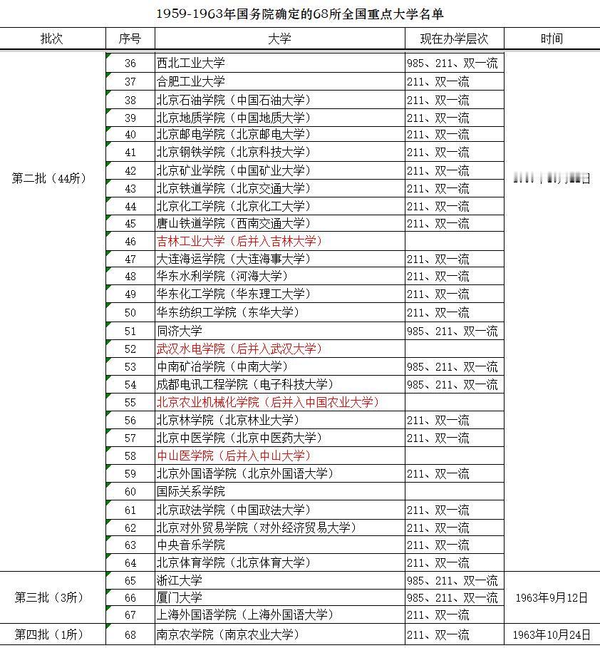 国家首次确定的68所全国重点大学,今犹何在? 全国重点大学是我国院校建设中的一个重要里程碑,也是区分其他普通院校的重要标志。上个世纪六十年代,国家首次分四批确定了68所全国重点大学。这些重点大学在经历过停办、恢复建设,以及多次调整改革,至今60余年后,已经面貌一新。 其中,1所虽沦为普通“双非”院校(国际关系学院),但他仍是受人追捧的五大“官校”之一;6所已被合并,成为了全国举足轻重985、211、双一流大学重要的一部分;36所已更名,成为了一所底蕴深厚、学科更全面的专业型大学。 全国重点大学虽已成为了历史,但他已经完全融入了这些大学之中,成为深厚底蕴的重要标志。