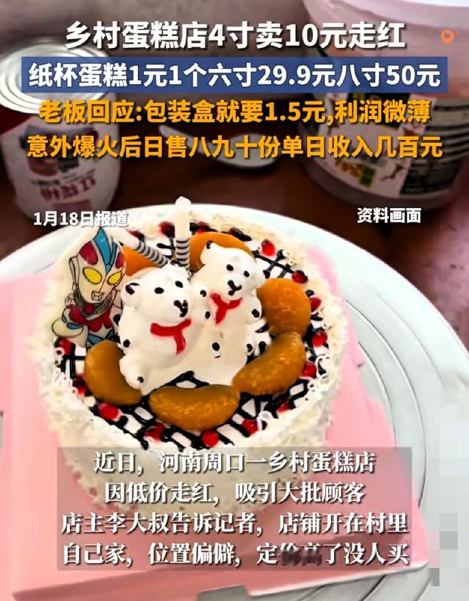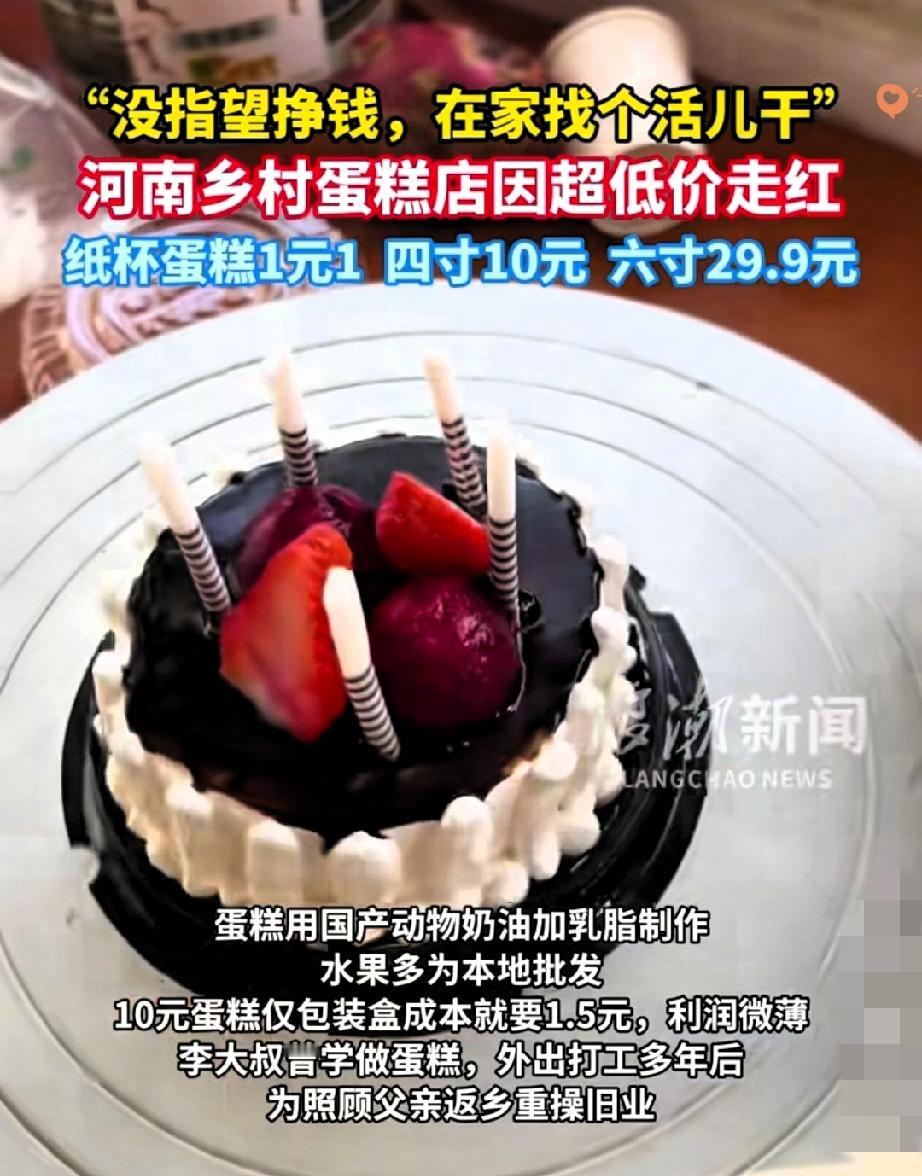 河南乡村这家蛋糕店凭10元4寸蛋糕爆火,网友直呼“终于不用被蛋糕刺客收割了”! 老板李大叔返乡开店照顾父亲,起初压根没指望赚钱,没想到这份实在让小店火到两个儿子都来帮忙。 要知道这10元蛋糕里,光包装盒成本就1.5元,还用的是动物奶油加新鲜水果,比城里动辄五六十的溢价蛋糕实在太多。 没有网红装修,没有花哨营销,靠的就是薄利多销和真心用料,反而戳中了大家的痛点—— 现在太多商家把包装和概念炒得比产品本身还贵,早就忘了做生意的本质是实在。 这家小店的走红,根本不是偶然,而是消费者对套路营销的无声反抗。 大家追捧的从来不是低价,而是不被当“冤大头”的踏实消费。 你最近遇到过“蛋糕刺客”吗?评论区聊聊你的经历~