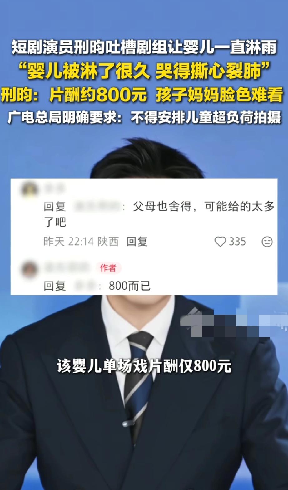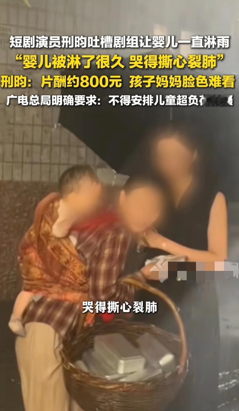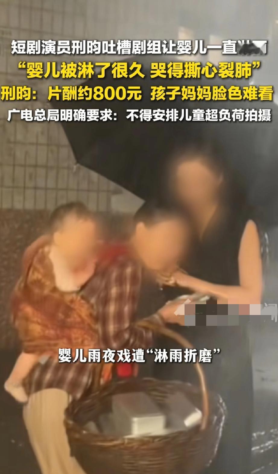这种辣鸡剧组, 就该直接封了, 别再出来祸害孩子了! 就为了拍个破短剧,把小婴儿往雨里放那么久,哭得撕心裂肺,剧组是人吗? 更可笑的是,这遭罪的片酬才800块!800块够干啥?孩子淋完雨感冒发烧,去趟医院挂号、验血、拿药,这点钱都不够!孩子妈妈脸色难看?换谁能好看! 广电早就说了不能让儿童超负荷拍摄,合着在某些短剧剧组眼里,规定就是个屁,为了博眼球,连最基本的人性都不要了。