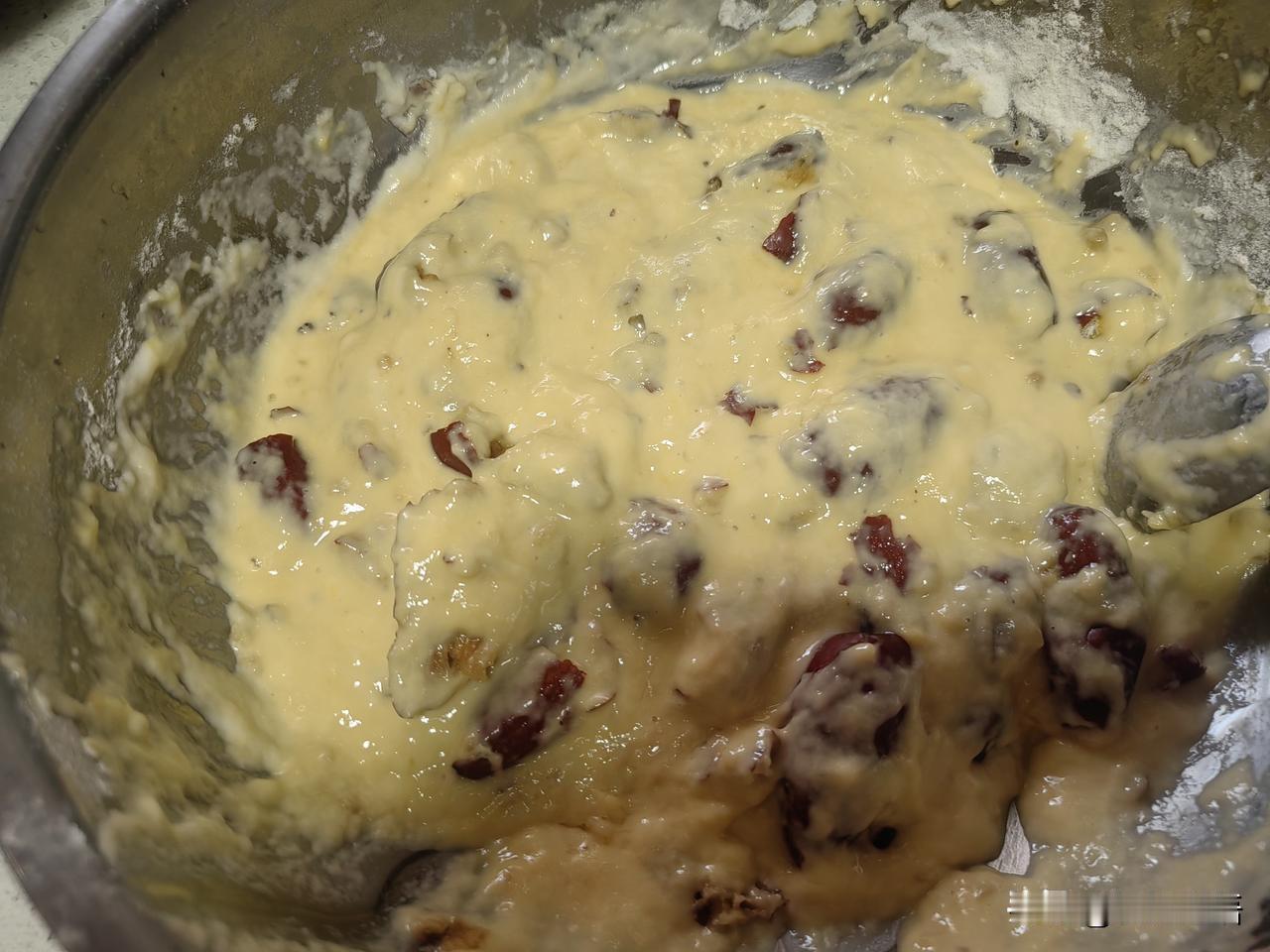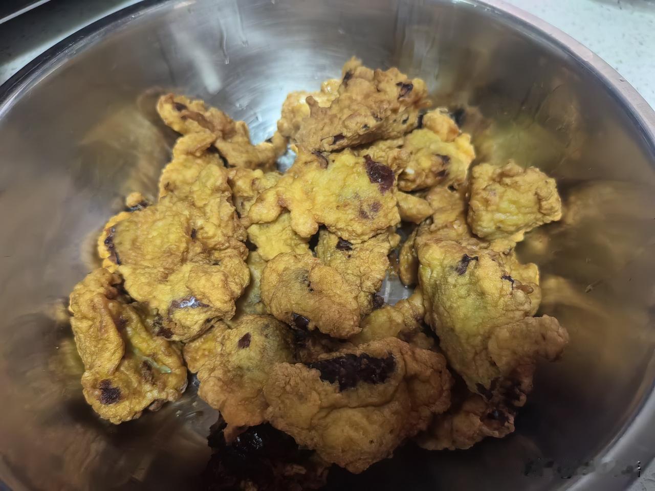 晚饭,娘俩吃的是炸大枣,南方的小伙伴们肯定没吃过。 今天老妈的精神状态不错,早起就张罗着要给我炸大枣吃。 先是把大枣用热水泡好,等到下午的时候,大枣泡软了,老妈开始准备做炸大枣。 鸡蛋,面粉,白糖加上温水,再把大枣放进去,醒发了半个多小时。 油温热了以后,母亲用小勺子把裹着大枣的面糊,一勺一勺的放到热油锅里炸。 大枣渐渐地漂浮在油面上,一股香甜的味道,阵阵飘过来。 炸好的大枣,外酥里嫩,甜甜的,还是小时候吃的味道。 炸大枣是东北特色菜,是不是很多南方的小伙伴没有吃过? 你们也不妨试一下,真的很好吃。