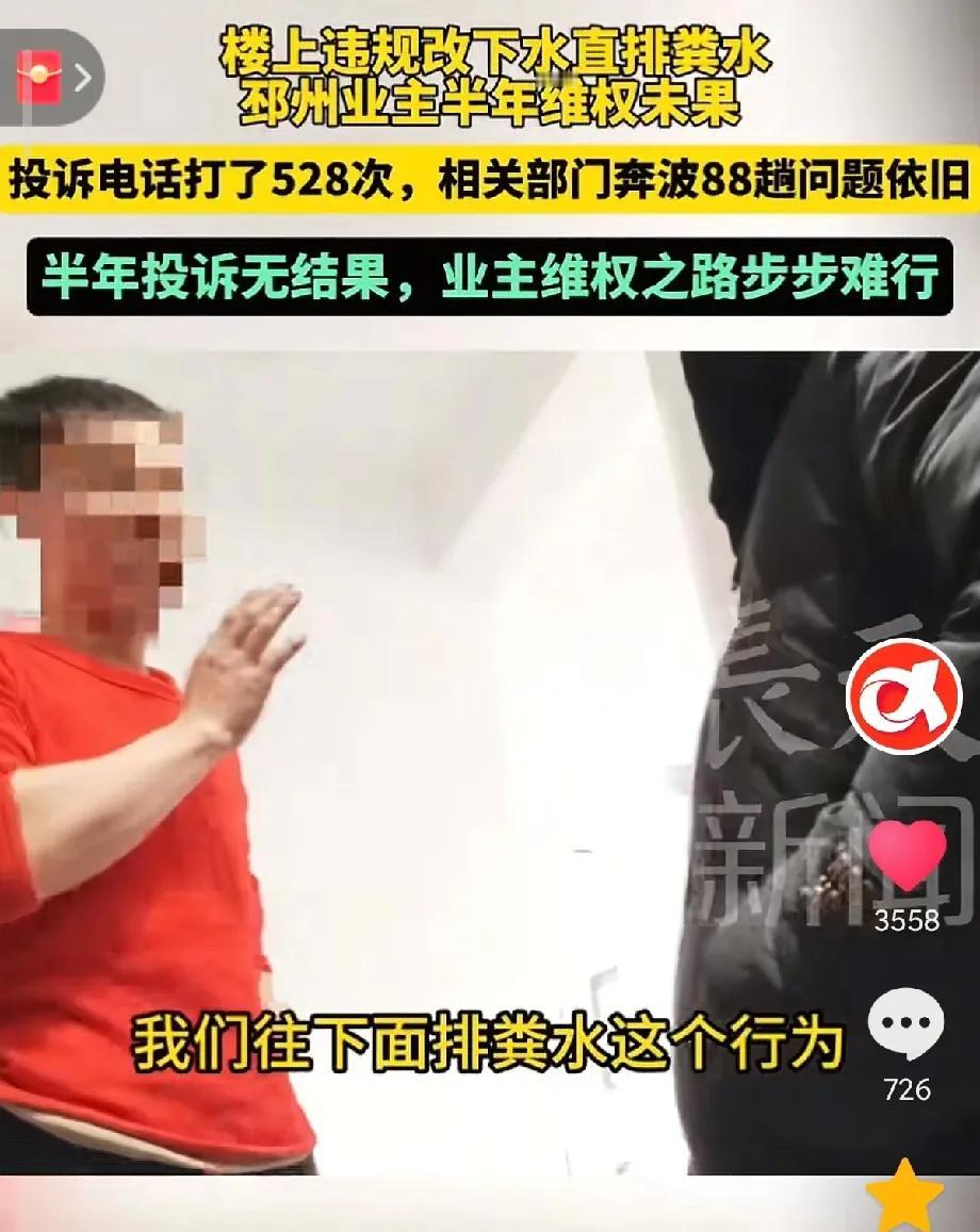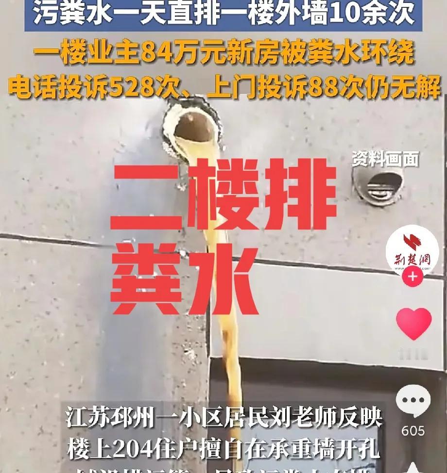 自作孽啊!刘老师花84万买一楼新房,结果两次砍掉二楼做的独立排水,谁承想,二楼破罐子破摔,竟然就直接用了,接下来一楼每天窗外都是粪水,一天就能多达10多次。 2楼老是堵,于是就想改独立下水,结果1楼并不同意,觉得影响美观,于是让物业把2楼的独立下水给锯掉了。 接着2楼又把独立下水给修好了,而1楼又接着让物业锯掉,好的2楼很生气,既然锯掉了,那就直接排在外面吧,谁也别想好过。 接着1楼边每天都能看到门外的粪水,窗户,草坪全都是污秽,为了投诉他已经打电话528次,上门投诉就有88次。 物业说没有执法权,街道大门都不让进,直接让她往上面反映,房管部门还当面说。 2楼的楼主甚至还威胁要弄死她,于是刘老师便报警维权,2楼被拘留后更加的我行我素。 刘老师被这个新房折磨的痛苦不堪,每天都睡不着觉,只好喝安眠药。 对此我特地搜了一下,如果2楼改独立下水对1楼的影响,结果就是没有什么影响,只有好处。 2楼如果不改的话,特别容易堵(新闻里这个2楼他们家就老堵),如果被泡了可能会被淹1楼天花板,如果2楼改成独立排水,那么相对来说就是3楼容易堵,对于1楼来说反而避免了淹天花板的情况,其实最应该有意见的是3楼,而不是1楼。 有的网友给刘老师出招,你只要把粪便水拿桶接好,到他们家门口就行了,如果不行,你就把那个电梯到什么地方你都倒上去。让整栋楼的人都不好过,自然就会有人出面来搞这个事情了。 还有的网友劝刘老师退一步,实在不行你就花点钱把管子接下去,就一个弯头几米管子的事情。 还有的网友感慨,这个事儿没法说清楚,本质上其实应该是物业和整个楼住户的排污管理问题,最简单的办法就是2楼装个独立排污,但是1楼又不愿意,这还真是没招。