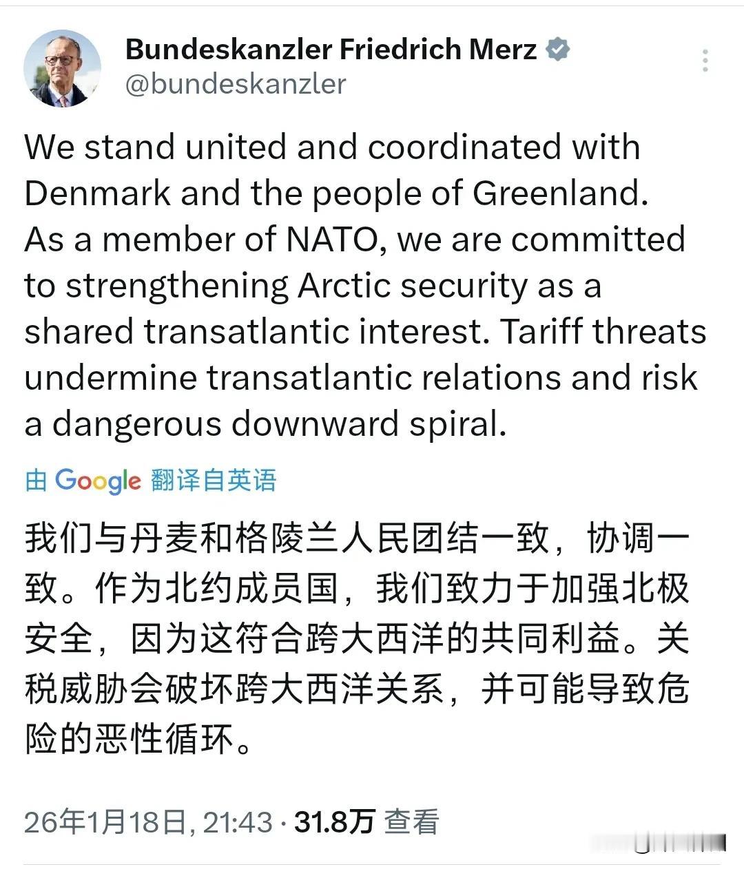 德国总理默茨昨晚(北京时间1月18日晚)写道:“我们与丹麦和格陵兰人民团结一致,协调一致。作为北约成员国,我们致力于加强北极安全,因为这符合跨大西洋的共同利益。关税威胁会破坏跨大西洋关系,并可能导致危险的恶性循环。” 评几句: 默茨深夜发文划下红线,一边与丹麦、格陵兰人民坚定站在同一阵线,一边直指美国关税威胁的致命危害,这番表态堪称北约盟友关系生变的公开信号! 特朗普以“购岛”为要挟,对8个欧洲盟国挥起25%关税大棒,早已突破盟友相处的底线。默茨强调“跨大西洋共同利益”,实则戳破美国单边主义的虚伪——当美国将北约成员国的主权当筹码,把关税当作地缘博弈的工具,所谓“共同安全”的公信力也在不断受损。 格陵兰岛的北极航道控制权与战略价值,让美国不惜无视国际法与盟友情谊。但默茨的发声绝非孤例,欧洲8国已联合反击,欧盟更是暂停美欧贸易协议以示抗议。这场危机早已不是单一领土争端,而是跨大西洋信任的终极考验。 若美国执意将关税威胁进行到底,不仅会引发“危险的恶性循环”,更可能让北约出现结构性裂痕。默茨的表态,正是欧洲对单边主义说“不”的集体宣言,跨大西洋联盟的裂痕,已难以弥合!