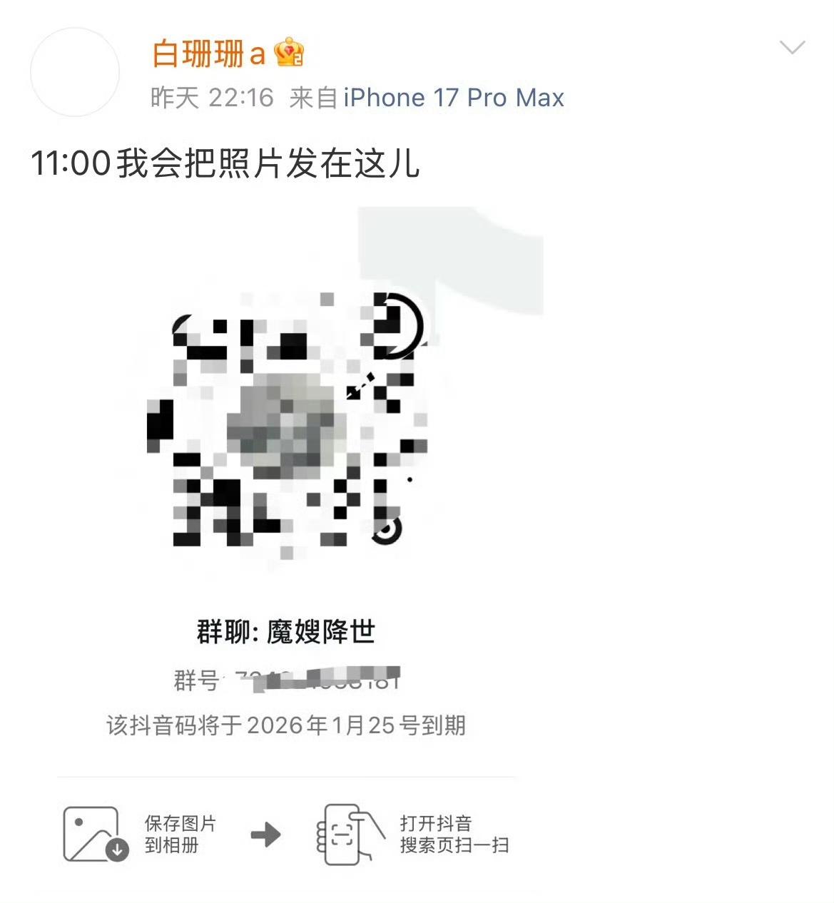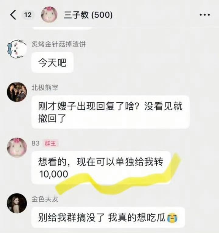 白珊珊“魔嫂降世”群闹剧:11点爆照成空,索要万元后解散群聊 白珊珊高调预告11点爆照,还专门建了个名为“魔嫂降世”的群,群简介竟照搬司晓迪的文案,离谱操作让人直呼不靠谱,预感要被遛。 更扯的是,她要求想看爆料的人单独转1万元,收钱后直接解散群聊。这波操作属实把吃瓜群众拿捏了,只能说:吃瓜有风险,掏钱需谨慎!