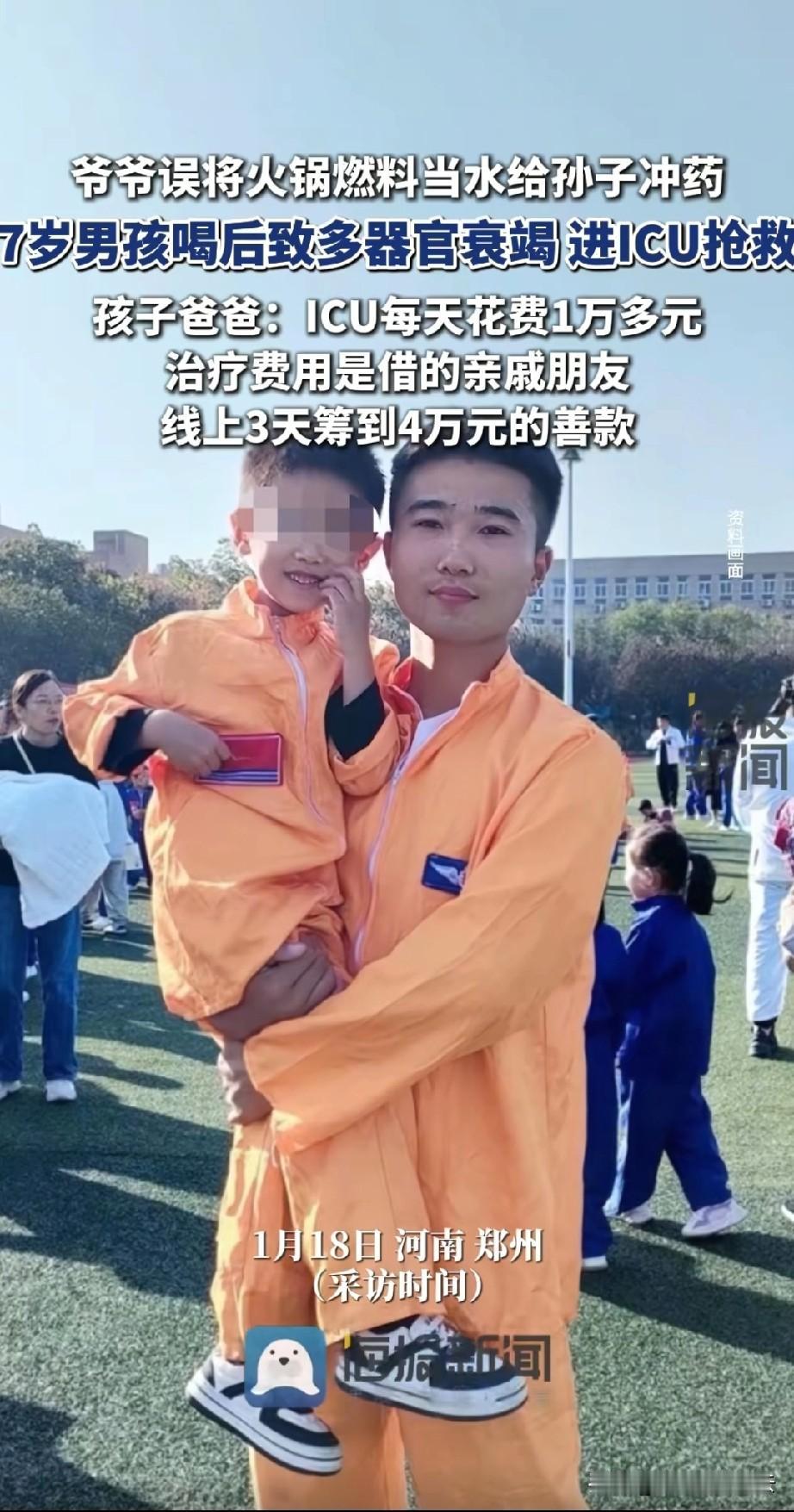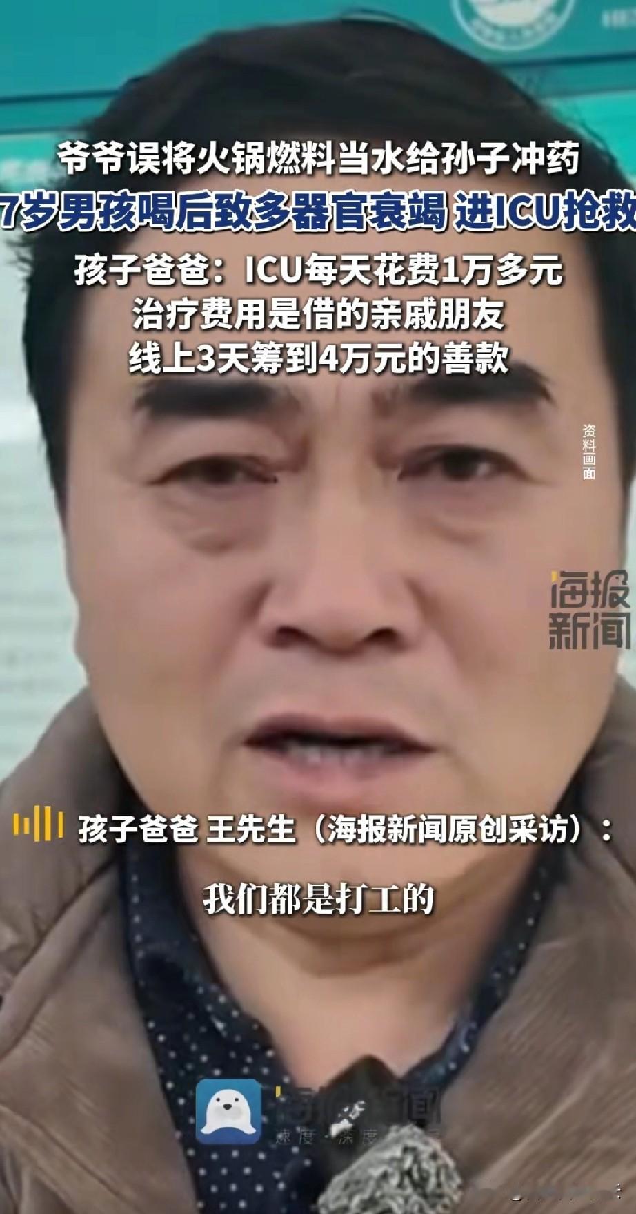 河南误喝火锅燃料的男孩爷爷说,他们家都是打工的,家里也没什么存款。现在孩子在ICU,一天就花费一万多。现在治疗费用都是找亲戚借的。 孩子爸爸说,多谢广大的网友的帮助,他孩子的事情报道后,三天的时间,就筹得善款4万4。有个好心人一下子给他转账1万块。 有网友说,孩子确实挺可怜的。可是一有事就找网友求助,而不是先自己想办法,这样好吗? 有网友质疑,一家人都有工作,难道这些年来就没有存款。看到孩子爸爸、爷爷穿的也不错。不要什么事都让网友筹款,大家忘了豆豆妈妈的事了? 我觉得现如今还是抢救孩子要紧,但是网友说的也不无道理。大家可以帮你度过难关。可是用来给孩子救命的钱还是主要由家长负担。如果真的没钱也要出个证明详单,别让网友的爱心变味。 对于这件事,你怎么看呢?