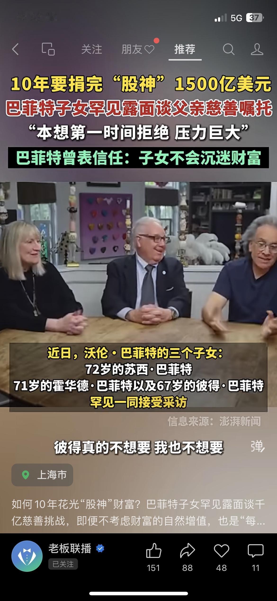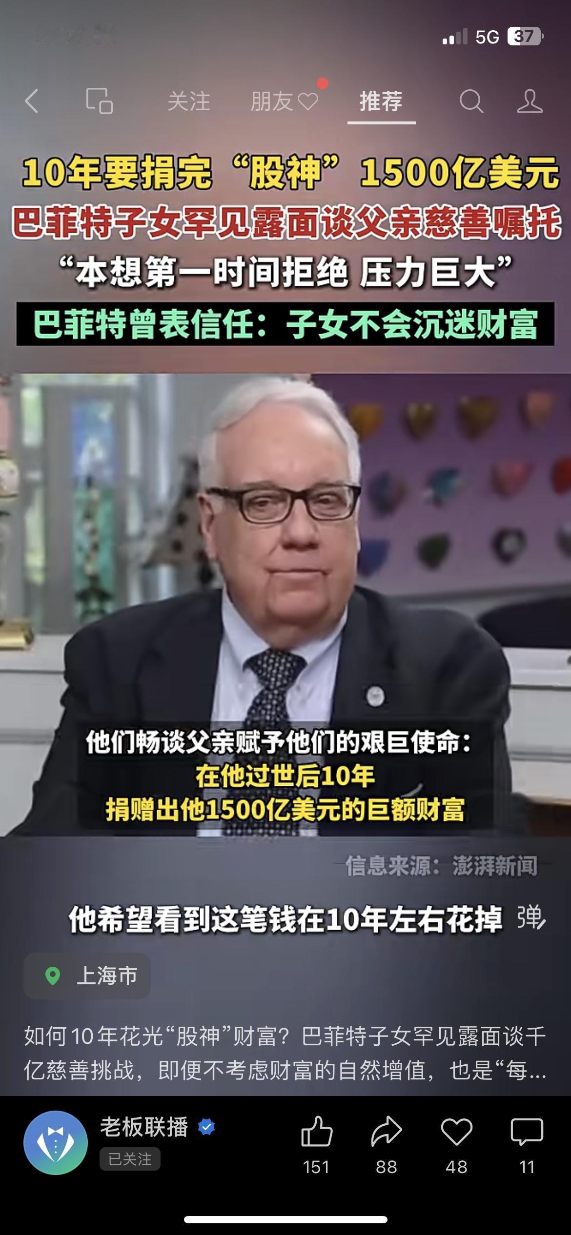 股神狠活!10年捐完1500亿!子女压力山大 巴菲特宣布去世后,99%的财产将交给新慈善基金会,由3个子女负责,要求10年内花光1500亿美元。子女坦言“本想第一时间拒绝”,这笔钱实在太多了,压力巨大。懂的都懂,这哪是慈善,是把千斤重担压给了下一代! 财富的终点不是传承,是让世界变得更好。 如果你有1500亿,会选择全部捐掉,还是留给子女? 巴菲特 慈善