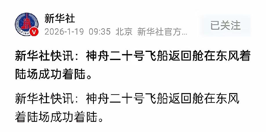 家人们!振奋人心的消息来了! 1月19日清晨,神舟二十号飞船返回舱稳稳降落在东风着陆场,圆满完成征程!神舟二十号飞船 虽然此次是空船返回,但精准的着陆位置已经宣告:全程稳稳当当,万无一失! 还记得之前被太空微小碎片撞出裂纹的舷窗吗?很多人都在担心会不会影响返回?答案来了——完全不用担心! 要知道飞船舷窗可是三层加厚防护,最外层更是专门扛撞击、耐烧蚀的“金钟罩”!区区小裂纹,在高温等离子体的考验面前根本不值一提! 这就是中国航天的硬实力,每一处细节都暗藏乾坤,每一次归来都底气十足!🇨🇳
