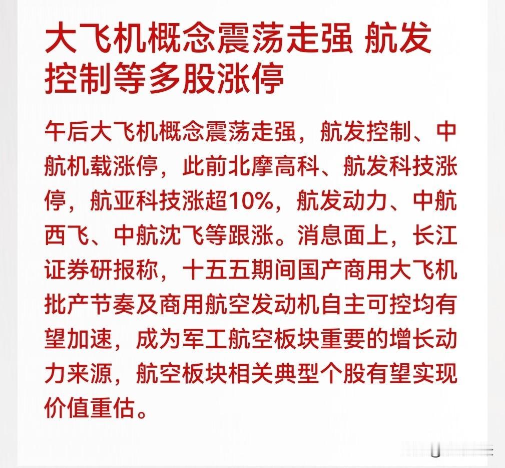 大飞机概念集体暴走!航发控制等多股涨停,背后原因找到了 2026年1月19日下午,A股大飞机概念突然“起飞”! 航发控制、中航机载直线封死涨停板,买都买不进。 北摩高科、航发科技也跟上,早盘就涨停了。 航亚科技更猛,直接涨超10%,快翻倍了! 还有航发动力、中航西飞、中航沈飞这些大块头,也跟着往上冲。 这波大涨不是瞎炒,有机构撑腰! 长江证券最新研报说,“十五五”期间,国产大飞机要加速量产了。 最关键的是航空发动机,以后咱们自己能造,不用看别人脸色。 以前大飞机发动机靠进口,现在自主可控,成本降了,利润空间更大。 机构预测,这会成为军工航空板块的“发动机”,带动整个行业增长。 简单说,这些公司业绩可能要爆发,股价自然要重新算账(价值重估)。 大飞机是国家名片,从设计到制造,全产业链都受益。 今天涨停的这些公司,有的造发动机,有的做机载设备,都是核心环节。 普通股民要注意,概念炒作波动大,别追涨杀跌。 但长期看,国产大飞机从“能飞”到“多飞”,行业前景值得期待。 今天大飞机概念大涨,是政策利好+行业前景的双重刺激。国家科技进步、产业链自主,这才是真底气。虽然股市有波动,但看着“中国制造”越来越强,心里还是挺自豪的!你觉得这波行情能持续多久?