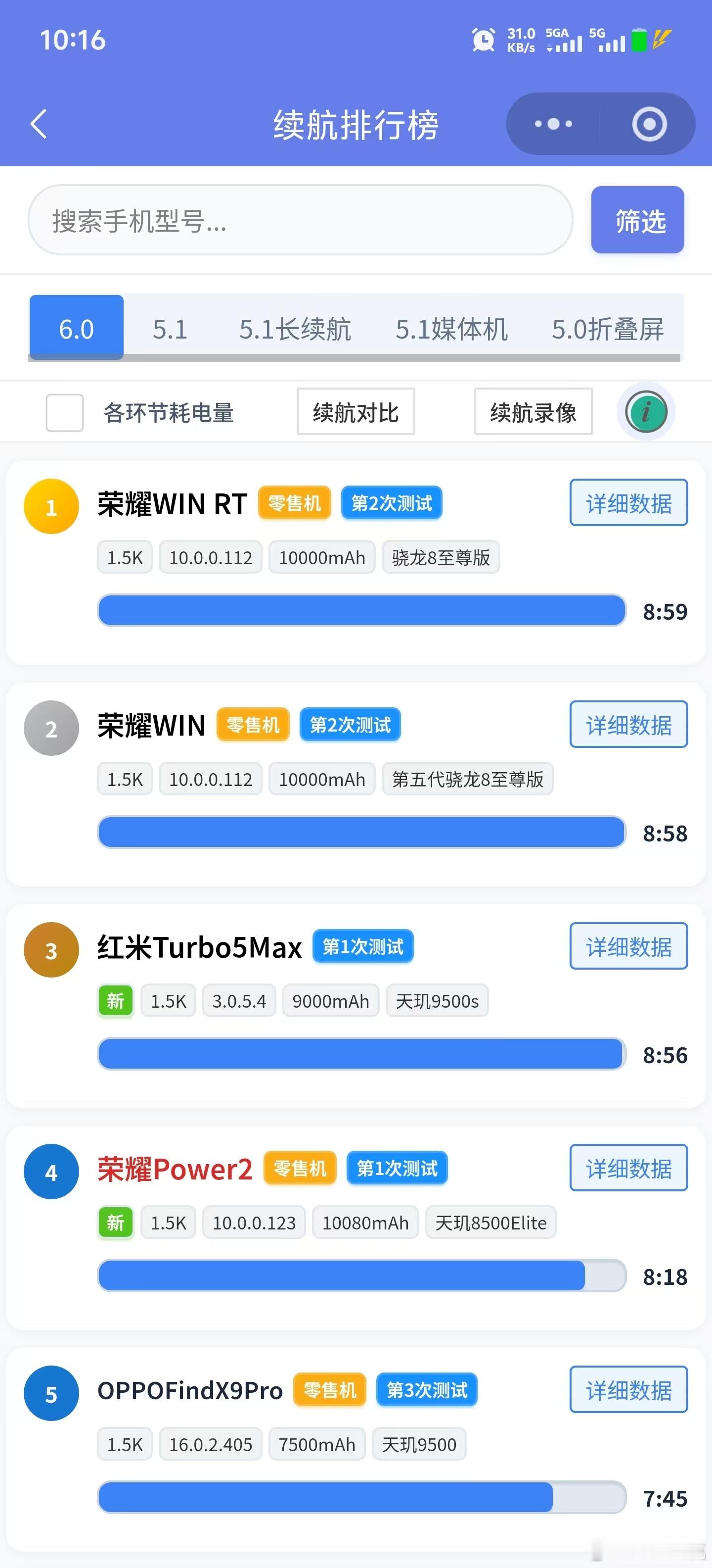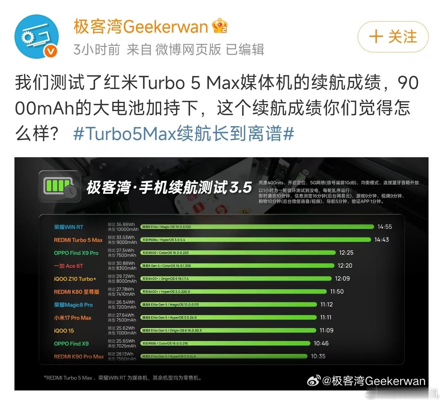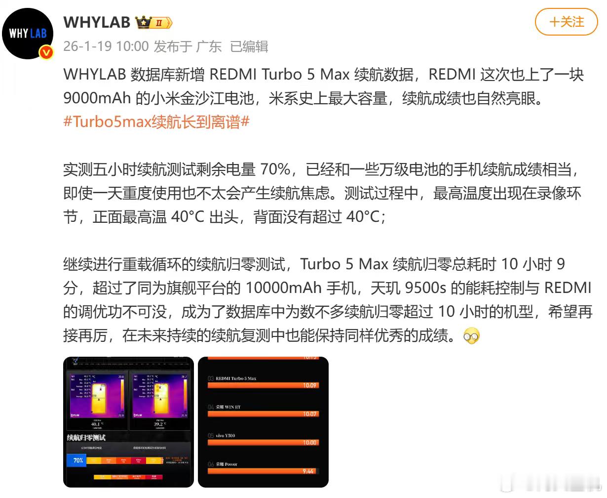 啥叫硬实力,Redmi Turbo 5 Max的9000毫安时电池居然在不少媒体的测试当中与友商搭载骁龙8E+10000毫安时的手机续航基本上一样了,在新评科技的测到死测试当中就差2-3分钟。这水平没得说,现在不仅是拼电池,还得拼优化能力了。Turbo 5 Max的天玑9500S,加上这块小米目前最大的9000毫安时电池,确实在2.5K档位上很有实力。当然以后比续航也不止是比谁电池大,还要比比谁的优化好。