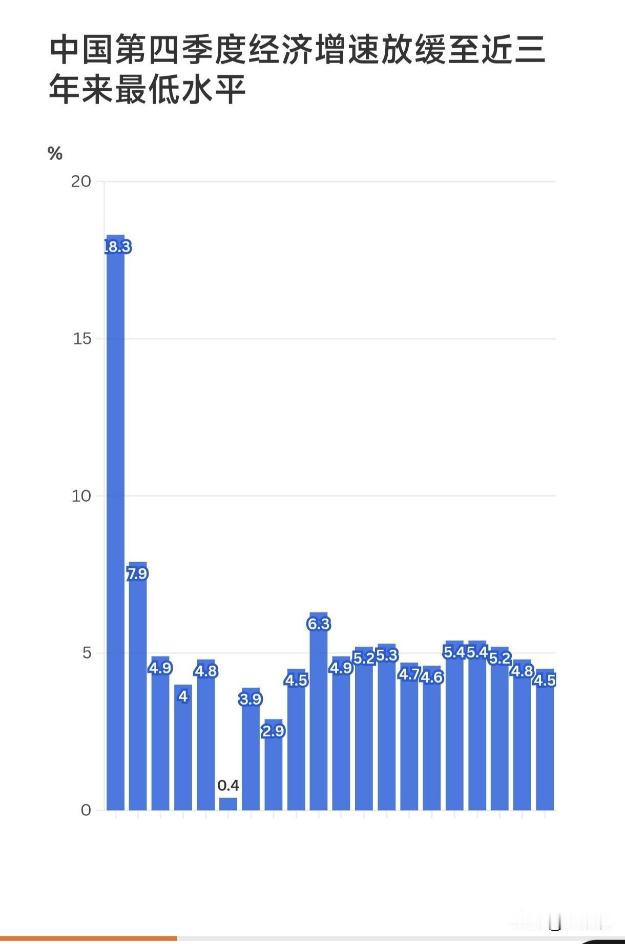 外媒财经网报道:中国第四季度经济增长放缓至4.5%,为近三年来最低,因消费低于预
