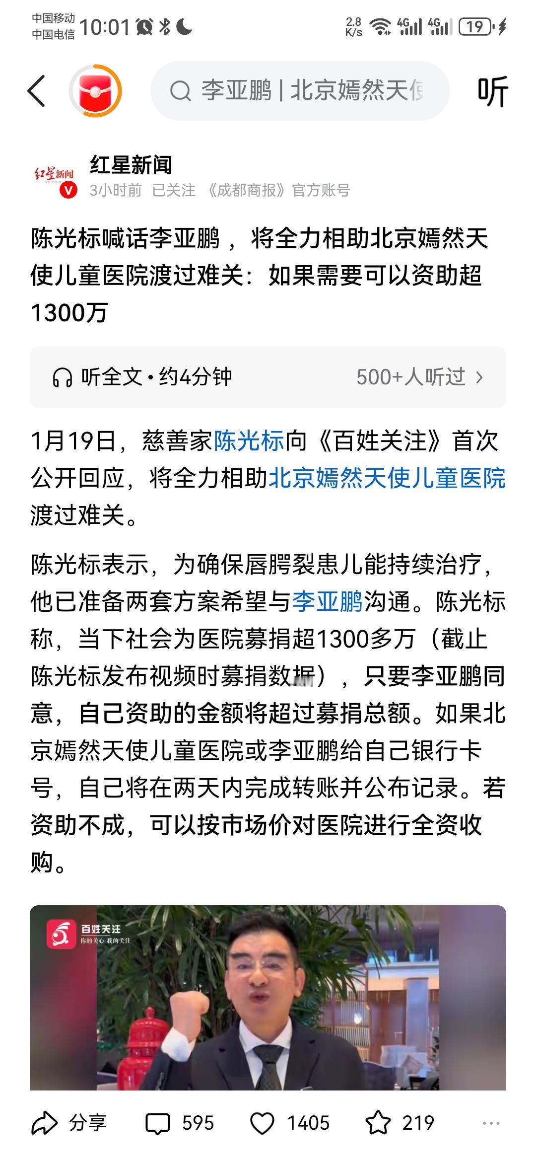 陈光标终于放话说要支持李亚鹏的嫣然天使儿童医院了!1月19日,陈光标通过社交媒体发声,说将全力支持李亚鹏,目前社会募捐总额1300多万,他说只要李亚鹏同意,他的捐款总额将超过募捐总额!而且还会在两天之内打款完毕,并向全社会公布银行流水信息。 与此同时,陈光标还说,如果这样的捐赠方式遇到问题不能成功,那么他也可以按照市场价,直接全资收购嫣然天使儿童医院,继续将这家医院运营下去。 值得注意的是,在这之前,陈光标还发了一个视频,在那个视频里面他也说要帮助李亚鹏,但提了一个条件,想让李亚鹏请王菲开一场演唱会。这个视频引起了网友们的争议,觉得陈光标虽然捐赠行为是好的,但是提这么一个条件不免有些强人所难,并不合适。 后面陈光标应该也是听进去了广大网友们的建议,第二次发声时就没有提这件事了,而是直接表态全力支持! 不得不说,虽然陈光标高调慈善的行为有些争议,但他真的是拿出了真金白银在做慈善,不管从什么角度看,这都是好样的,标哥值得我们所有人竖起一个大拇指!如果这一次标哥的捐款能够成功到账,那么嫣然天使儿童医院的危机自然也就能更加顺利的渡过,未来会有更多孩子得到治疗,则无论如何都是一件大好事!