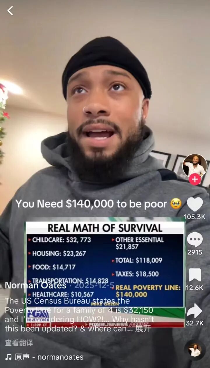2025年11月美国银行研究所报告显示,约1/4美国家庭将95%以上收入用于购买必需品。