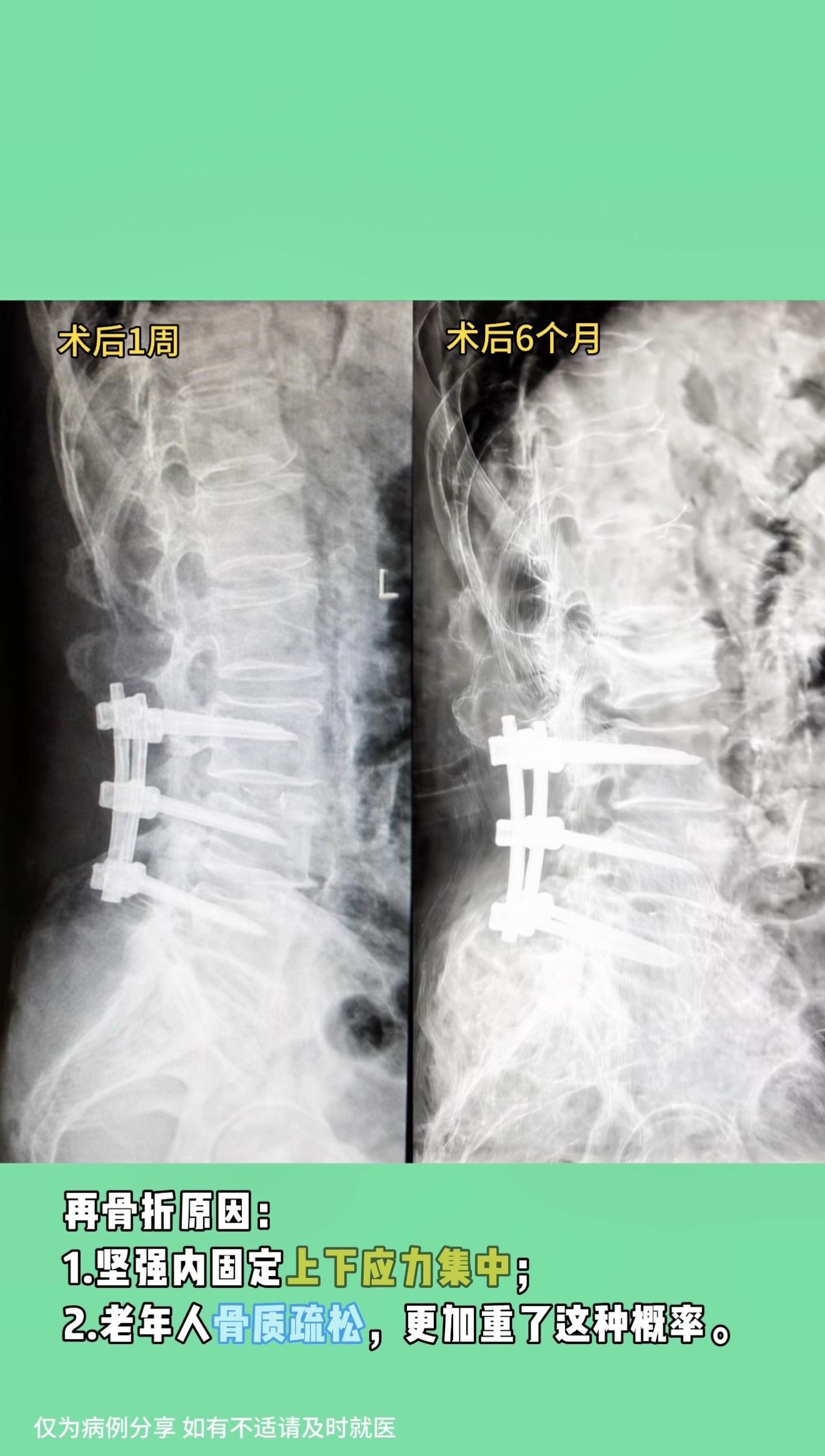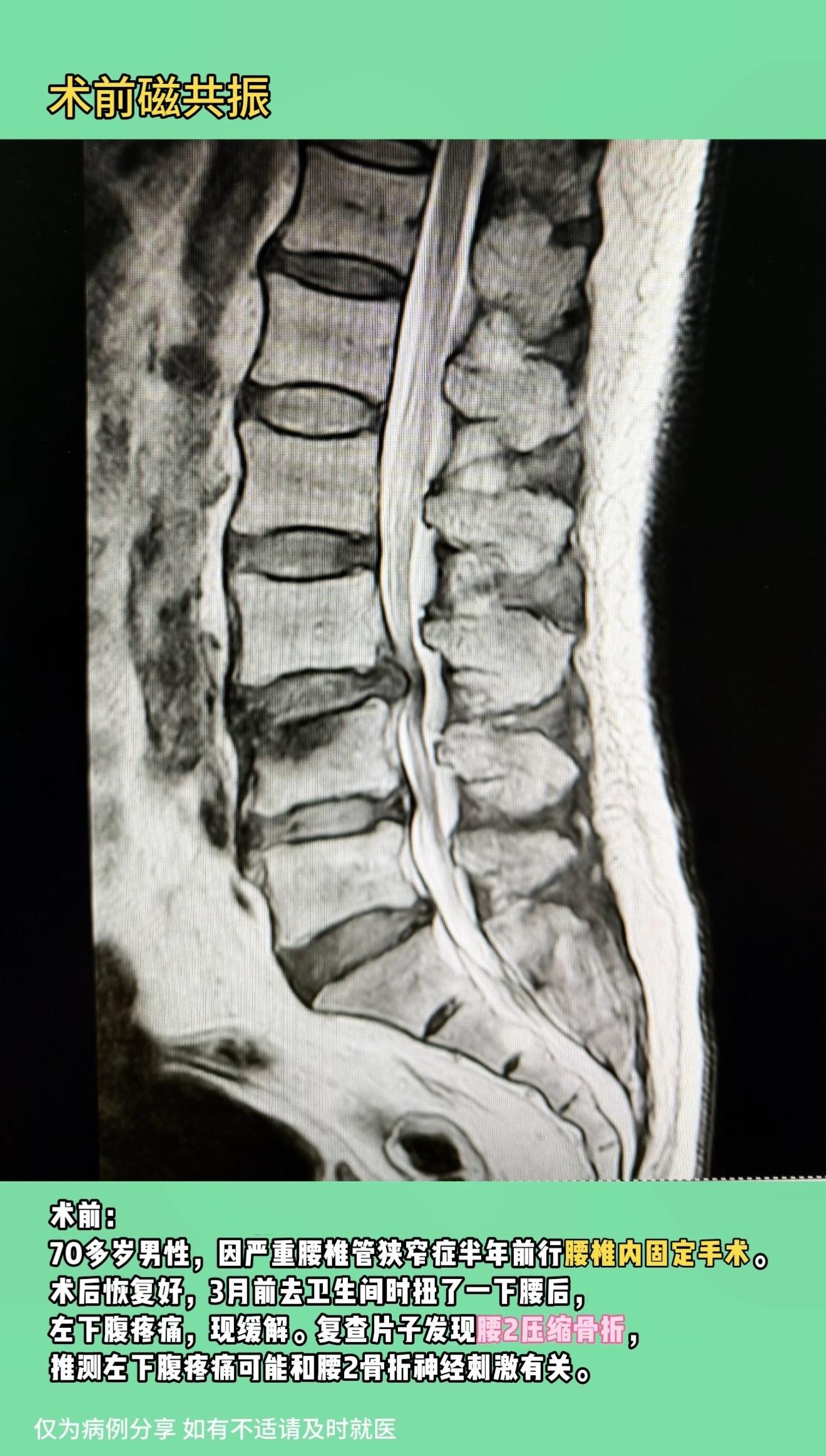 老年腰椎管狭窄症。老年腰椎管狭窄患者越来越多,很多伴有腰椎不稳定需要内固定,但坚强的内固定也带来很多问题,这是摆在患者和医生面前共同的难题。我们该如何选择? 真实病例分享: 70多岁男性,因严重腰椎管狭窄症半年前行腰椎内固定手术。术后恢复好,3月前去卫生间时扭了一下腰后,左下腹疼痛,现缓解。复查片子发现腰2压缩骨折,推测左下腹疼痛可能和腰2骨折神经刺激有关。 再骨折原因:1.坚强内固定上下应力集中;2.老年人骨质疏松,更加重了这种概率。