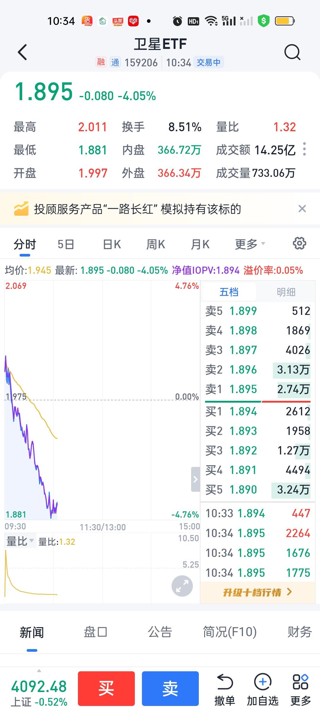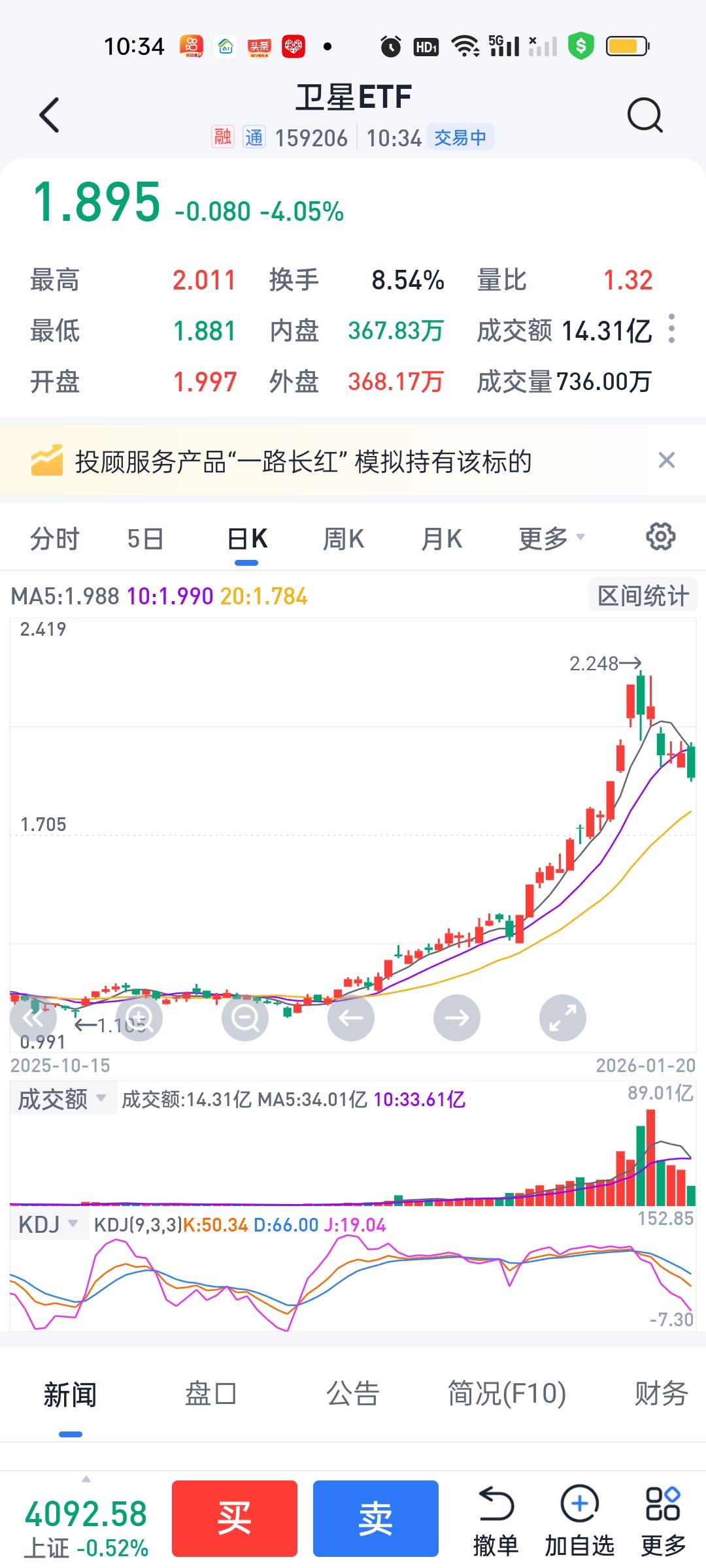 卫星ETF的走势和之前预测的是一模一样的,1.884--1.910这个缺口是必补的,今天成功回补,在1.884这里挂着就不会错。最低点来到1.881,顺利买进没有问题。不知道大家今天有没有操作卫星ETF呢?