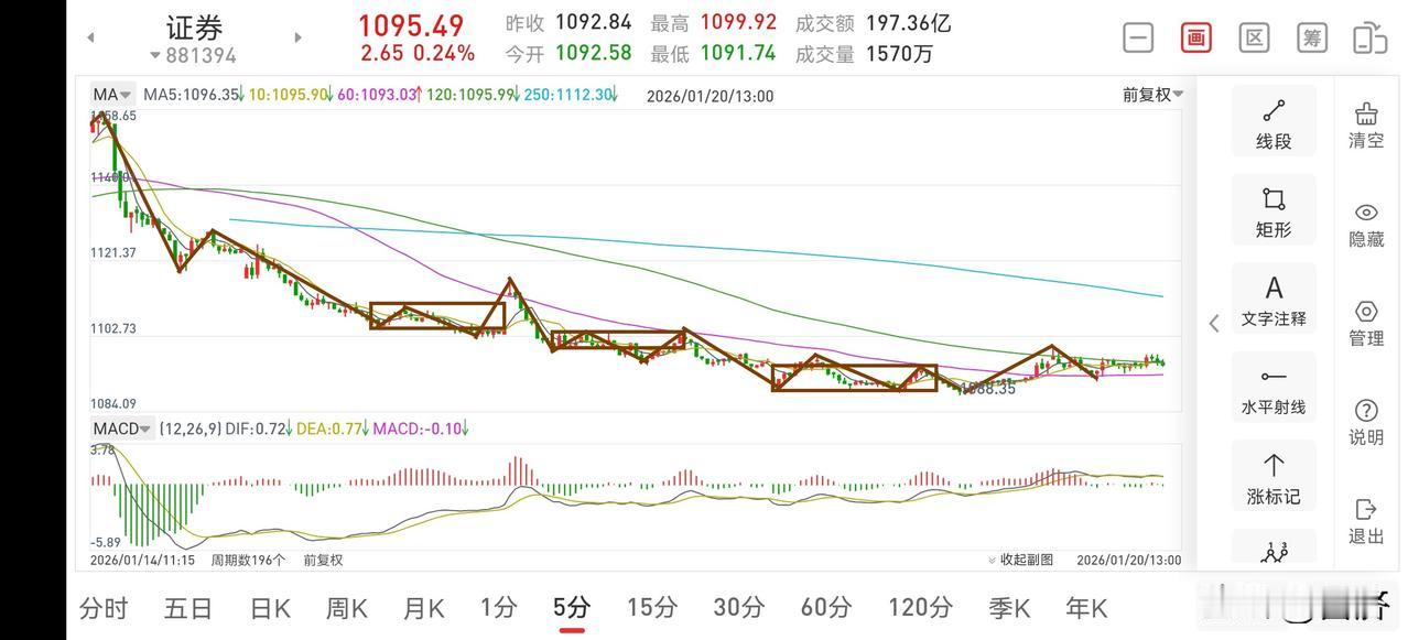 聊聊证券板块(2026.1.20) 今天证券板块经过一段时间的调整后,空头释放殆尽,周线量价关系的背离也得到了修复,虽然今天上午反弹并不强劲,但量价关系正常,走势并无异常,此处可考虑继续耐心持股待涨即可。 1.从30分钟图一上看,这段30分钟级别的下跌虽然已经完成,但下跌较深,那么它的反弹注定是要积蓄力量,逐步向上攀升的,因为目前都在多周期均线以下,上方有众多套牢盘,需要去逐步化解,所以上涨不是一蹴而就的,反弹目标位先看进入上方中枢区间。 2.从5分钟图二上看,在走完三个中枢以后,才有了今天的反弹,符合昨天的预期。目前已站上最后一个中枢的上沿,并且回踩没有破新低,所以在5分钟上是可以考虑看多的。 总之,此处并没有大的风险,无忧。至于商业航天板块,个股已出现分化,只有优质标的有进一步向上拓展的空间,可考虑继续持股待涨,纯粹靠概念炒作的,可考虑出局。证券板块动态 股市观察与分享