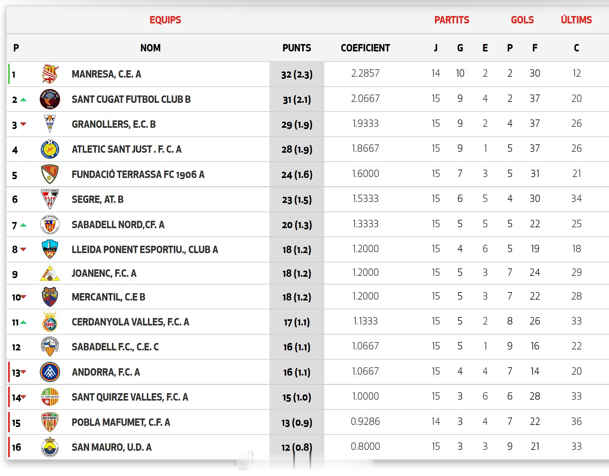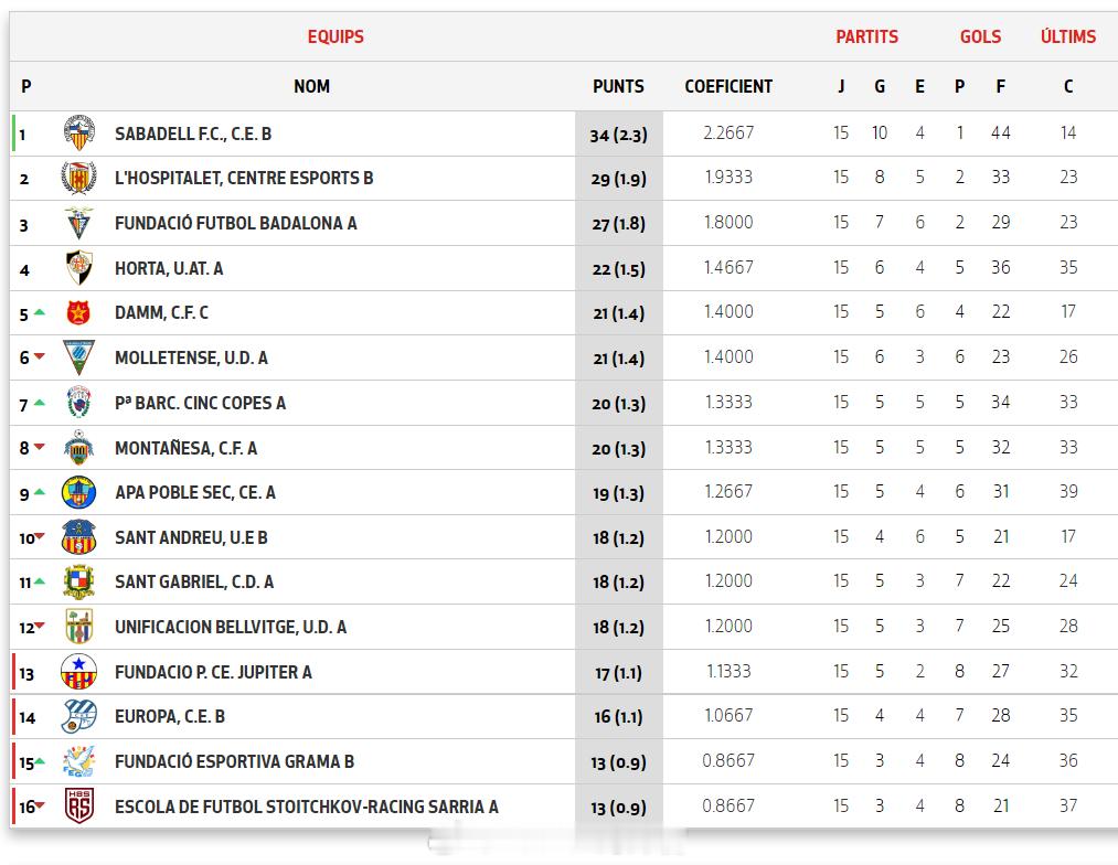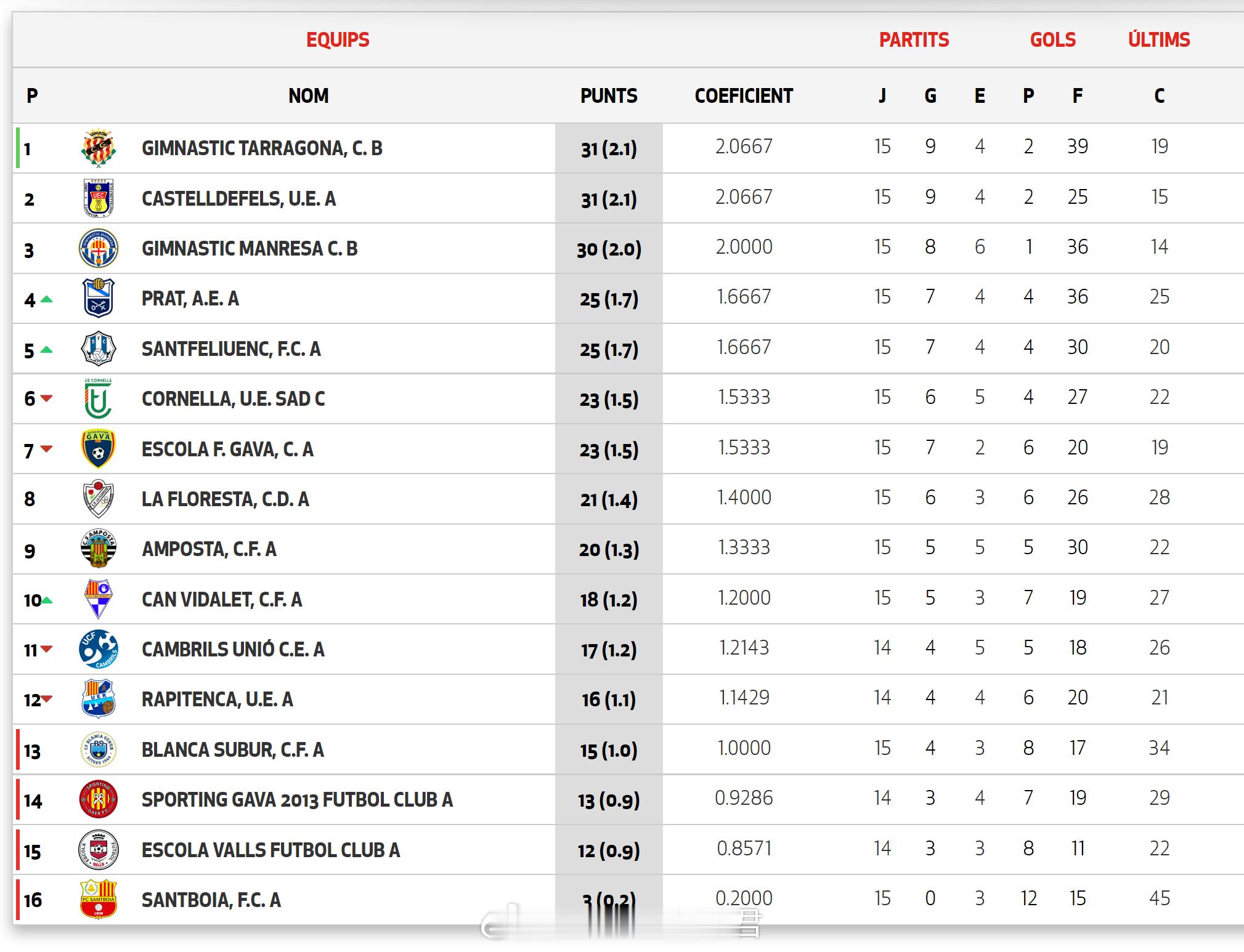 留洋-积分榜 西班牙加泰罗尼亚U19优选联赛(3)联赛赛程过半,赫罗纳U19C、萨瓦德尔U19B、曼雷萨U19A、塔拉戈纳体操U19B分列各组第一。中国球员出场情况和球队成绩如下:第2组◉ 第1名:萨瓦德尔 B 球队10胜4平1负、进失球44-14,积34分- 韩德宝(08) 进入大名单6次、首发0次;1月离队◉ 第3名:巴达洛纳基金会 A球队7胜6平2负、进失球29-23,积27分- 何浩源(09) 进入大名单13次、首发7次,进1球;◉ 第5名:达姆 C战绩5胜6平4负、进失球22-17,积21分- 汪修昊(09) 进入大名单12次、首发7次;◉ 第8名:蒙塔涅萨 A战绩5胜5平5负、进失球32-33,积20分- 薛钦元(07) 进入大名单9次、首发4次;- 曲冠锡(08) 进入大名单2次、首发0次;◉ 第10名:圣安德鲁 B战绩4胜6平5负、进失球21-17,积18分- 戴宥哲(09) 进入大名单15次、首发14次;◉ 第14名:欧罗巴 B战绩4胜4平7负、进失球28-35,积16分- 吕孟洋(09) 进入大名单15次、首发7次,进3球;第3组◉ 第4名:圣胡斯特竞技 A战绩9胜1平5负、进失球37-26,积28分- 孙皓洲(08) 进入大名单14次、首发11次;- 韩德宝(08) 进入大名单1次、首发0次;1月加盟第4组◉ 第7名:加瓦足校 A战绩7胜2平6负、进失球20-19,积23分- 林希睿(07) 进入大名单13次、首发2次;◉ 第10名:坎比达莱特 A战绩9胜1平5负、进失球37-26,积18分- 王子豪(08) 进入大名单12次、首发0次;- 郭吉来(09) 进入大名单4次、首发0次;12月加盟——————————————————西班牙男足联赛体系概览(2025/26赛季新版) 网页链接