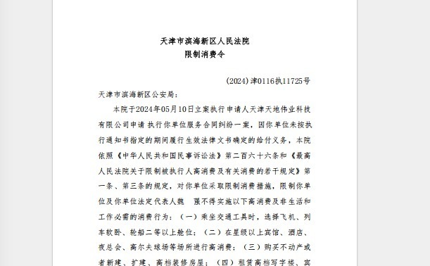 2024年10月29日,滨海新区法院针对滨海新区公安局作出《天津滨海新区人民法院限制消费令》。