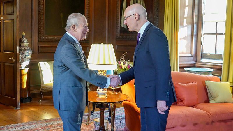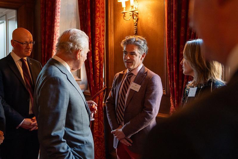 查尔斯三世国王 【news】查尔斯国王在首席-部-长JohnSwinney 陪同下,在荷里路德宫举办了一场苏格兰投资论坛的招待会,庆祝苏格兰的创业精神和强大的创新生态系统。他们还会见了玫瑰银行酒厂的代表——这是当地的成功案例——并有机会品尝了一杯威士忌。