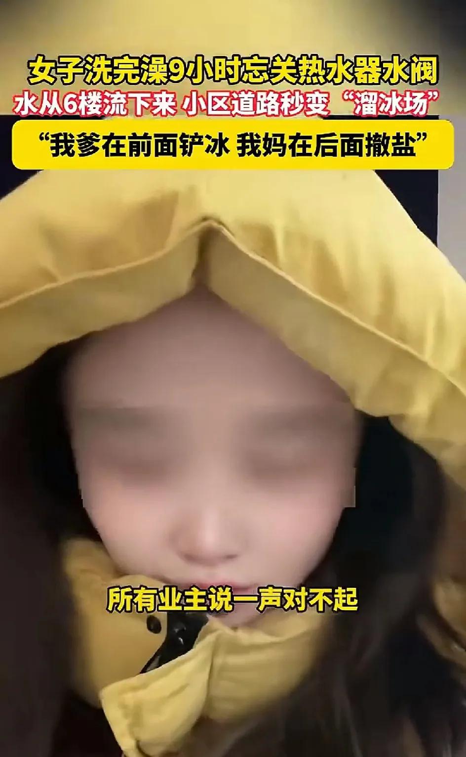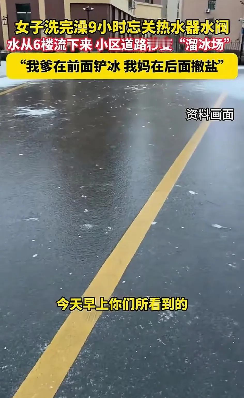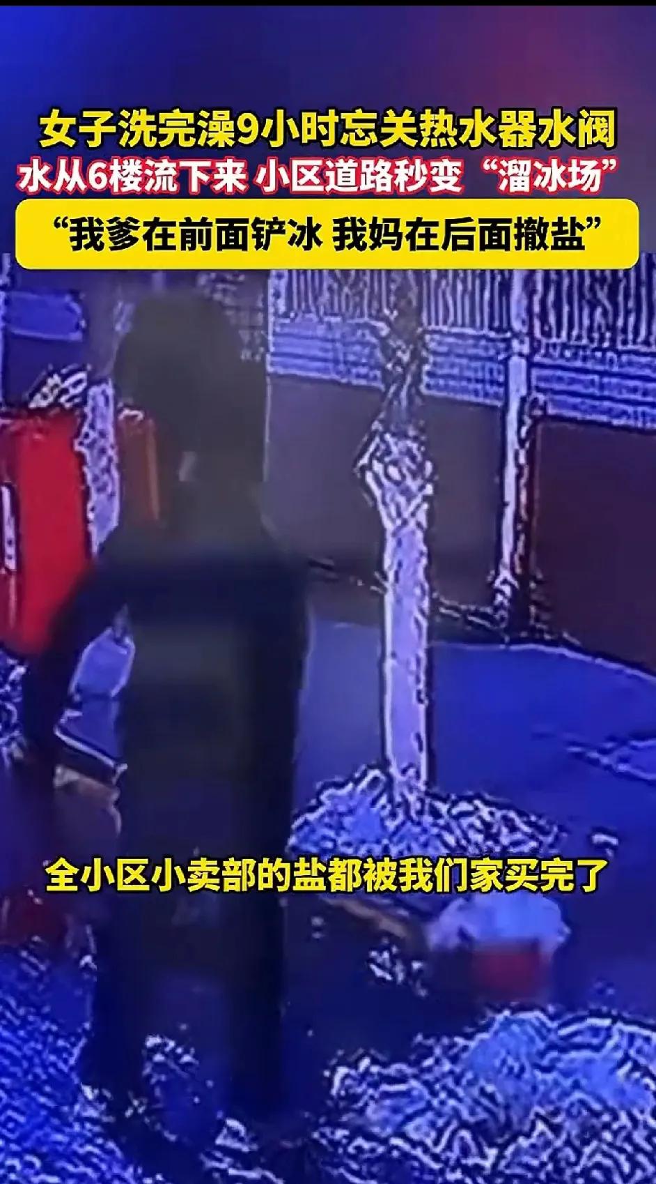 1月19日,甘肃兰州一女子,洗完澡忘了关太阳能热水器的开关。结果让水流了9个小时从6楼流到小区。大冬天的小区结了冰,成了溜冰场。她的爸爸5点多就起来开始铲冰,她的妈妈在后面撒盐。她忙着在小区里向业主道歉。说影响到小区其他业主的生活了,郑重说声对不起。小区里的盐也被她妈妈买光了,如果今天有其他业主买不到盐的她也说一声抱歉。