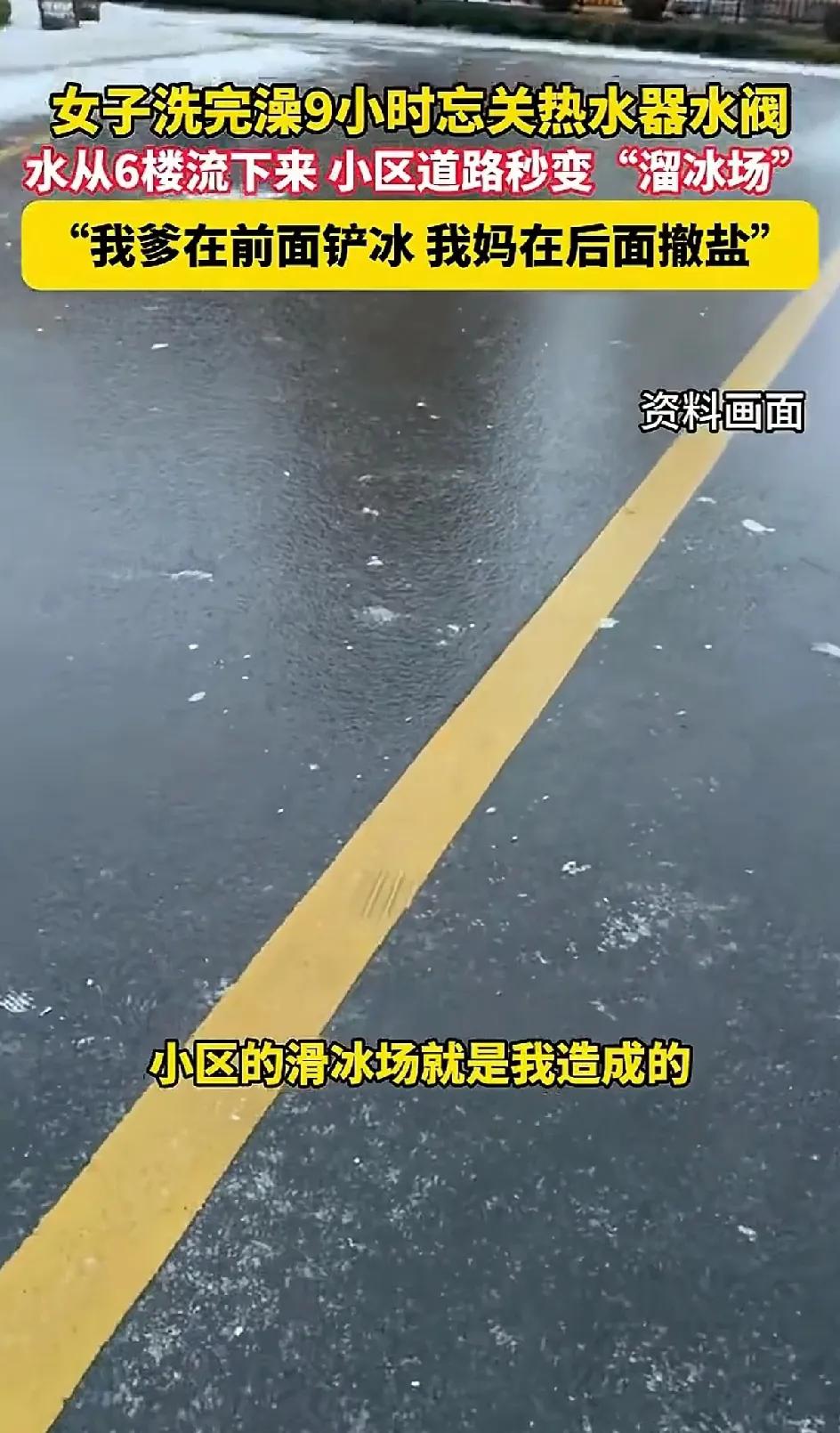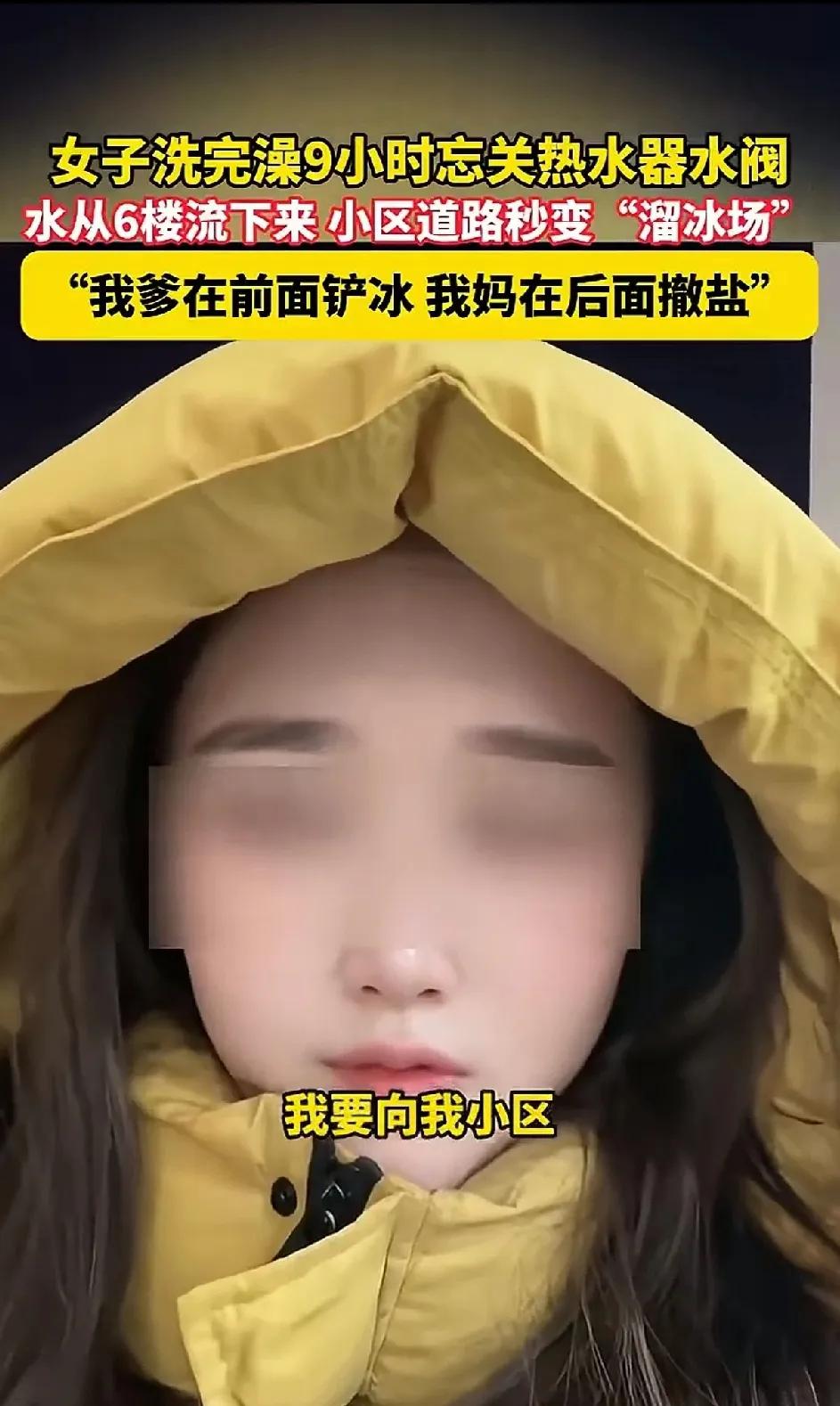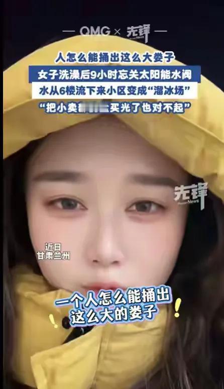 1月19日,甘肃兰州一女子,洗完澡忘了关太阳能热水器的开关。结果让水流了9个小时从6楼流到小区。大冬天的小区结了冰,成了溜冰场。她的爸爸5点多就起来开始铲冰,她的妈妈在后面撒盐。她忙着在小区里向业主道歉。说影响到小区其他业主的生活了,郑重说声对不起。小区里的盐也被她妈妈买光了,如果今天有其他业主买不到盐的她也说一声抱歉。