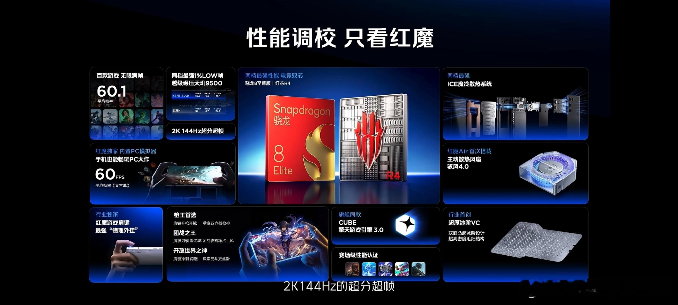 红魔11air 性能方面依然很稳,红魔CUBE擎天游戏引擎3+红魔自研电竞芯片红芯R4,适配多款热门,同时导热散热双管齐下的散热系统,不用担心玩游戏时手机烫手