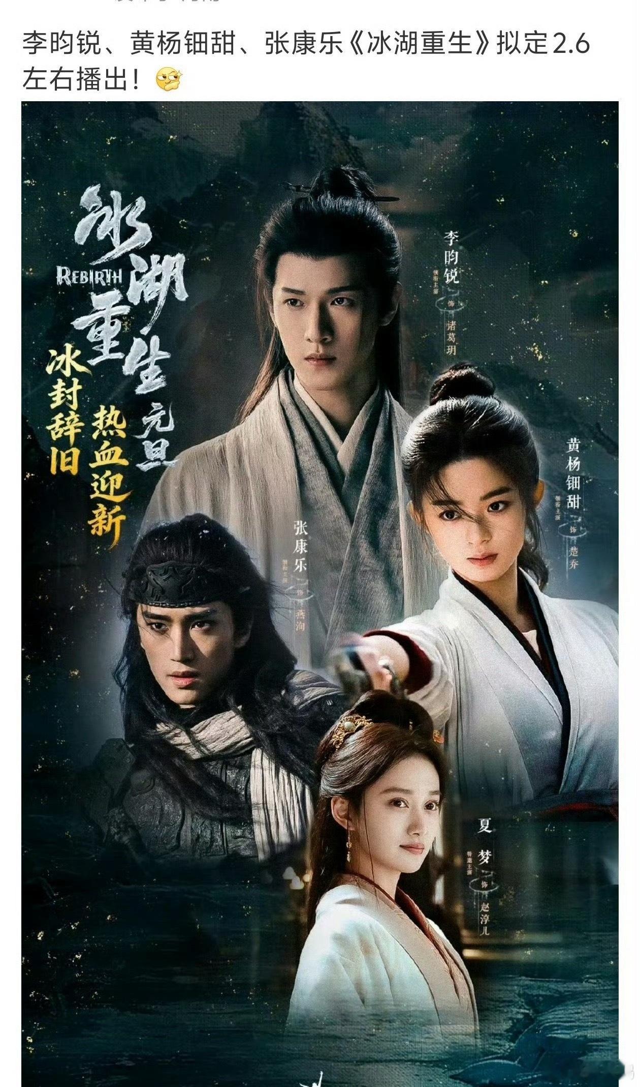 李昀锐黄杨钿甜冰湖重生大寒营业李昀锐饰演的诸葛玥以寒甲战损妆为主视觉,冰湖挣扎画面突出角色隐忍与破碎感,被观众称为“雪中建模脸”;黄杨钿甜饰演的楚乔红衣执剑立于冰湖裂痕之上,眼神凌厉呼应“破冰新生”剧情线;张康乐饰演的燕洵雪中策马镜头展现雷霆气势,暗喻权力野心与宿命对抗。热烈庆祝冰湖重生大寒营业