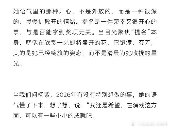 杨紫2025年最开心的事杨紫过去一年最开心的事是提名白玉兰 白玉兰提名成为杨紫2025年高光时刻,作为首位两度凭古偶入围的90后,这份认可远超奖项本身。