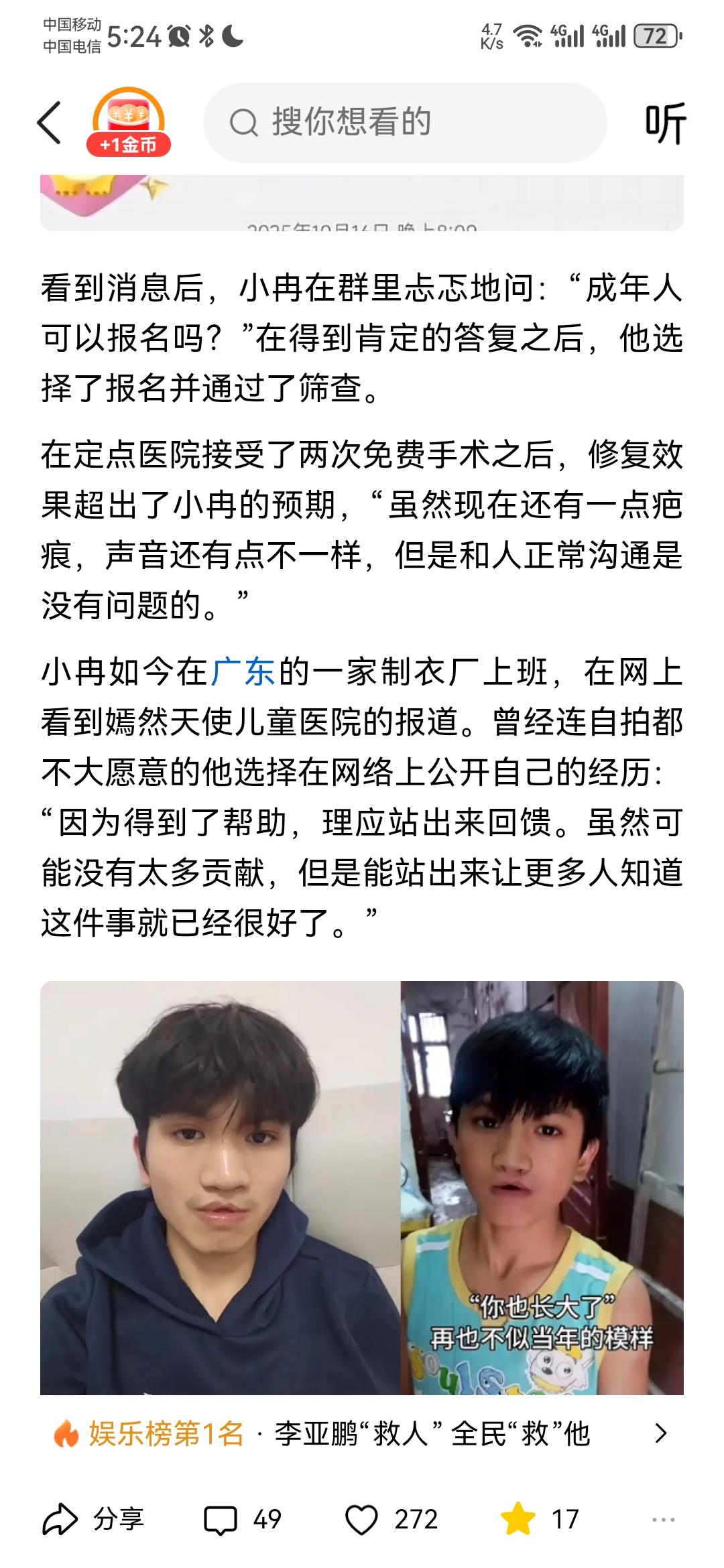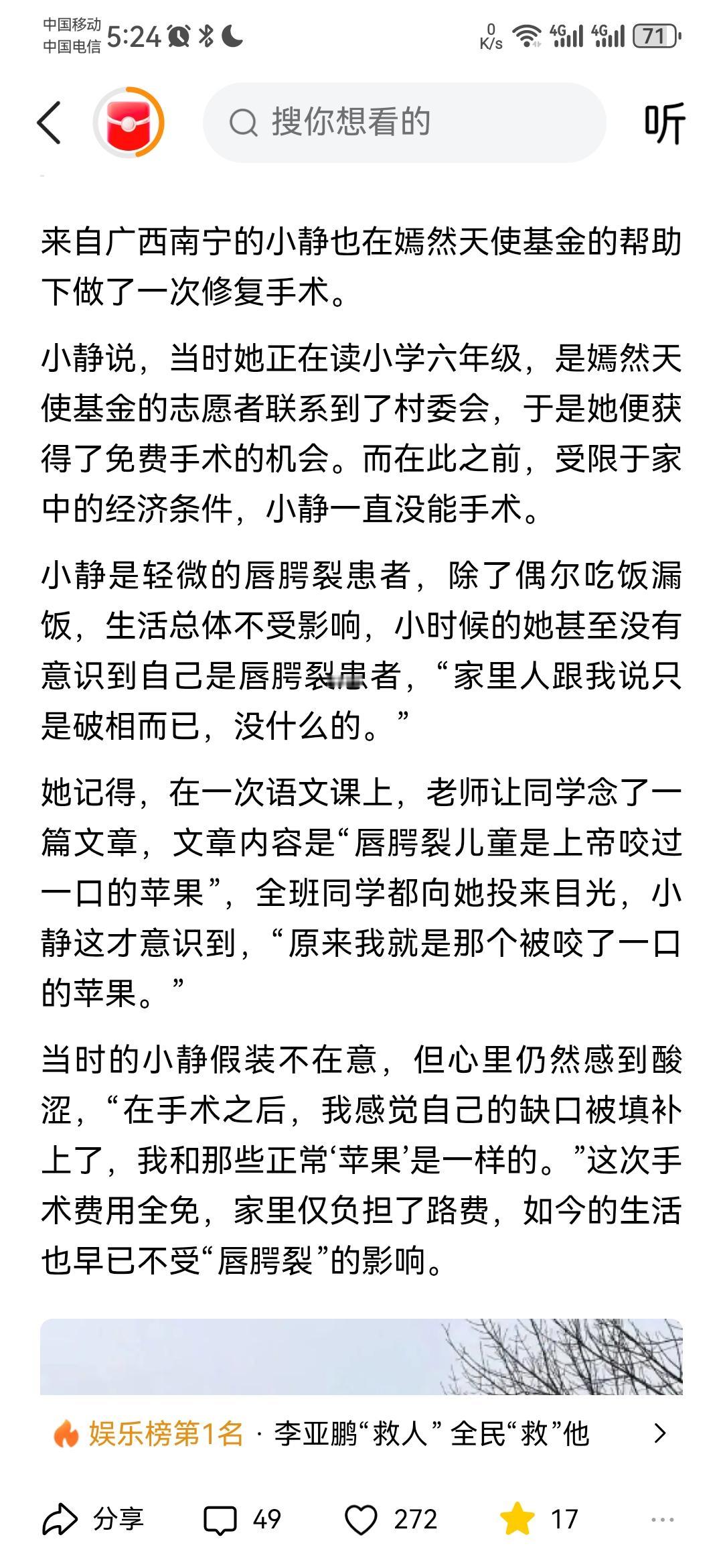 嫣然天使儿童医院事件发酵后,1月20日,《大河报》亲自采访了几个曾在嫣然天使儿童医院接受诊治的患者,得到的信息令人震撼。 一个叫做“浠水胜仔”的患者说,他得了先天性唇腭裂,但是因为治疗费用巨大,因此只得无奈停止治疗。偶然得知嫣然天使儿童基金的事情,抱着试一试的心态去治疗了,结果整个过程下来,包括路费、伙食费、住宿费,加起来竟然只花了1000多块钱。 还有一位来自贵州铜仁的“小冉”,他小时候自费治疗过几次,但效果都不理想,后来在医生推荐下知道了嫣然天使基金。他那个时候已经成年,因此心中很忐忑,不知道成年人是否也能够得到资助。没想到即便是成年人,嫣然天使基金也会资助,让他免费治疗,接受了两次免费手术,最后效果非常好。 等等,等等,还有很多其他案例。 整个看下来,笔者不由得震撼了,嫣然天使儿童基金是真的在脚踏实地做实事,免费治疗了太多先天唇腭裂患者,即便是成年人也会帮忙资助手术,在李亚鹏、王菲的带领下,它就这样默默无闻运行了十余年,不知道给多少人带去了希望! 这是我今年以来,看到的最令人感动的一个新闻,这个时候不由得在想,我们社会上或许也还有许多其他类似嫣然天使儿童基金这样的组织,这个时候也在某一个地方,默默的、低调的,做着这些令人感动的事情,他们没有说话,但是他们的伟大一定会被那些接受过帮助的人们永远铭记。
