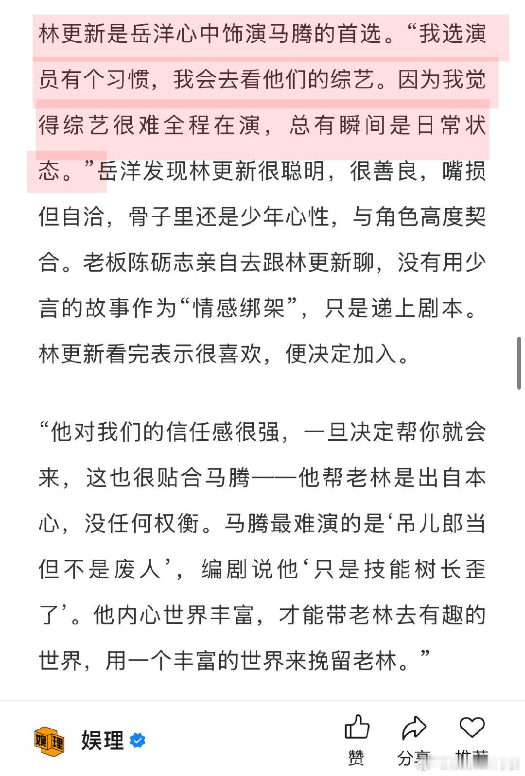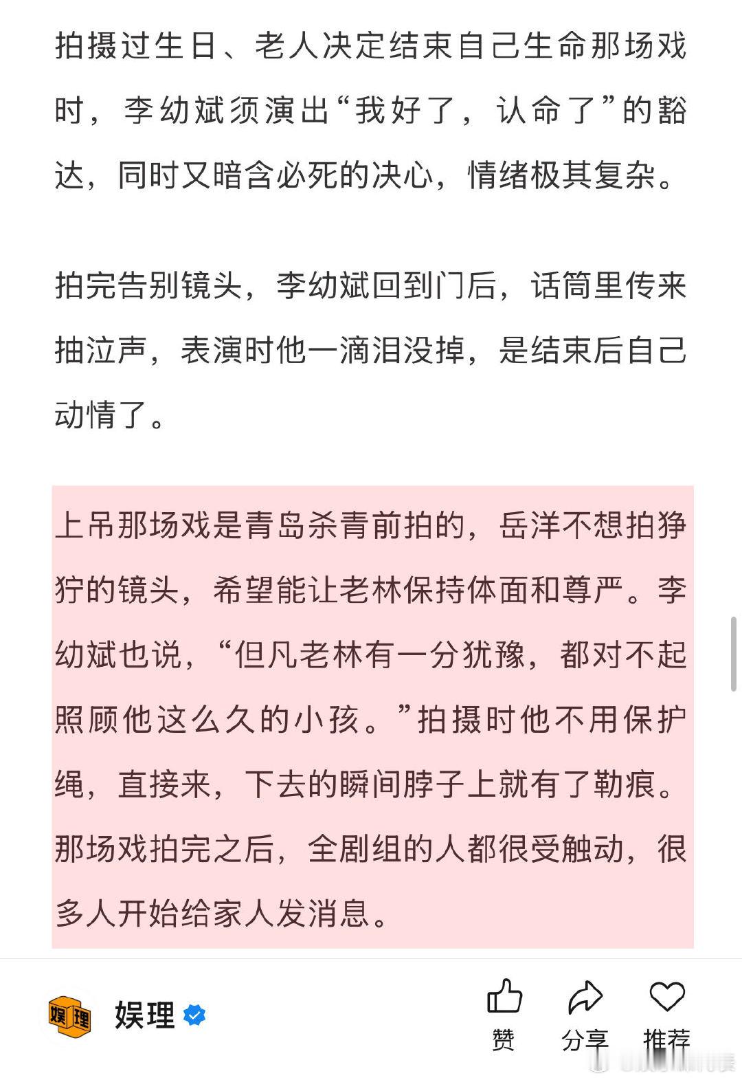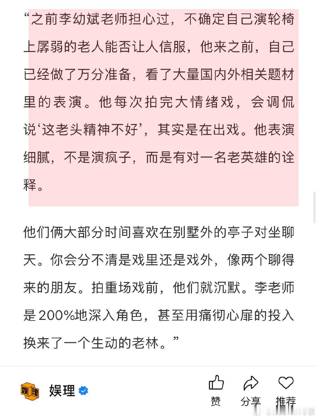 一部编剧遗作的诞生幕后 马腾导演看综艺选中林更新 《马腾你别走》导演岳洋谈选角李幼斌:“之前李老师担心过,不确定自己演轮椅上孱弱的老人能否让人信服,他来之前,已经做了万分准备,看了大量国内外相关题材里的表演。他每次拍完大情绪戏,会调侃说‘这老头精神不好’,其实是在出戏。他表演细腻,不是演疯子,而是有对一名老英雄的诠释。娱理独家↓