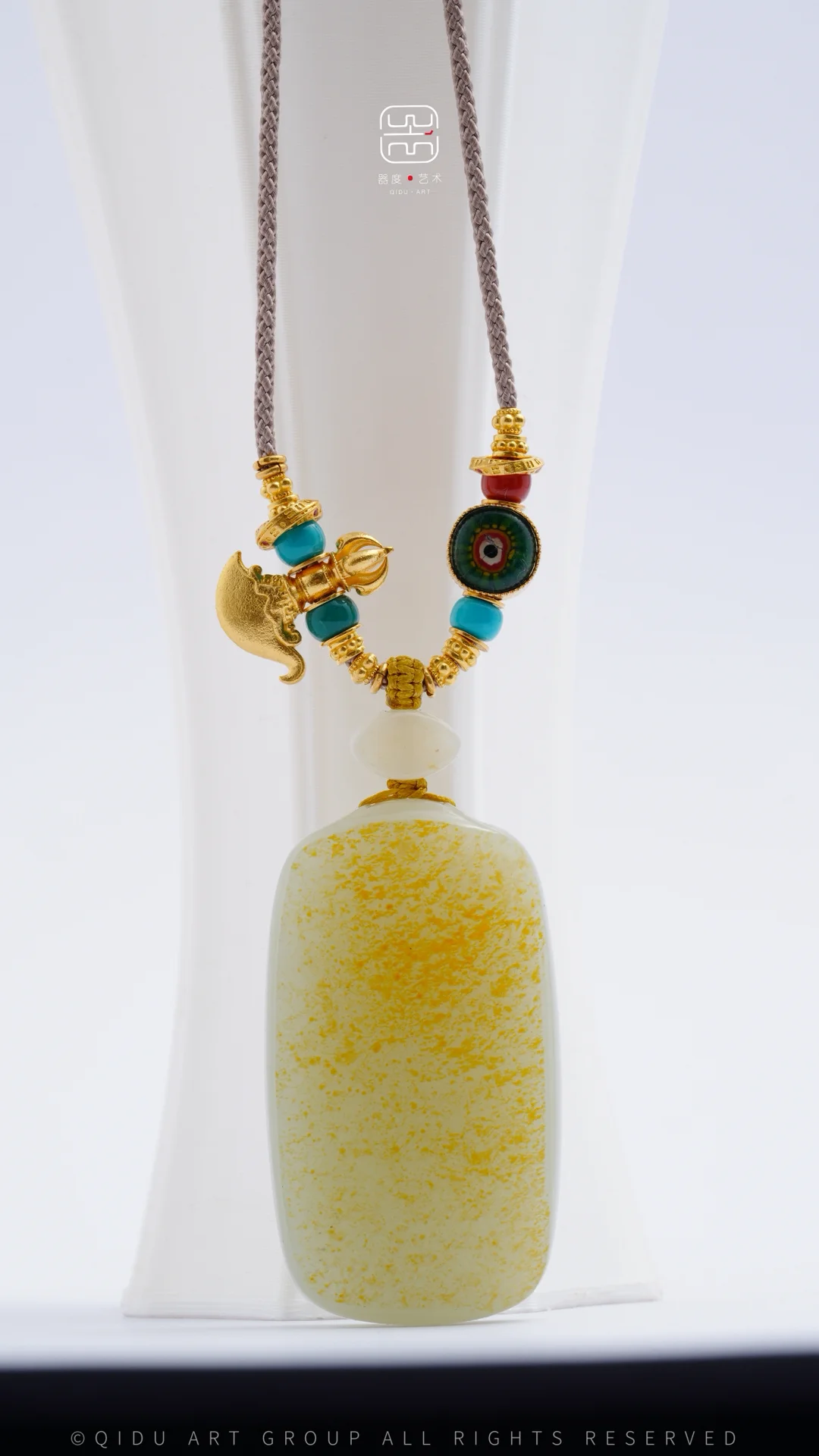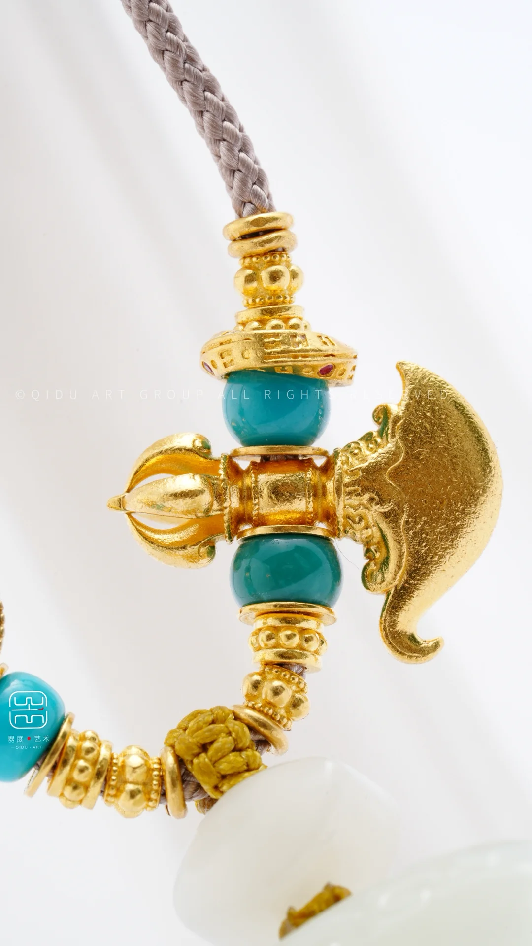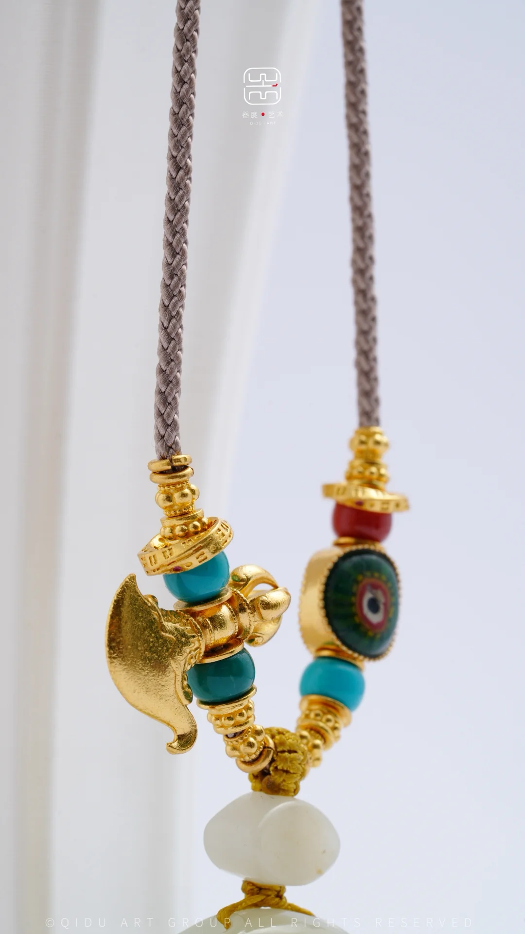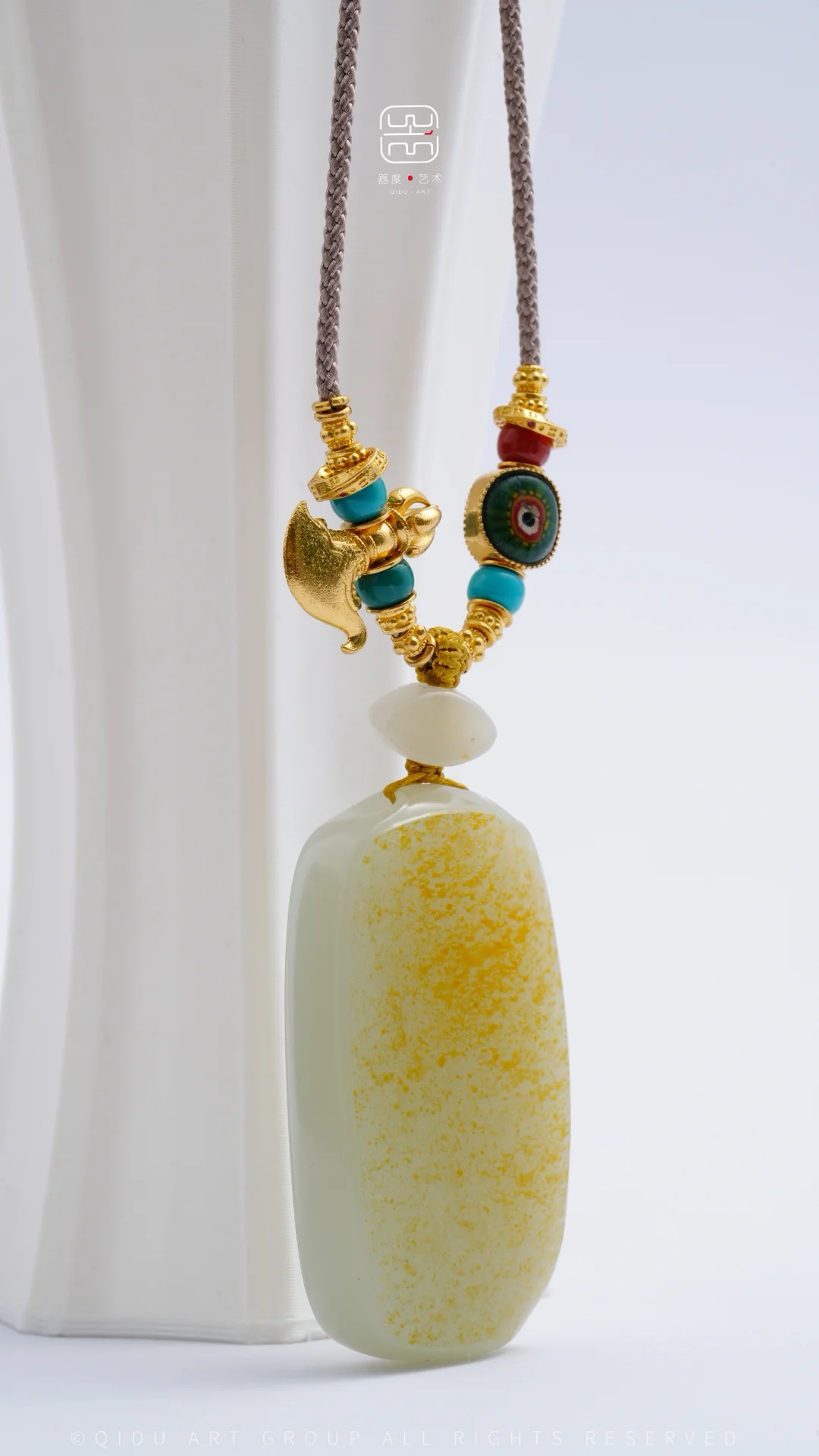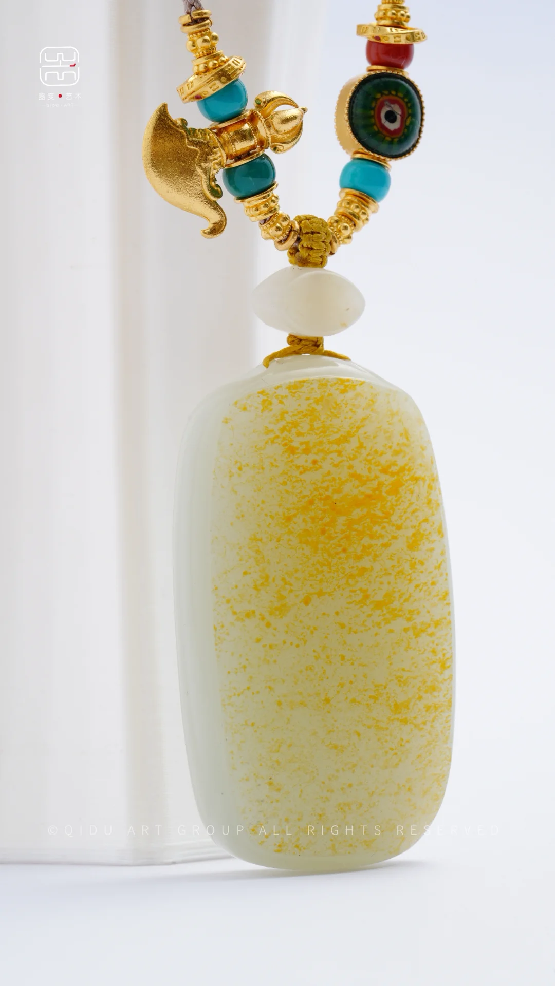 「客定系列」 籽料无事牌锁骨链 一块很漂亮的洒金皮 锁骨链的设计遵循相得益彰的效果 搭配足金配饰 足金钺刀 战国老琉璃 松石玉化蓝高瓷绿…. 好玉配好设计[棒R]